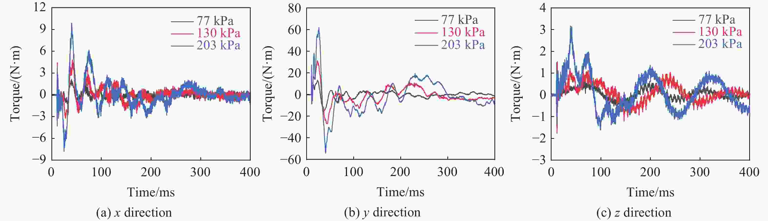 冲击压力/kPa 颈部力最大值/N x方向 y方向 z方向 77 340±22 30±5 340±37 130 600±5 50±1 660±14 203 950±2 80±6 970±78 表 6 不同强冲击环境下颈部的扭矩最大值