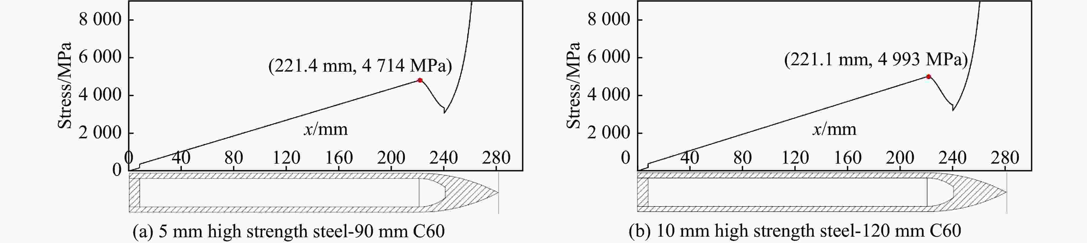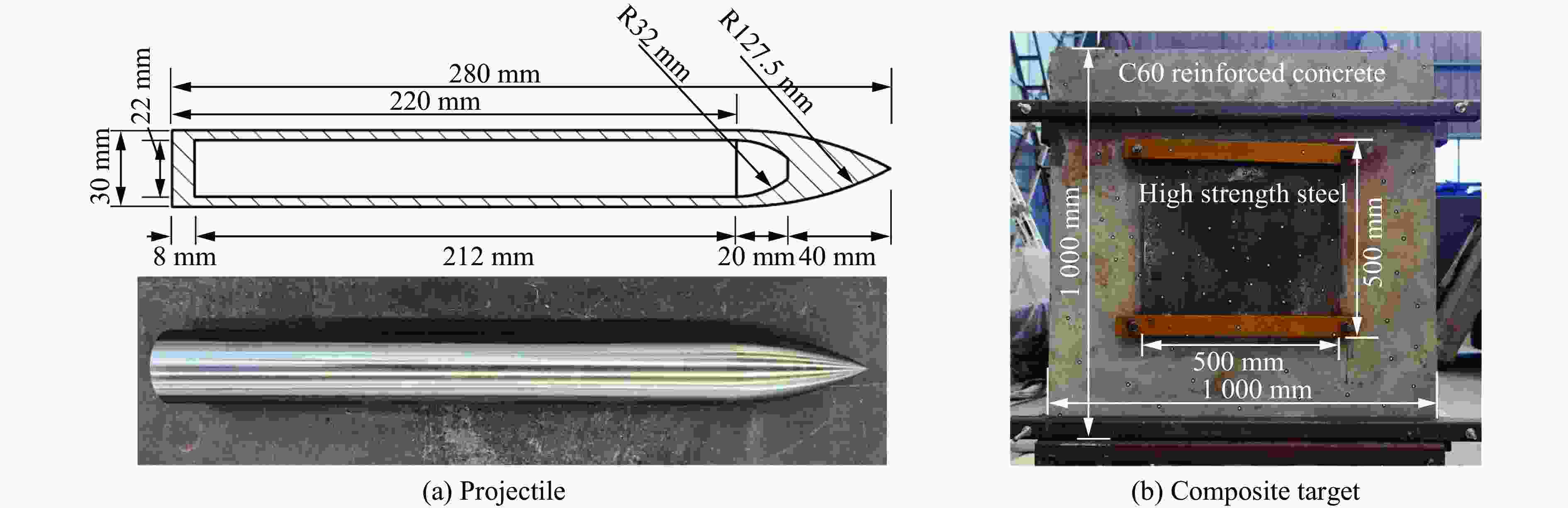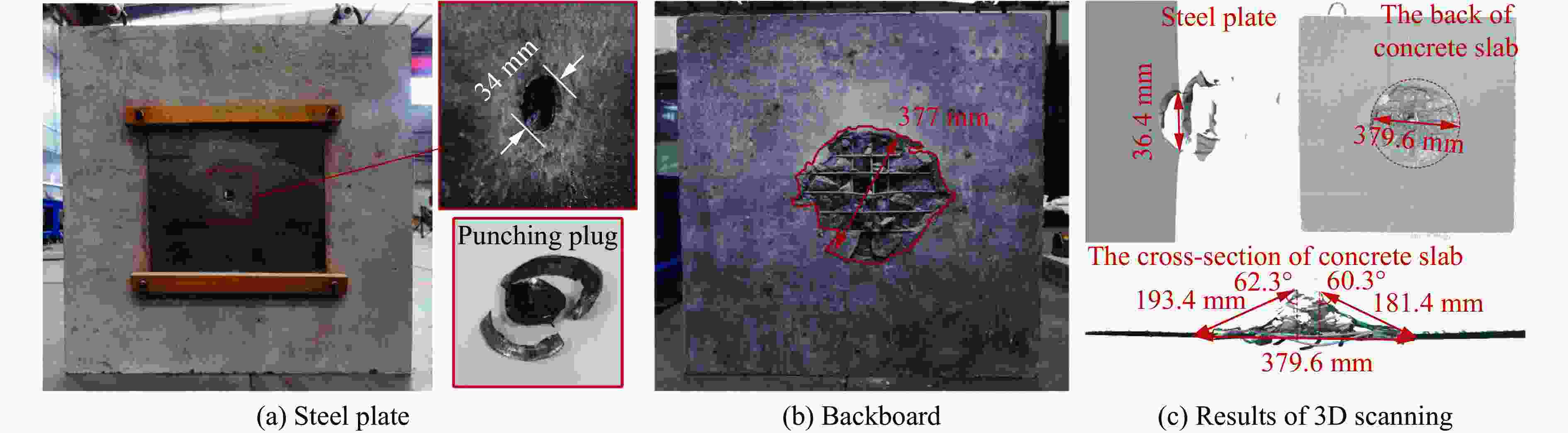 靶体 弹速/(m·s−1) 冲切深度/mm 弹体剩余长度/mm 实测值 理论值 实测值 理论值 5 mm钢-90 mm C60钢筋混凝土 350 − 5.4 − − 10 mm钢-120 mm C60钢筋混凝土 350 3.75 4.3 170.4 172 -
