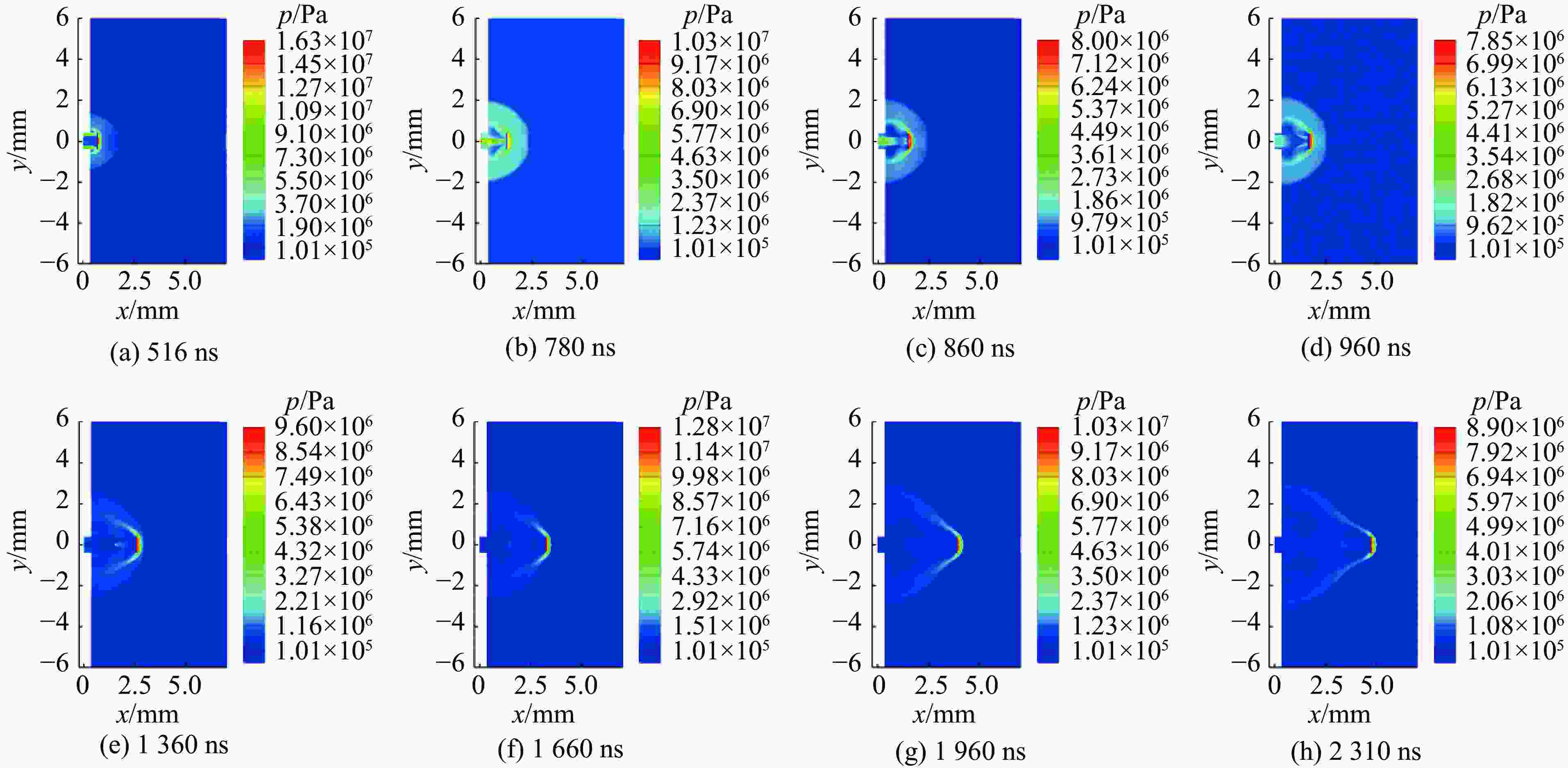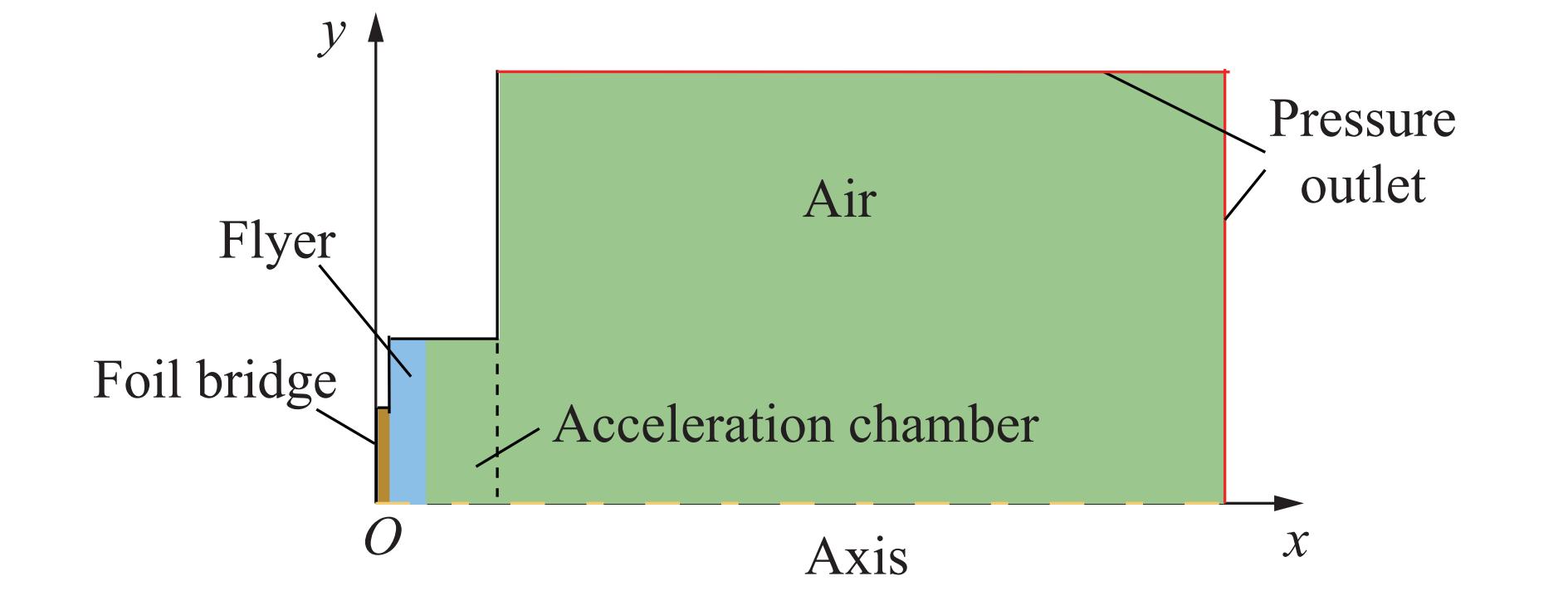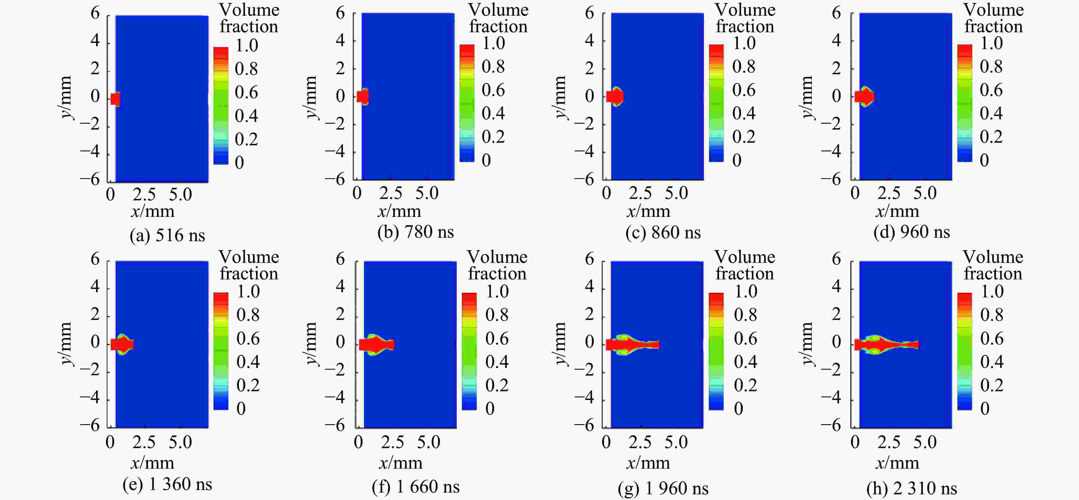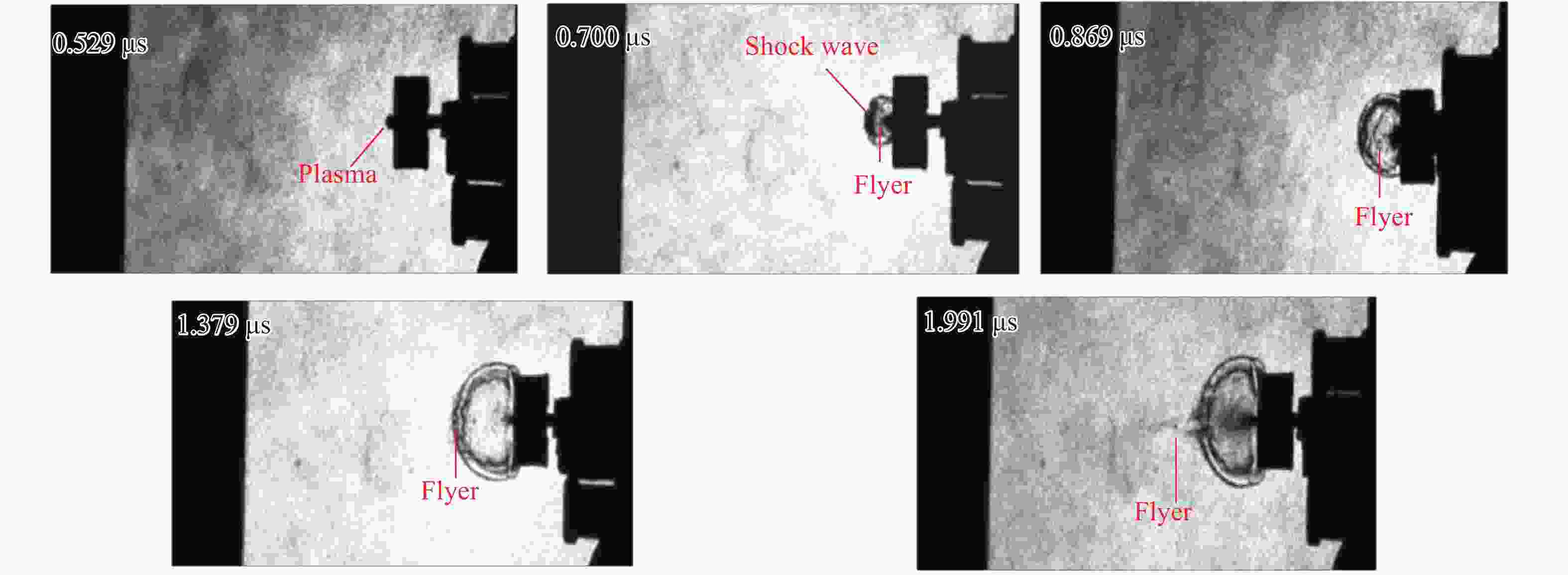 2800 V时,研究范围内,流场压强最大值基本维持在1×107 Pa左右;流场温度逐渐从516 ns时刻的9950 K降低到2310 ns时的3100 K;流场等离子体相分布逐渐由扁平状发展为长条状,等离子体相与飞片运动垂直方向的最大扩散距离为0.8 mm。1360 ns后,由于飞片突破冲击波波阵面,流场的压强分布与温度分布的前端突起。Abstract: Shock initiation and ignition techniques driven by electrically exploded metallic bridge foils with insulating flyers have been widely implemented in initiation and ignition system of weapon. To address the deficiency in existing research regarding the description of the flow field evolution during the motion of flyer and promote the development of this technology towards efficient energy utilization and miniaturization, a double-pulse laser schlieren transient observation system was constructed. This system enables the acquisition of density distributions of the flow field and the motion distance of the flyer at different time. Additionally, a two-dimensional axisymmetric fluid dynamics calculation model and calculation method for the motion process of flyer driven by the electric explosion of metal foil were established, and corresponding numerical simulation calculations were performed in consideration of the evolution laws of the flow field inside and outside the acceleration chamber under the effects of the motion of flyer, the compression of shock wave, and the expansion of high-temperature and high-pressure plasma. The phase transition of bridge foil from solid phase to plasma phase was described by phase transition fraction, the state of plasma with high temperature and pressure was described by the state equation of plasma which consider the changes in particle number and coulomb interaction between particles, and the motion of flyer was described by dynamic grid model. The calculated flow field density distribution closely matches the experimental results, and the maximum errors in flyer motion distance and velocity are 6.1% and 8.1%, respectively, validating the accuracy of the calculation model and calculation method. The research results indicate that when the capacitance is 0.33 μF and the initiation voltage is2800 V, within the research range, the maximum pressure in the flow field remains approximately 1×107 Pa; the temperature in the flow field gradually decreases from9950 K at 516 ns to3100 K at2310 ns; and the plasma phase distribution in the flow field gradually evolves from a flat shape to a long strip shape, with the maximum diffusion distance of plasma in the direction perpendicular to the motion of the flyer being 0.8 mm. At1360 ns, upon th flyer's breakthrough of the shock-wave front, a distinct bulge-shaped profile emerges in the leading edge of both pressure and temperature distributions within the flow field.-
