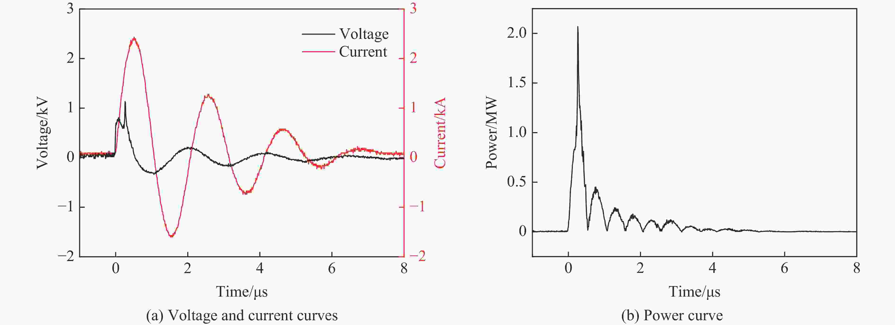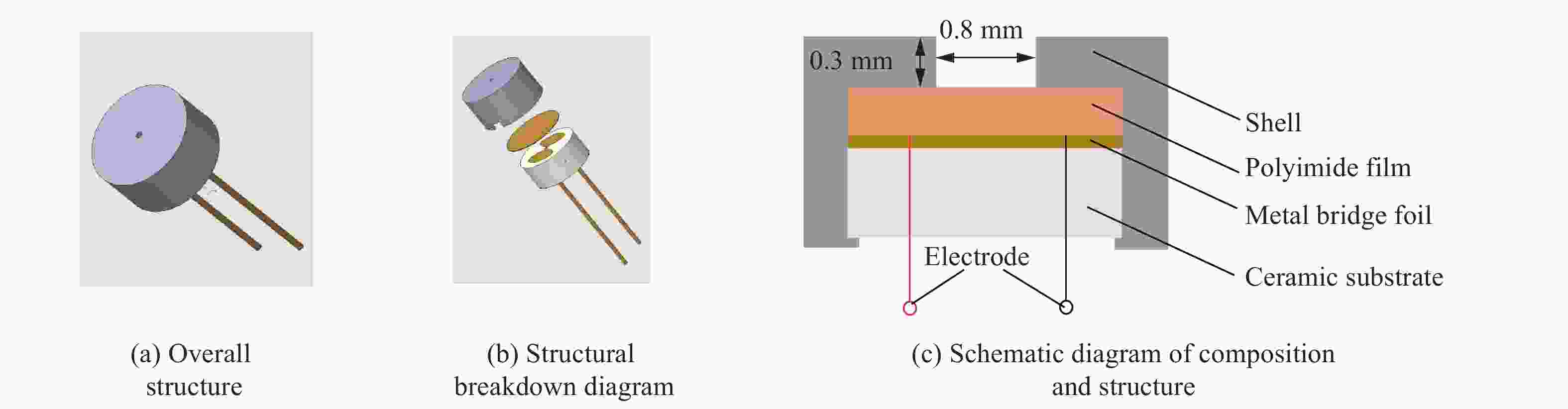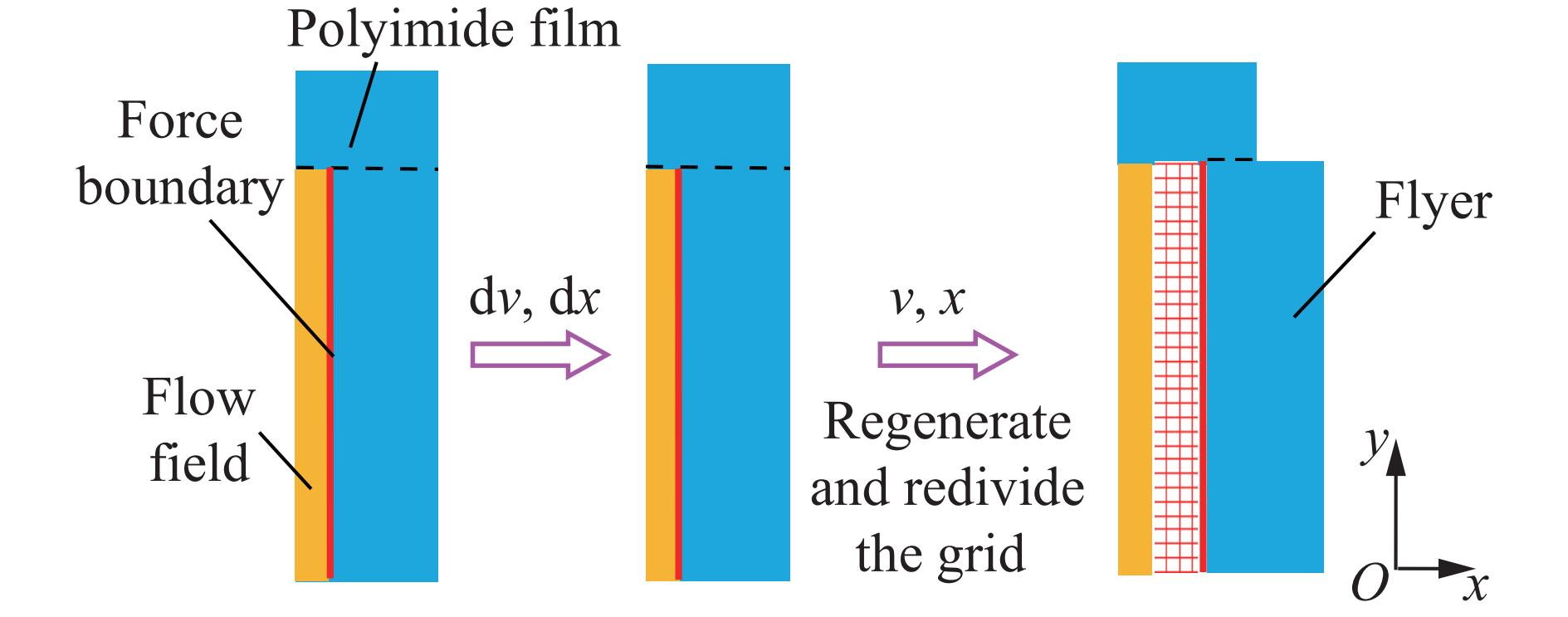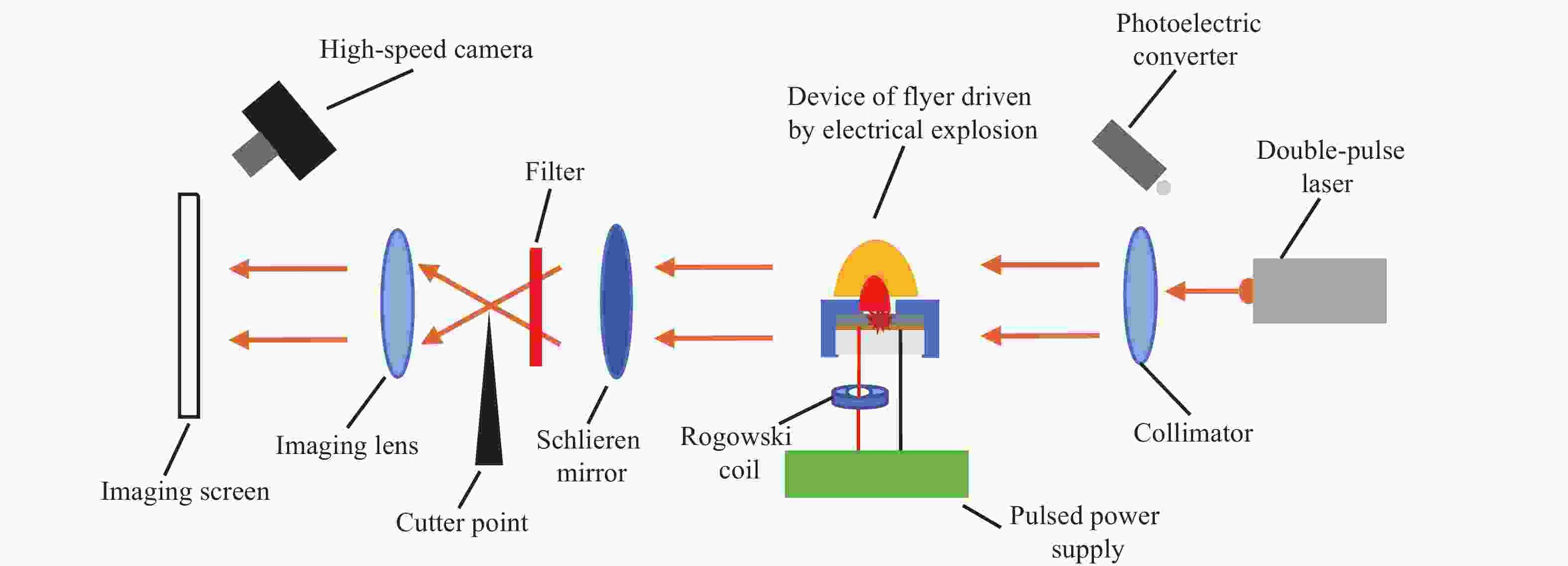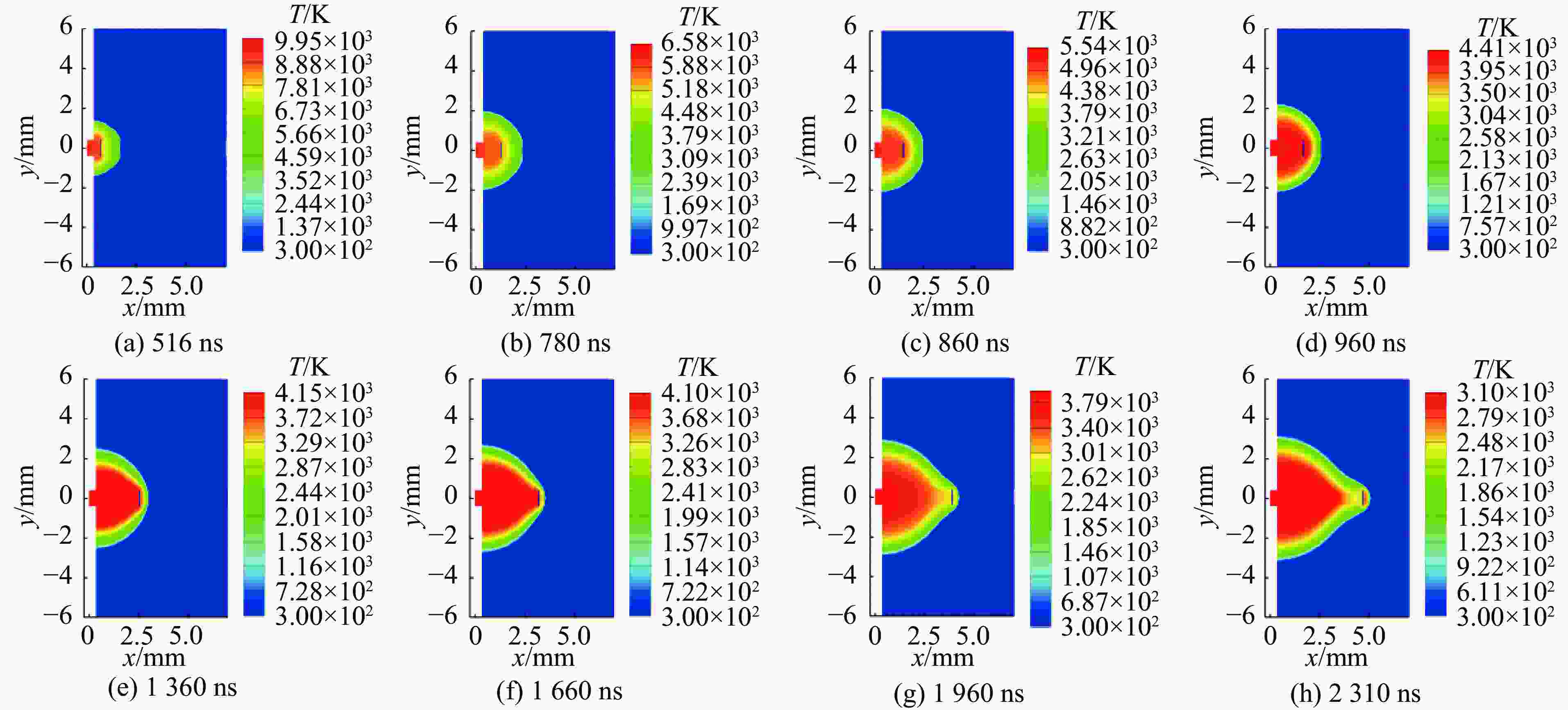 2800 V时,研究范围内,流场压强最大值基本维持在1×107 Pa左右;流场温度逐渐从516 ns时刻的9950 K降低到2310 ns时的3100 K;流场等离子体相分布逐渐由扁平状发展为长条状,等离子体相与飞片运动垂直方向的最大扩散距离为0.8 mm。1360 ns后,由于飞片突破冲击波波阵面,流场的压强分布与温度分布的前端突起。Abstract: Shock initiation and ignition techniques driven by electrically exploded metallic bridge foils with insulating flyers have been widely implemented in initiation and ignition system of weapon. To address the deficiency in existing research regarding the description of the flow field evolution during the motion of flyer and promote the development of this technology towards efficient energy utilization and miniaturization, a double-pulse laser schlieren transient observation system was constructed. This system enables the acquisition of density distributions of the flow field and the motion distance of the flyer at different time. Additionally, a two-dimensional axisymmetric fluid dynamics calculation model and calculation method for the motion process of flyer driven by the electric explosion of metal foil were established, and corresponding numerical simulation calculations were performed in consideration of the evolution laws of the flow field inside and outside the acceleration chamber under the effects of the motion of flyer, the compression of shock wave, and the expansion of high-temperature and high-pressure plasma. The phase transition of bridge foil from solid phase to plasma phase was described by phase transition fraction, the state of plasma with high temperature and pressure was described by the state equation of plasma which consider the changes in particle number and coulomb interaction between particles, and the motion of flyer was described by dynamic grid model. The calculated flow field density distribution closely matches the experimental results, and the maximum errors in flyer motion distance and velocity are 6.1% and 8.1%, respectively, validating the accuracy of the calculation model and calculation method. The research results indicate that when the capacitance is 0.33 μF and the initiation voltage is2800 V, within the research range, the maximum pressure in the flow field remains approximately 1×107 Pa; the temperature in the flow field gradually decreases from9950 K at 516 ns to3100 K at2310 ns; and the plasma phase distribution in the flow field gradually evolves from a flat shape to a long strip shape, with the maximum diffusion distance of plasma in the direction perpendicular to the motion of the flyer being 0.8 mm. At1360 ns, upon th flyer's breakthrough of the shock-wave front, a distinct bulge-shaped profile emerges in the leading edge of both pressure and temperature distributions within the flow field.-