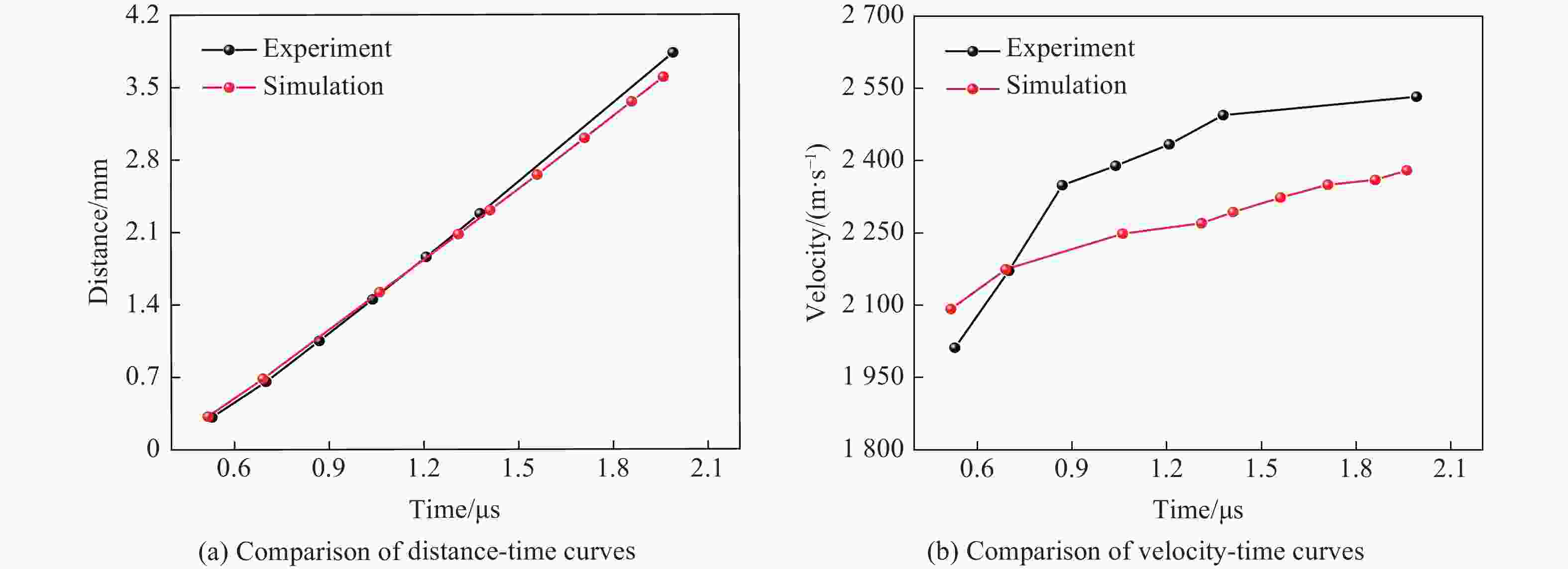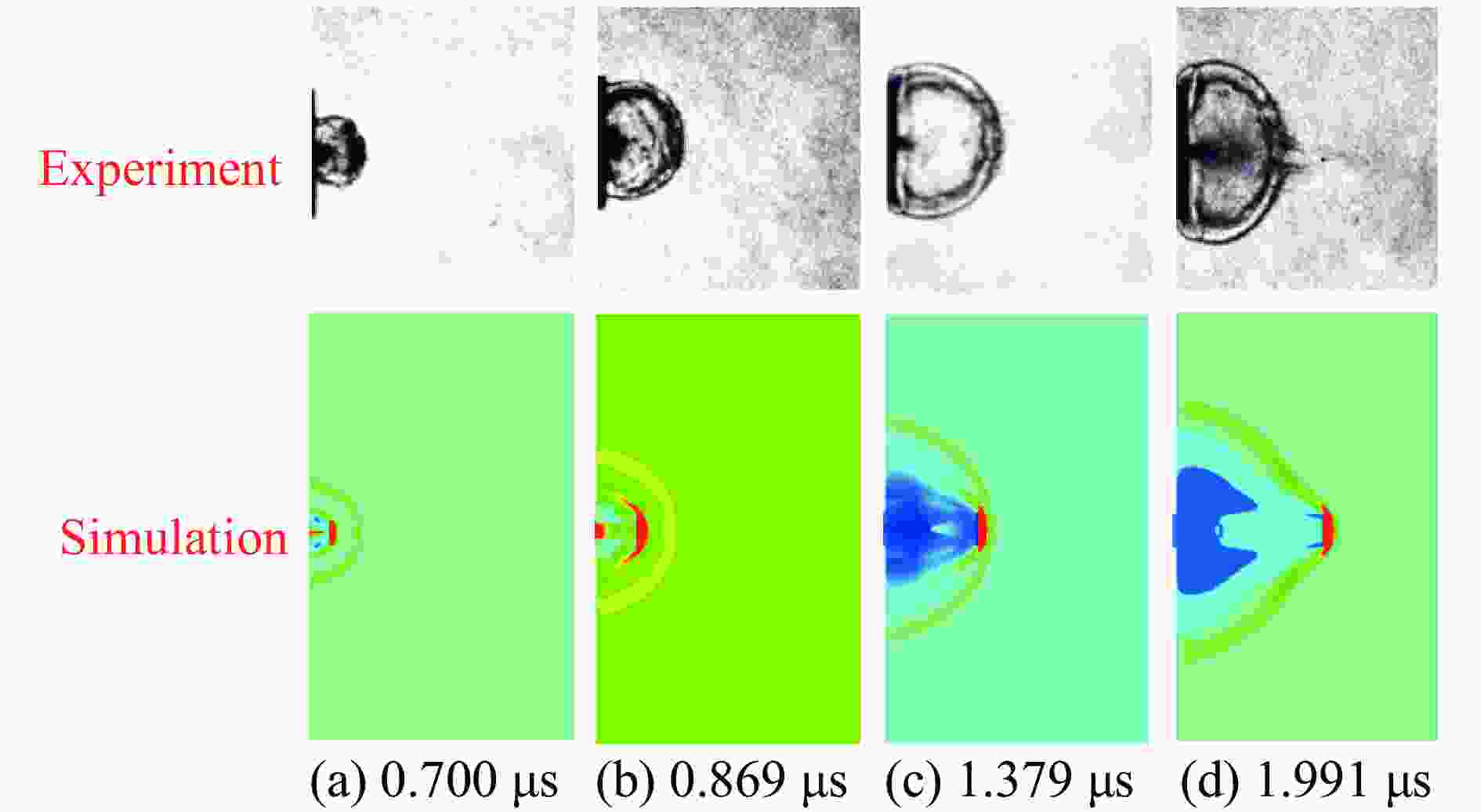 摘要: 金属桥箔电爆炸驱动绝缘飞片的冲击起爆与点火技术在武器装备的起爆与点火系统中被广泛应用。为弥补现有研究对飞片运动过程中流场演化规律描述不足的缺陷,促进该技术向能量高效利用以及小型化等方面发展,搭建了双脉冲激光纹影瞬态观测实验系统,获得了不同时刻下流场的密度分布以及飞片的运动距离,同时,建立了金属桥箔电爆炸驱动飞片运动过程的二维轴对称流体动力学计算模型与计算方法,计算时充分考虑了加速膛内外流场在飞片运动、冲击波压缩以及高温高压等离子体膨胀等作用下的演化规律,采用相变体积分数法描述桥箔在电能作用下由固相到等离子体相的转变,建立了等离子体状态方程以准确描述等离子体的状态,采用动网格模型描述了飞片在流场驱动下的运动。计算与实验得到的流场密度分布具有较好的贴合性,且飞片运动距离和飞片运动速度的最大相对误差分别为6.1%与8.1%,验证了计算模型与计算方法的准确性。研究结果表明:电容为0.33 μF、起爆电压为