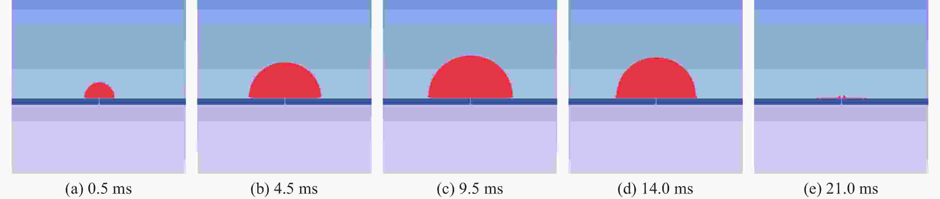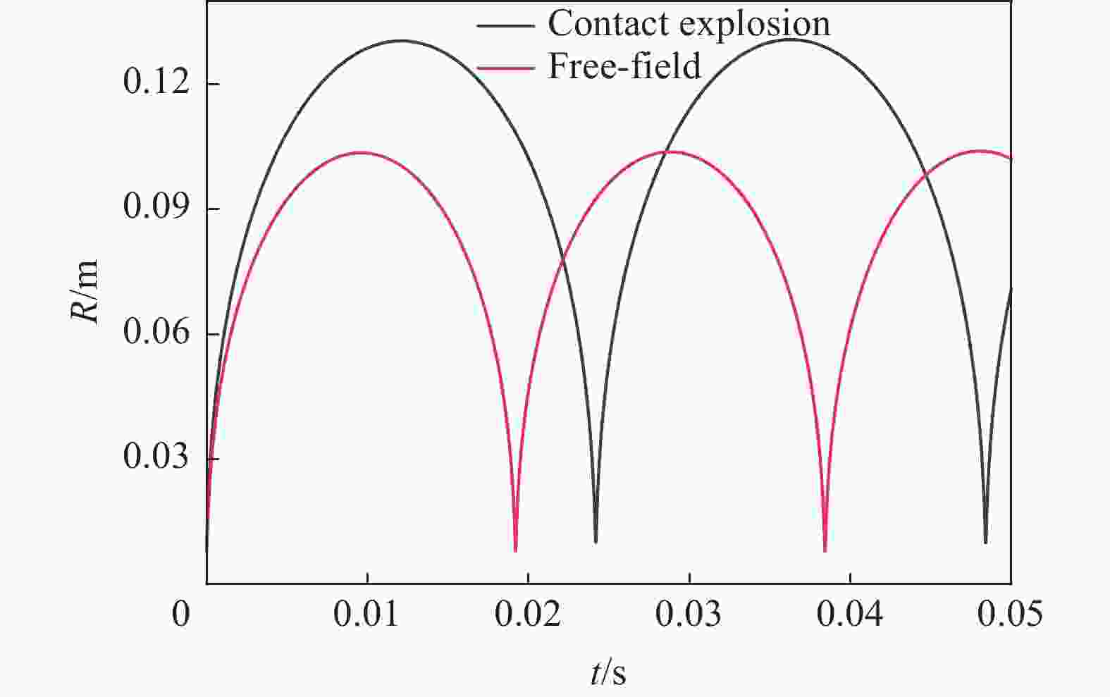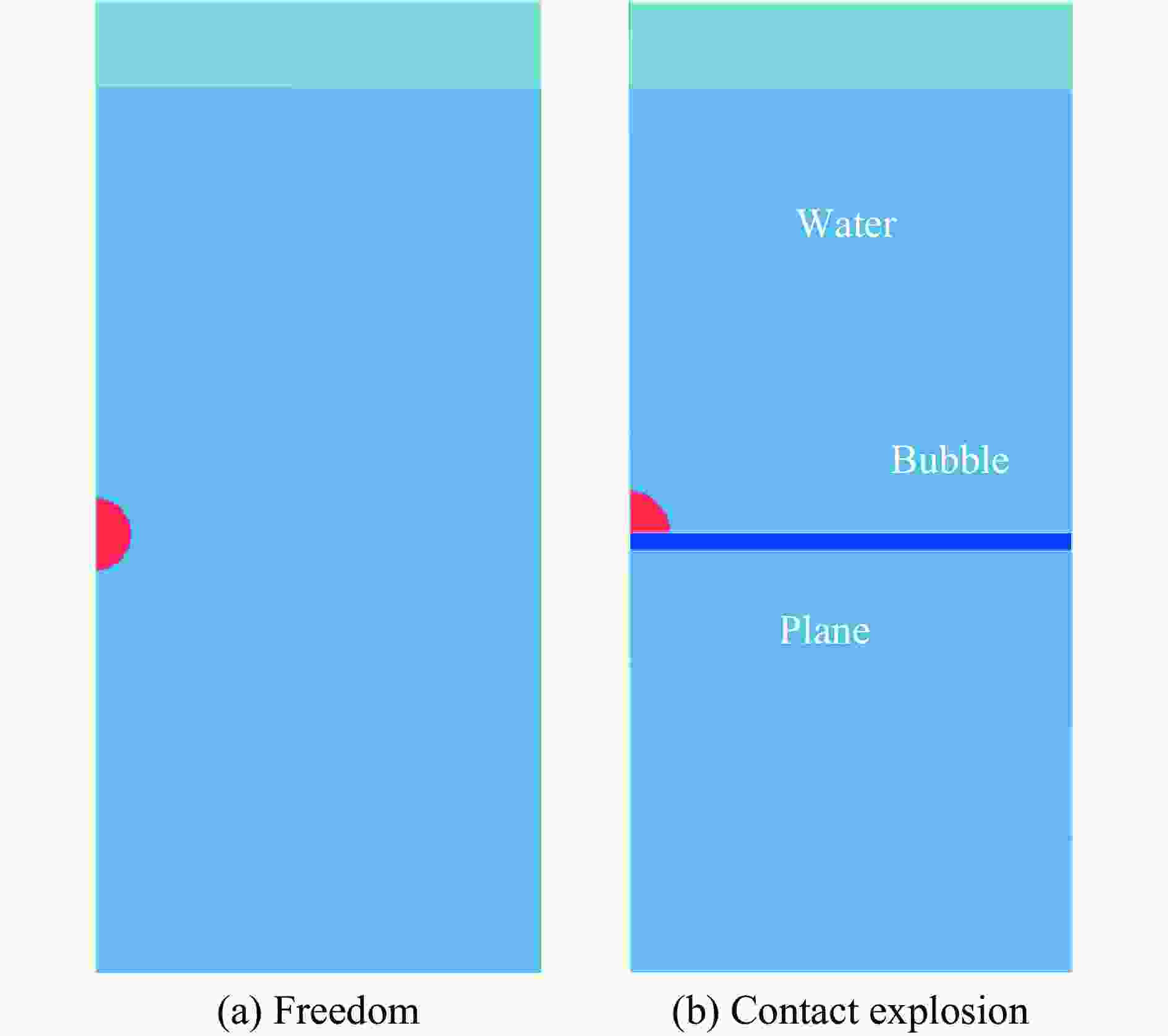 摘要: 为揭示水下接触爆炸气泡脉动特性的变化规律,弥补现有理论对接触爆炸工况研究的不足,基于不可压缩无黏流体假设,建立了刚性壁面接触爆炸的半球形气泡动力学模型,推导了气泡最大半径、初始半径以及脉动周期与自由场参数的定量关系。理论分析表明,接触爆炸气泡最大半径、初始半径及脉动周期为自由场工况的1.26倍(理论比例系数)。通过LS-DYNA软件对0.300、0.233和5.000 g TNT装药在不同水深条件下的水下爆炸进行数值模拟,结果表明:接触爆炸气泡最大半径和脉动周期的模拟值分别为自由场气泡的1.22~1.24倍和1.20~1.21倍,与理论预测的相对误差小于5%。进一步通过水箱实验验证接触爆炸气泡最大半径与脉动周期分别为自由场的1.10和1.06倍,实际工况因受流体可压缩性、气泡不稳定变形等因素影响,实际比例系数略低于理论比例系数。Abstract: Contact explosion is an important condition in the damage and protection of underwater structures, and the pulsating bubbles generated by explosive underwater explosion are an important damage source. The current research on underwater explosion bubbles mainly focuses on the pulsating characteristics of spherical bubbles under free-field and typical boundary conditions, while there is a notable lack of research on non-spherical bubbles under contact explosion conditions. The pulsation characteristics of underwater contact explosion bubbles were systematically investigated through theoretical modeling, numerical simulations, and experiments. To address the theoretical gap in contact explosion dynamics, a hemispherical bubble dynamics model under rigid wall contact conditions was established based on incompressible and inviscid fluid assumptions. By comparing present model with the spherical bubble pulsation model in an incompressible flow field, quantitative relationships between parameters such as the maximum bubble radius, initial radius, pulsation period were obtained. Theoretical analysis reveals that the maximum radius, initial radius, and pulsation period of contact explosion bubbles are 1.26 times (theoretical scaling factor) those of free-field conditions. An error analysis was conducted to account for factors such as fluid compressibility, unstable bubble deformation, and energy dissipation induced by bubble-rigid wall interactions. Numerical simulations using LS-DYNA for underwater explosions with 0.300 g, 0.233 g, and 5.000 g TNT charges under varying water depths reveal that the scaling factors for maximum radius and pulsation period under contact explosion conditions range from 1.22 to 1.24 and 1.20 to 1.21 times those of free-field results, respectively, with simulation errors below 5% compared to theoretical predictions. Experimental validation in a water tank shows that the maximum radius and period of contact explosion bubbles are 1.10 and 1.06 times those of free-field conditions. During the experiments, plate vibrations were observed upon explosion, which significantly contributed to experimental errors. This work addresses the theoretical gap in contact explosion bubble dynamics, enhances the understanding of boundary effects in underwater explosion phenomena.