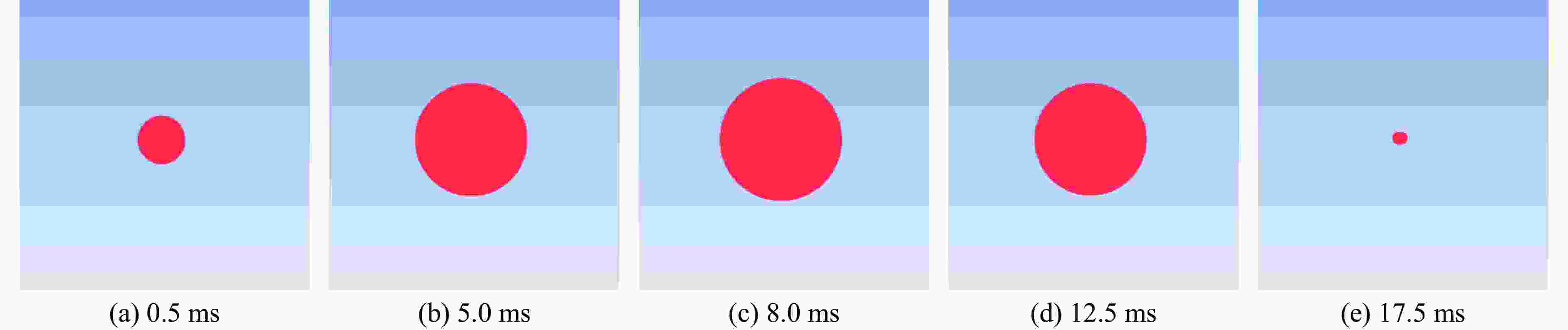 工况 最大半径比例系数 脉动周期比例系数 理论 数值模拟 相对误差/% 理论 数值模拟 相对误差/% 1 1.26 1.22 −3.2 1.26 1.20 −4.7 2 1.26 1.24 −1.6 1.26 1.21 −4.0 3 1.26 1.22 −3.2 1.26 1.20 −4.7 表 5 气泡脉动特性实验结果