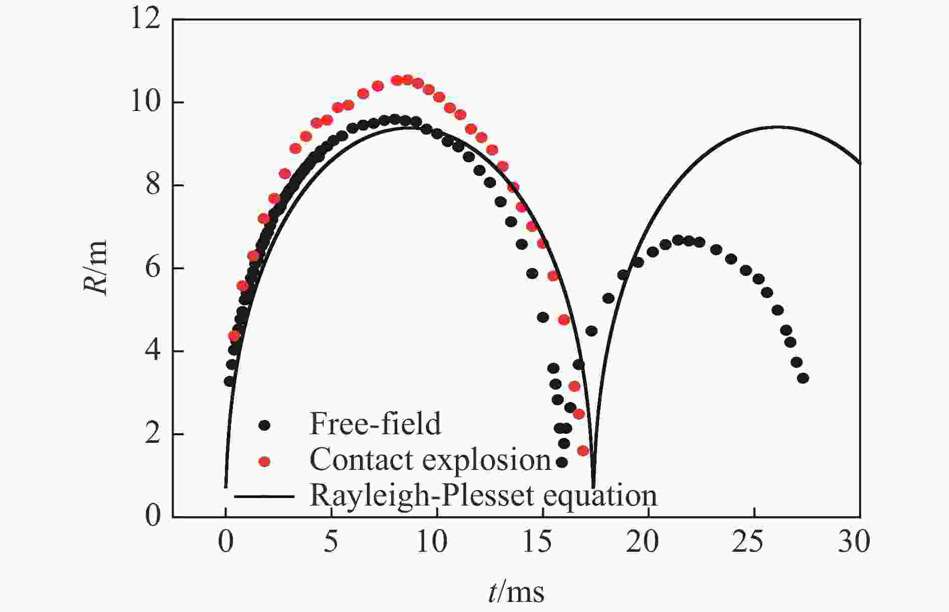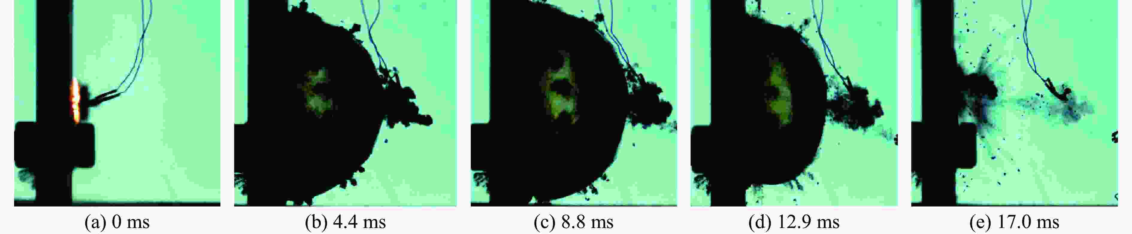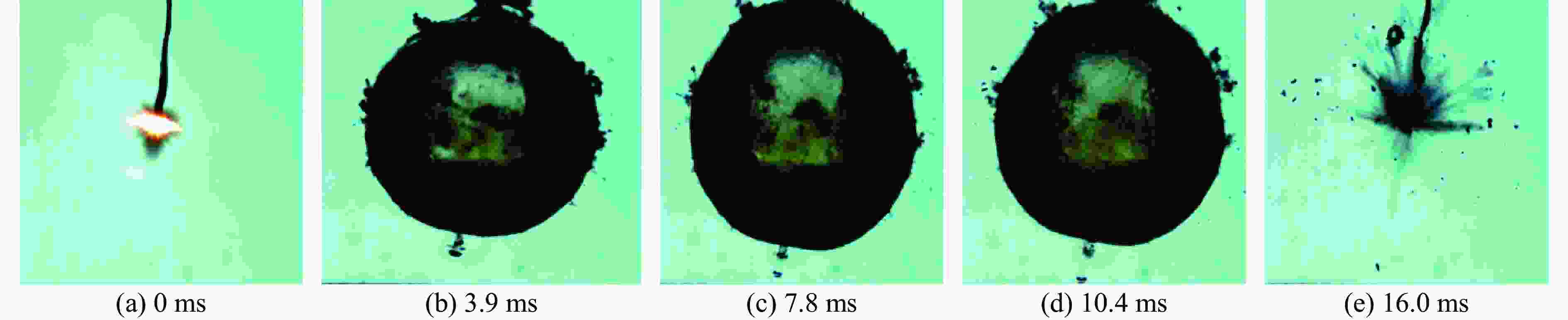 实验 边界条件 气泡最大半径/cm 脉动周期/ms 1 自由场 9.58 15.90 2 自由场 9.94 15.90 3 自由场 9.24 16.10 平均值 9.59 15.97 4 接触爆炸 10.58 17.00 5 接触爆炸 10.54 16.90 6 接触爆炸 10.67 17.00 平均值 10.60 16.97 -