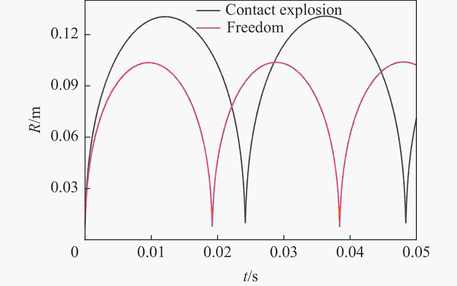 摘要: 为揭示水下接触爆炸气泡脉动特性的变化规律,弥补现有理论对接触爆炸工况研究的不足,基于不可压缩无粘流体假设,建立了刚性壁面接触爆炸的半球形气泡动力学模型,推导了气泡最大半径、初始半径以及脉动周期与自由场参数的定量关系。理论分析表明,接触爆炸气泡最大半径、初始半径及脉动周期为自由场工况的1.26倍(理论比例系数)。通过LS-DYNA软件对0.300、0.233和5.000 g TNT装药在不同水深条件下的水下爆炸进行数值模拟,结果表明接触爆炸气泡最大半径和脉动周期的模拟值分别为自由场气泡的1.22~1.24倍和1.20~1.21倍,与理论预测误差小于5%。进一步通过水箱实验验证,接触爆炸气泡最大半径与周期分别为自由场的1.10倍和1.06倍,实际工况因流体可压缩性、气泡不稳定变形等因素影响,实际比例系数略低于理论比例系数。Abstract: Contact explosion is an important condition in the damage and protection of underwater structures, and the pulsating bubbles generated by explosive underwater explosion are an important damage source. The current research on underwater explosion bubbles mainly focuses on the pulsating characteristics of spherical bubbles under free-field and typical boundary conditions, while there is a notable lack of research on non-spherical bubbles under contact explosion conditions. The pulsation characteristics of underwater contact explosion bubbles were systematically investigated through theoretical modeling, numerical simulations, and experiments. To address the theoretical gap in contact explosion dynamics, a hemispherical bubble dynamics model under rigid wall contact conditions was established based on incompressible and inviscid fluid assumptions. By comparing present model with the spherical bubble pulsation model in an incompressible flow field, quantitative relationships between parameters such as the maximum bubble radius, initial radius, pulsation period were obtained. Theoretical analysis reveals that the maximum radius, initial radius, and pulsation period of contact explosion bubbles are 1.26 (theoretical scaling factor) times those of free-field conditions. An error analysis was conducted to account for factors such as fluid compressibility, unstable bubble deformation, and energy dissipation induced by bubble-rigid wall interactions. Numerical simulations using LS-DYNA for underwater explosions with 0.3 g, 0.233 g, and 5 g TNT charges under varying water depths reveal that the scaling factors for maximum radius and pulsation period under contact explosion conditions range from 1.22 to 1.24 and 1.20 to 1.21 times those of free-field results, respectively, with simulation errors below 5% compared to theoretical predictions. Experimental validation in a water tank shows that the maximum radius and period of contact explosion bubbles are 1.10 and 1.06 times those of free-field conditions. During the experiments, plate vibrations were observed upon explosion, which significantly contributed to experimental errors. This work addresses the theoretical gap in contact explosion bubble dynamics, enhances the understanding of boundary effects in underwater explosion phenomena.
