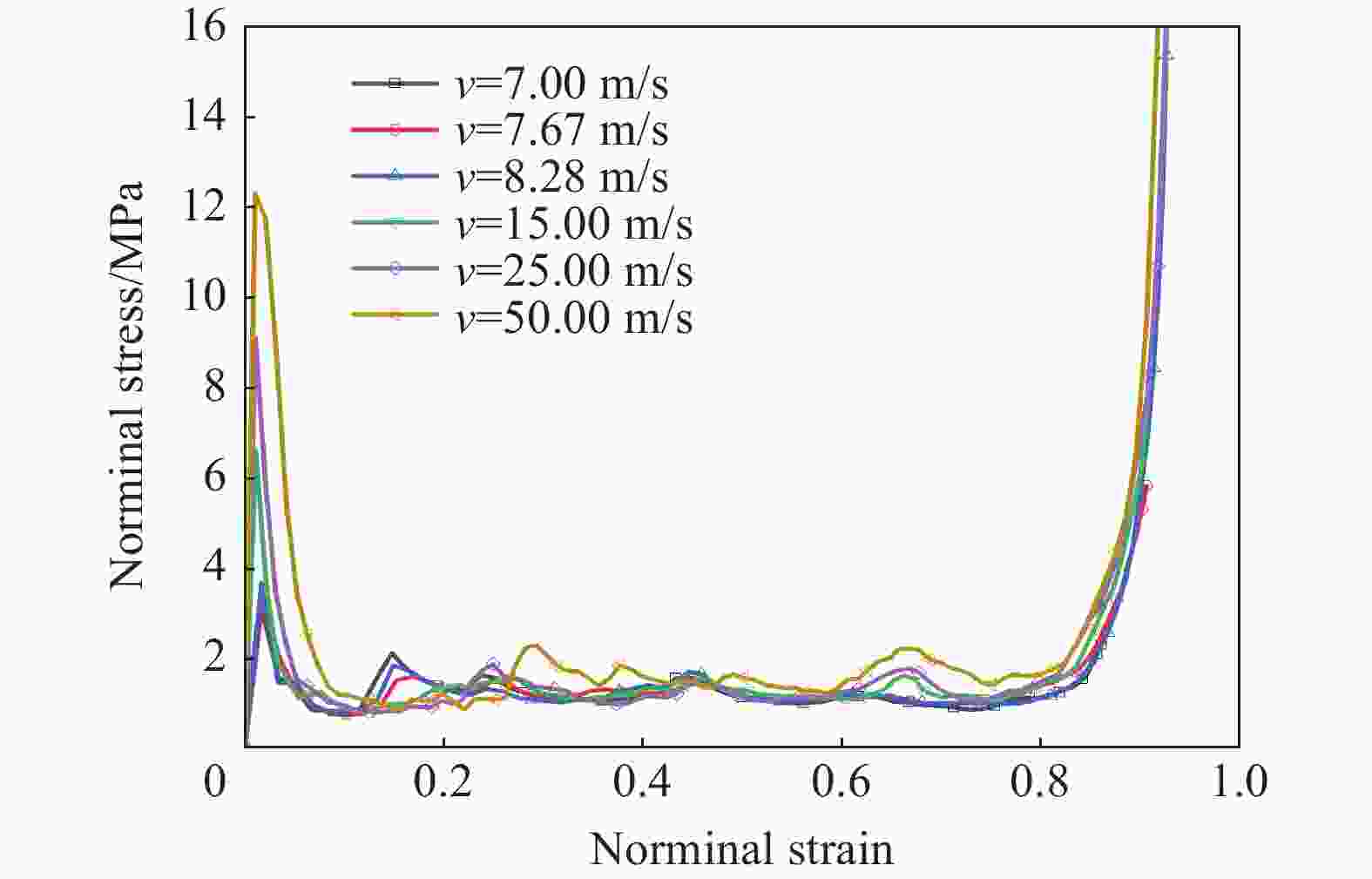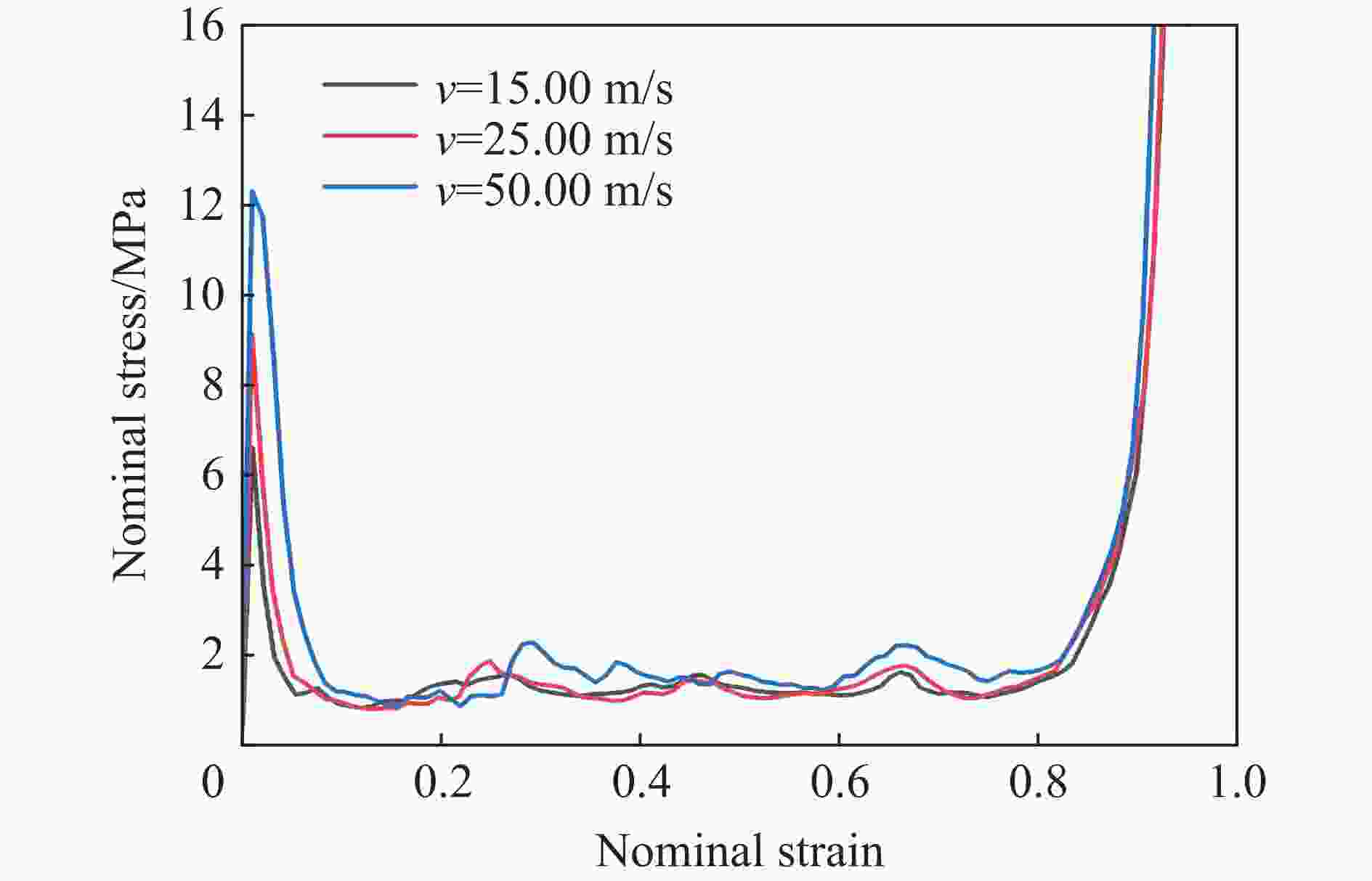 图  16  不同冲击速度下米字形点阵力学超材料的应力-应变曲线
