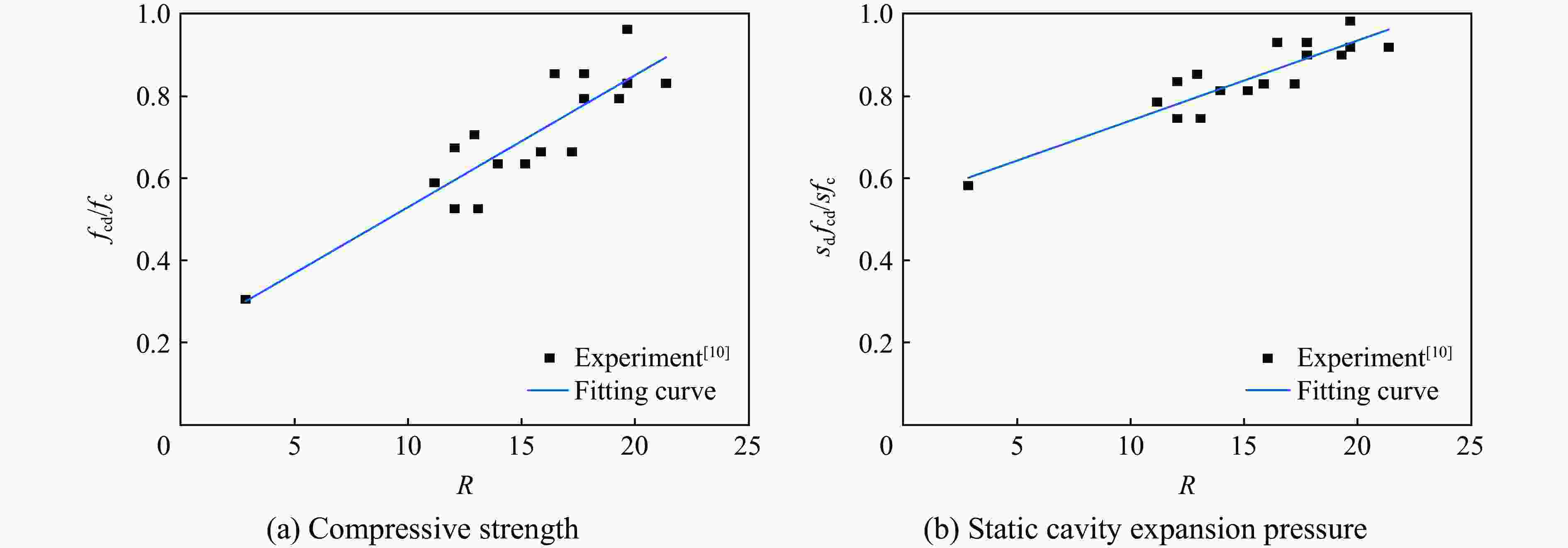 摘要: 为研究混凝土靶体损伤对弹体侵彻性能的影响效果,基于空腔膨胀理论,完善了弹体侵彻预损伤混凝土半经验模型,采用前级射流、后级动能弹体对混凝土靶进行了连续侵彻试验,获得了影响弹体侵彻预损伤混凝土性能的关键因素,结合预损伤混凝土靶体中混凝土材料强度变化关系,分析了弹靶参数对弹体二次侵彻性能的影响规律。结果表明:靶体预损伤对弹体侵彻深度的增益效果由开坑体积差及混凝土损伤共同影响,且混凝土损伤为主要影响因素;当靶体内存在有限长损伤区,靶体开孔直径是弹体直径的0.3~0.5倍时,靶体损伤对弹体侵彻深度增益最为明显;当靶体内存在贯穿损伤区,靶体开孔直径与弹体直径的比值为0.3时,预损伤靶体与预开孔靶体中弹体侵彻深度差异较为明显,且随着比值进一步增加,两者差异逐渐增加;当靶体损伤状态一定时,减小弹体直径或增大尖卵形弹体头部CRH对增加侵彻深度更为有利。Abstract: In order to investigate the impact of target damage on projectile penetration performance, a series of penetration experiments were conducted on a concrete target utilising a former jet and a subsequent kinetic energy projectile. The critical factors influencing the performance of pre-damaged concrete penetrated by the projectile were analyzed. The relationship between the strength of the concrete materials in the pre-damaged concrete target was determined. Based on this, a semi-empirical model of projectile penetration of pre-damaged concrete was established by combining the aforementioned cavity expansion theory with the results of the preceding analysis. The impact of projectile and target parameters on the performance of secondary penetration of the projectile was then analyzed. The findings indicate that the impact of pre-damaged concrete on the depth of projectile penetration is contingent upon the discrepancy in crater volume and concrete damage. It can be posited that the damage to the target is the predominant influencing factor. When there is a finite-length damage zone within the concrete target and the diameter of the cavity of the target is between 0.3 and 0.5 time the diameter of the projectile, the effect is even less pronounced. When a finite-length damage zone exists within the target, the pre-damage cavity is 0.3-0.5 times the diameter of the projectile. In this instance, the gain in depth of penetration is most pronounced. In the event of penetrating damage to the target, a ratio of 0.3 between the diameter of the target tunnel and that of the projectile is observed. The difference in penetration depth between the pre-damaged target and the pre-drilled target is found to be greater, with a gradual increase in this difference as the ratio increases further. When the damage state of the target is certain, decreasing the projectile diameter or increasing the CRH of the ogive-nosed projectile is more advantageous to increase the depth of penetration.
