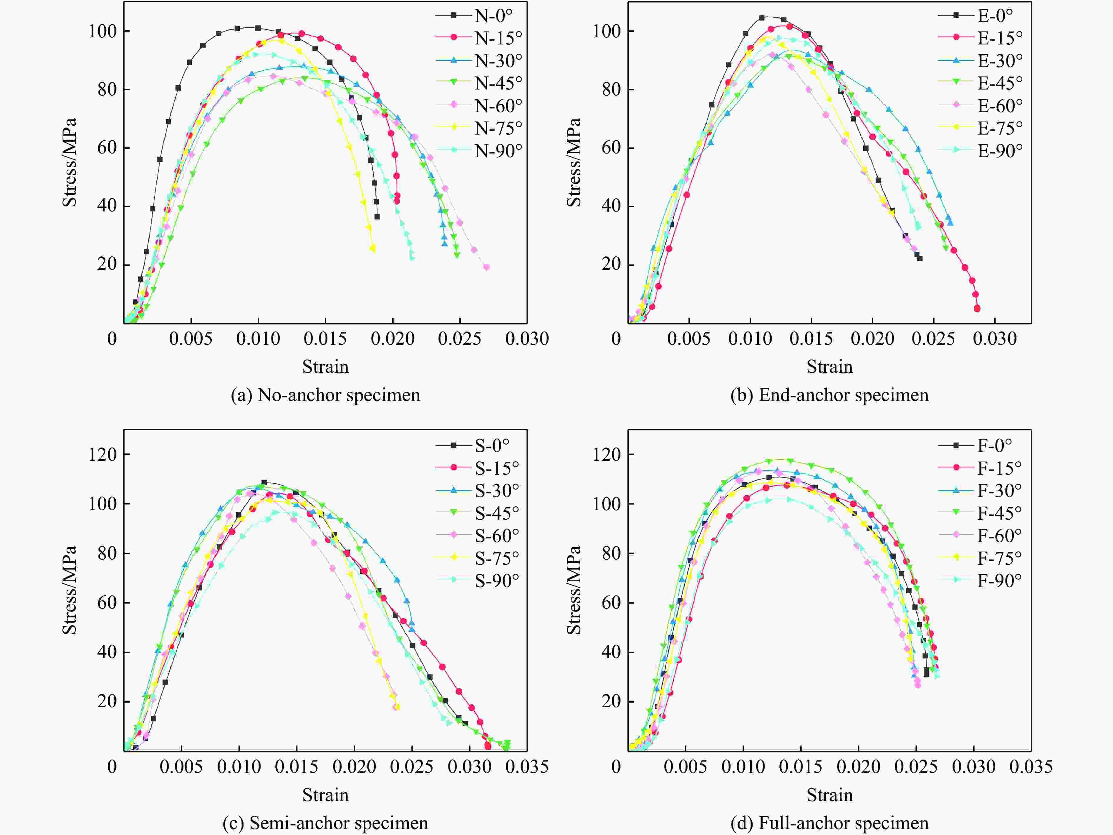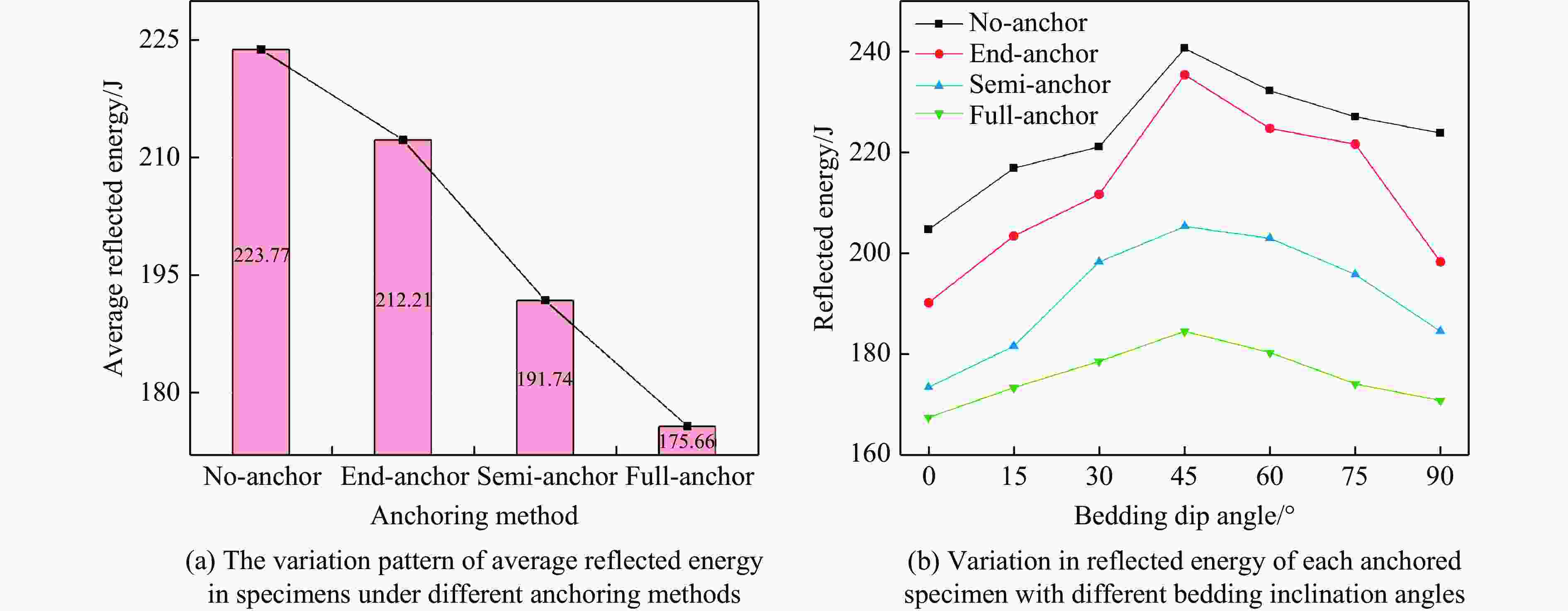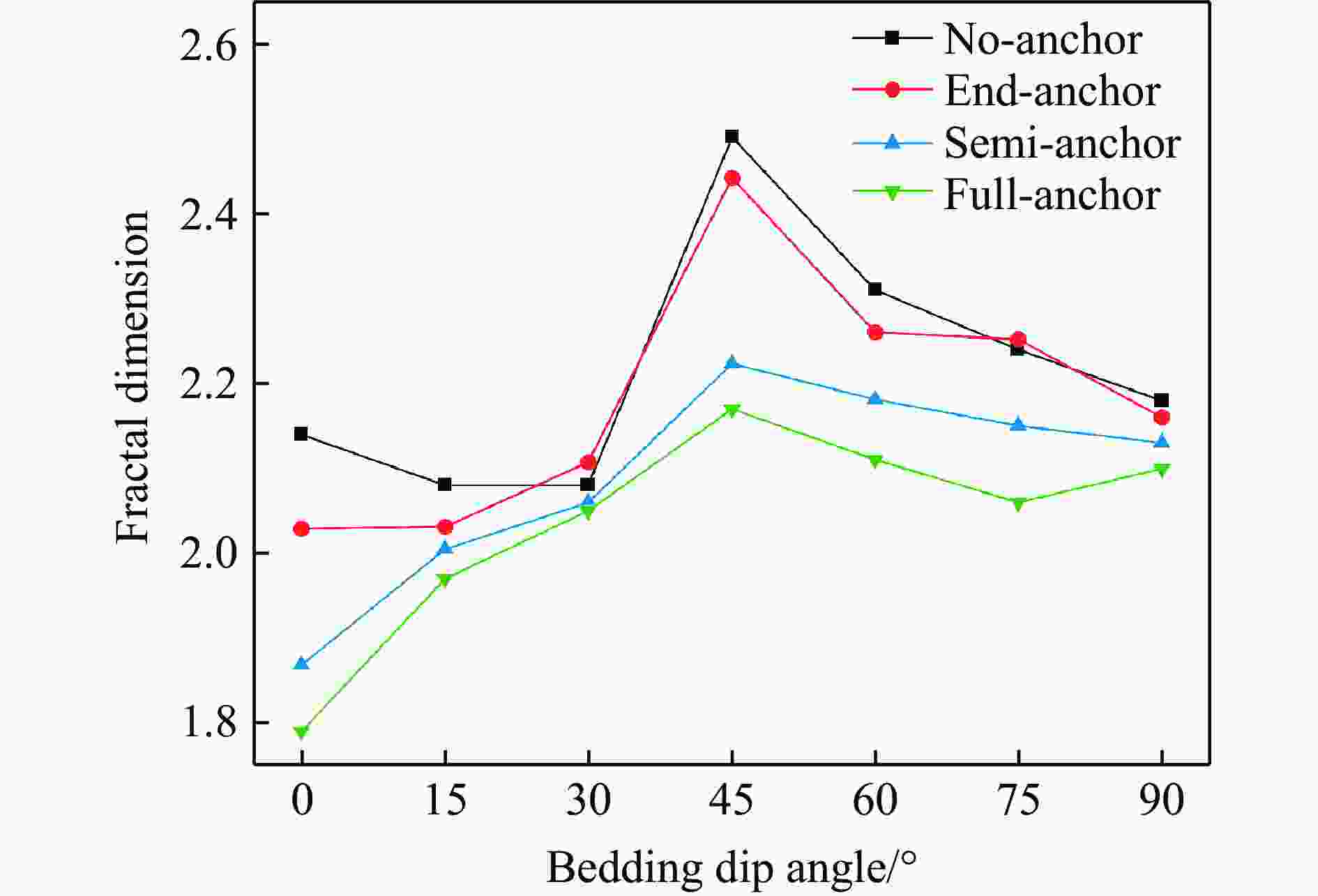 摘要: 为研究冲击荷载下锚固方式与层理倾角对岩体强度的影响规律,对无锚、端锚、半锚及全锚层理砂岩进行动态冲击试验研究,分析了不同锚固方式对层状砂岩动态力学特性、能量耗散规律及破裂分形特征的影响。研究结果表明:无锚试样强度随层理倾角增大,曲线表现先减小后增大,呈“V”型特征,试样在锚固后,强度得到明显提高,随锚固长度增大,曲线向倒“V”型特征转化;从能量方面来看,四类试样透射能变化规律均与强度变化规律相似,随层理倾角增大,反射能曲线呈倒“V”型特征,透射能逐渐减小,耗散能则逐渐增大,锚固方式仅影响了曲线整体水平;试样破坏后的碎屑具有明显分形特征,分形维数受层理倾角影响曲线均表现为倒“V”型特征,全锚试样破碎程度最小,无锚试样最剧烈,在此基础上计算了单位耗散能指数,曲线则呈现"V"型特征,全锚试样的单位耗散能指数曲线整体水平最高,表明其抗破坏能力最强。研究成果可为层状岩体工程锚固支护提供参考。Abstract: Layered rock masses were prone to bedding plane cracking or even large-scale collapse under impact loads such as blasting. In engineering practices, bolts or cables were commonly employed for anchoring support. To investigate the dynamic mechanical response of layered rock masses under impact loading and the effectiveness of bolt support, sandstone specimens with different bedding dip angles (0°, 15°, 30°, 45°, 60°, 75°, 90°) and bolt support methods (No-anchor, End-anchor, Semi-anchor, Full- anchor) were prepared. Dynamic impact tests were conducted using a split Hopkinson pressure bar system to analyze the coupling effects of bedding dip angle and bolt support method on the dynamic strength, energy evolution, and failure modes of the rock mass. Additionally, fractal theory was employed to quantitatively characterize the fracture characteristics of the specimens. The results indicate that the strength of unanchored specimens initially decreases and then increases with increasing bedding plane angle, exhibiting a V-shaped curve. After anchoring, the strength of specimens improves significantly, and as the anchor length increases, the curve transitions to an inverted V-shape. From an energy perspective, the transmitted energy trends of all four specimen types are similar to their strength trends. As the bedding plane angle increases, the reflected energy curve shows an inverted V-shape, the transmitted energy gradually decreases, while the dissipated energy increases. The anchoring method primarily affects the overall level of the curves. The fragments of the specimens after failure exhibit distinct fractal characteristics, with the fractal dimension curves showing an inverted V-shape influenced by the bedding plane angle. Full-anchor specimens display the least fragmentation, while No-anchor specimens experience the most severe damage. Based on this, the unit dissipated energy index was calculated, revealing a V-shaped curve. Full-anchor specimens exhibit the highest overall unit dissipated energy index, indicating their superior resistance to damage. The findings of this study can provide a reference for anchor support design in layered rock mass engineering.