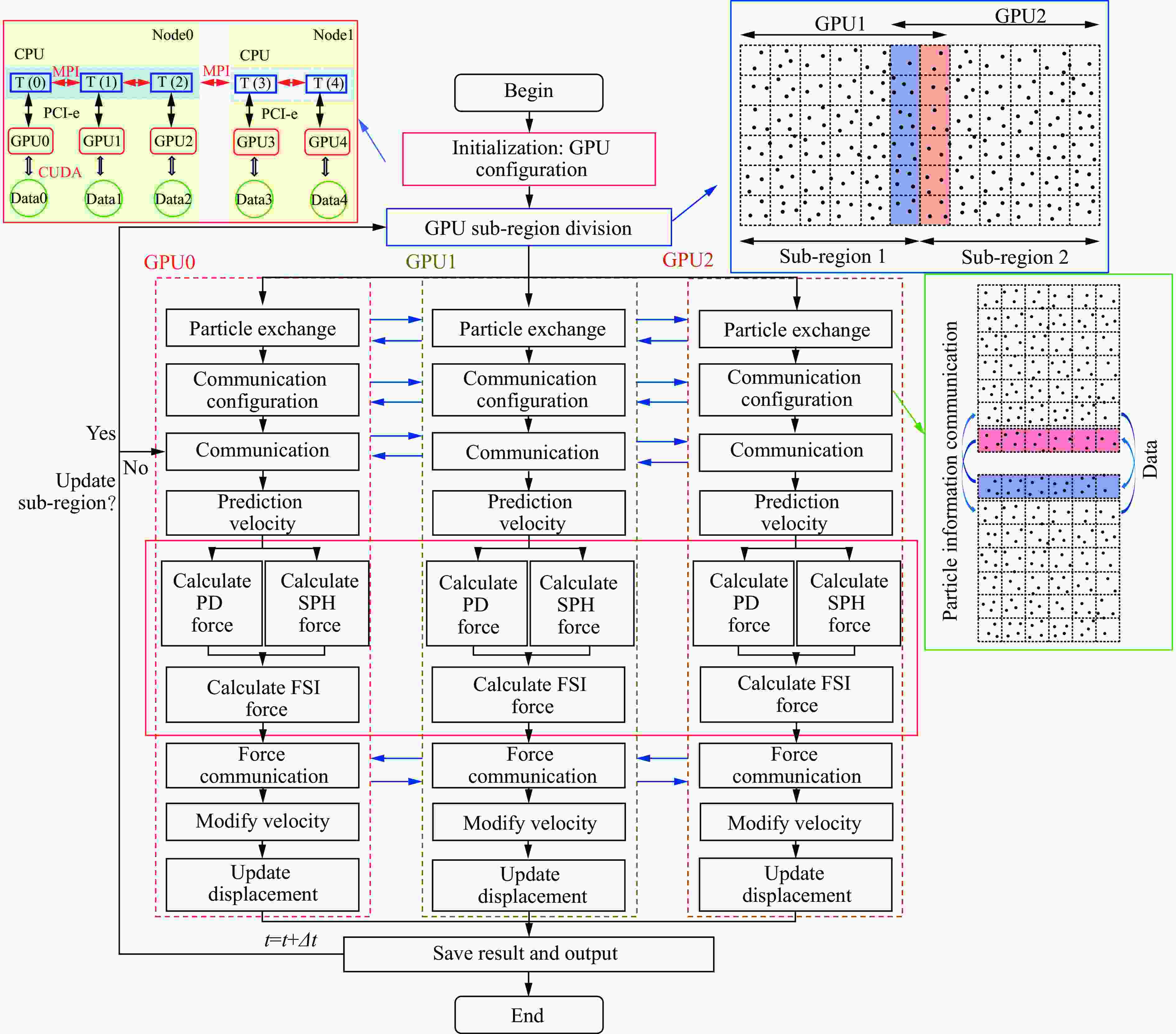 摘要: 针对舰艇抗爆炸冲击性能评估面临的强非线性流固耦合、结构大变形及损伤破坏演化等关键力学问题,耦合近场动力学(peridynamics, PD)和光滑粒子流体动力学(smoothed particle hydrodynamics, SPH)各自的优势,提出了适用于水下爆炸冲击模拟的高效PD-SPH数值方法。采用SPH模拟水下冲击波传播及其流固耦合效应,采用PD方法精确表征固体结构从弹性变形至渐进损伤破坏的全过程力学行为,建立了非药式水下爆炸冲击波加载装置的PD-SPH数值模型。针对大规模粒子计算效率瓶颈,开发了基于区域分解和数据通信机制的多GPU (graphics processing unit)并行计算框架。系统验证和并行效率测试表明,该方法可准确预测冲击波壁面压力和靶体动态变形,成功复现薄板结构的典型裂纹扩展模式,并可用于开展复杂夹层板毁伤全过程模拟。在超过500万个粒子的复杂流固耦合场景中,8卡RTX4090相比单卡RTX4090加速比为4.13,并行效率为51.6%,实际计算时间可以压缩到近1 h。同时,多GPU并行与传统CPU (central processing unit)并行相比,加速比可达9倍以上。Abstract: The evaluation method of ship’s explosion shock resistance is challenged by some key mechanical problems, such as strong nonlinear fluid-structure coupling, large-deformation and failure evolution of solid structure. By coupling the respective advantages of peridynamics (PD) and smoothed particle hydrodynamics (SPH), an efficient PD-SPH numerical method suitable for underwater explosion shock simulations was developed. The SPH method was employed to simulate underwater shock wave propagation and fluid-structure interaction, while the PD method accurately characterized the complete mechanical behavior of solid structures from elastic deformation to progressive damage failure. A PD-SPH numerical model was established for non-explosive underwater shock loading devices. In the non-ordinary state-based peridynamics (NOSB-PD) framework, the Johnson-Cook damage model was introduced. To suppress the occurrence of numerical instability, the artificial stiffness form was introduced by increasing the internal constraints between particles. To improve the computational efficiency in large-scale simulations, a multi-GPU (graphics processing unit) parallel computing framework based on domain decomposition and data-communication mechanisms was established. The domain decomposition was carried out through the Eulerian format. When particles move from one domain to another, the physical quantities of the particles were exchanged for information. Model validation and parallel efficiency tests demonstrate that the proposed method can accurately predict shock wave wall pressure and target dynamic deformation, successfully reproduce typical crack propagation patterns in thin-plate structures and simulate the entire damage process of complex grid sandwich structure. In complex fluid-structure coupling scenarios with more than 5 million particles, the 8*RTX4090 achieved an acceleration ratio of 4.13 compared to a single RTX4090, with a parallel efficiency of 51.6%. The actual computation time can be reduced to nearly 1 hour. Meanwhile, compared with traditional CPU (central processing unit) parallelism, the multi-GPU parallelism can achieve an acceleration ratio of more than 9 times. The research outcomes provide a high-precision and efficient numerical analysis tool for the design of explosion-resistant naval structures, offering significant reference value for engineering applications of fluid-structure interaction in underwater explosion problems.