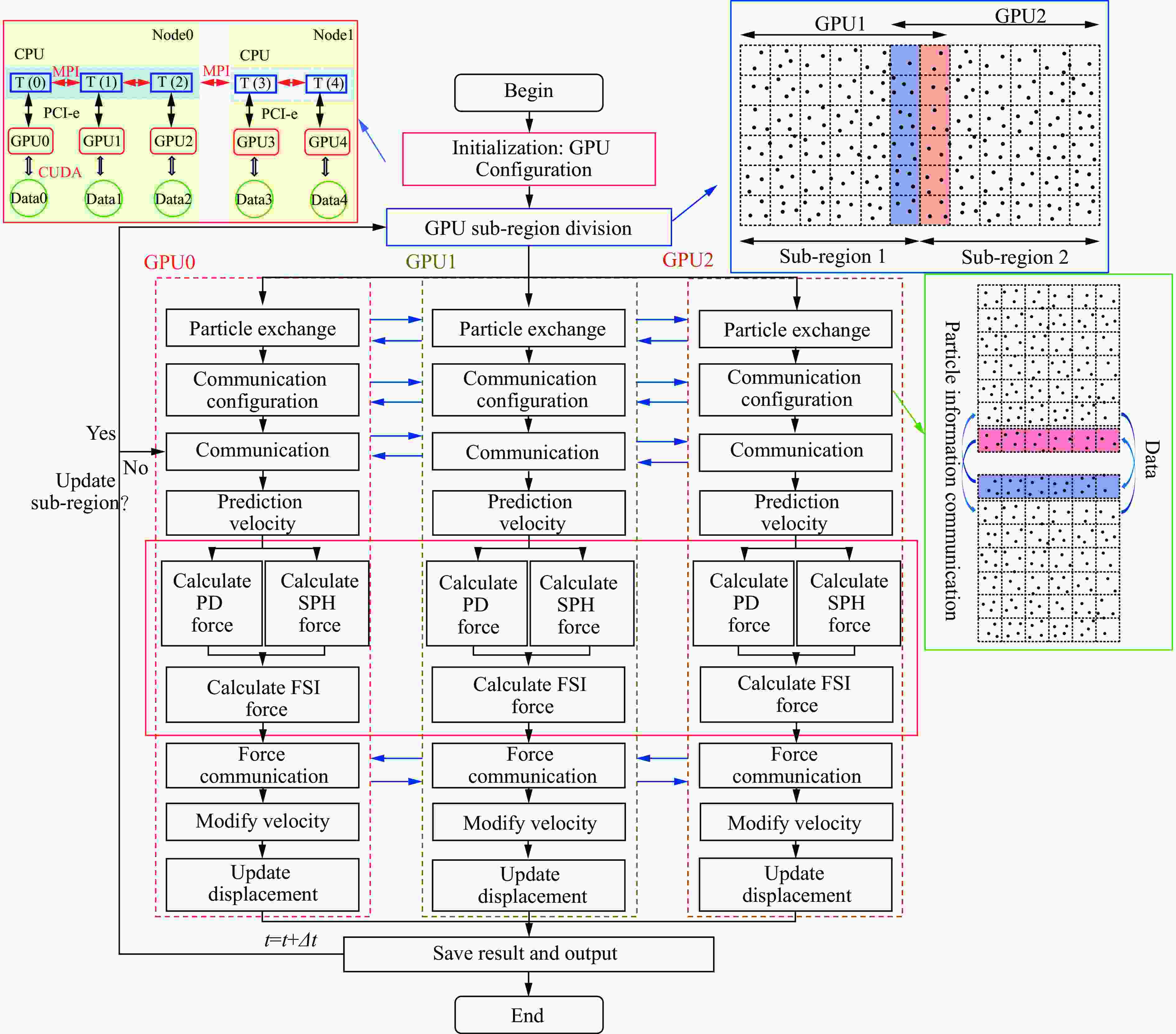 摘要: 鉴于舰艇抗爆炸冲击性能评估面临强非线性流固耦合、结构大变形及损伤破坏演化等关键力学问题挑战,通过耦合近场动力学(peridynamics, PD)和光滑粒子流体动力学(smoothed particle hydrodynamics, SPH)的各自优势,构建适用于水下爆炸冲击模拟的高效PD-SPH数值模型。采用SPH模拟水下冲击波传播及其流固耦合效应,通过PD方法精确表征固体结构从弹性变形至渐进损伤破坏的全过程力学行为,建立非药式水下爆炸冲击波加载装置的PD-SPH数值模型。针对大规模粒子计算效率瓶颈,开发基于区域分解与数据通信机制的多GPU (graphics processing unit)并行计算框架。系统验证和并行效率测试表明,该方法可准确预测冲击波壁面压力和靶体动态变形,成功复现薄板结构的典型裂纹扩展模式,并可用于开展复杂夹层板毁伤全过程模拟。在超过500万个粒子的复杂流固耦合场景中,8卡RTX4090相比单卡RTX4090加速比为4.13,并行效率为51.6%,实际计算时间可以压缩到近1 h。同时,多GPU并行与传统CPU (central processing unit)并行相比,加速比可达9倍以上。Abstract: The evaluation method of ship's explosion shock resistance is challenged by some key mechanical problems, such as strong nonlinear fluid-structure coupling, large-deformation and failure evolution of solid structure. By coupling the respective advantages of peridynamics (PD) and smoothed particle hydrodynamics (SPH), an efficient PD-SPH numerical model suitable for underwater explosion shock simulations was developed. The SPH method was employed to simulate underwater shock wave propagation and fluid-structure interaction, while the PD method accurately characterized the complete mechanical behavior of solid structures from elastic deformation to progressive damage failure. A PD-SPH numerical model was established for non-explosive underwater shock loading devices. In the non-ordinary state-based peridynamics (NOSB-PD) framework, the Johnson-Cook damage model was introduced. To suppress the occurrence of numerical instability, the artificial stiffness form was introduced by increasing the internal constraints between particles. To improve the computational efficiency in large-scale simulations, a multi-GPU (graphics processing unit) parallel computing framework based on domain decomposition and data-communication mechanisms was established. The domain decomposition was carried out through the Eulerian format. When particles move from one domain to another, the physical quantities of the particles were exchanged for information. Model validation and parallel efficiency tests demonstrate that the proposed method can accurately predict shock wave wall pressure and target dynamic deformation, successfully reproduce typical crack propagation patterns in thin-plate structures and simulate the entire damage process of complex grid sandwich structure. In complex fluid-structure coupling scenarios with more than 5 million particles, the 8*RTX4090 achieved an acceleration ratio of 4.13 compared to a single RTX4090, with a parallel efficiency of 51.6%. The actual calculation time can be reduced to 1 hour. Meanwhile, compared with traditional CPU (central processing unit) parallelism, the multi-GPU parallelism can achieve an acceleration ratio of more than 9 times. The research outcomes provide a high-precision and efficient numerical analysis tool for the design of explosion-resistant naval structures, offering significant reference value for engineering applications of fluid-structure interaction in underwater explosion problems.
