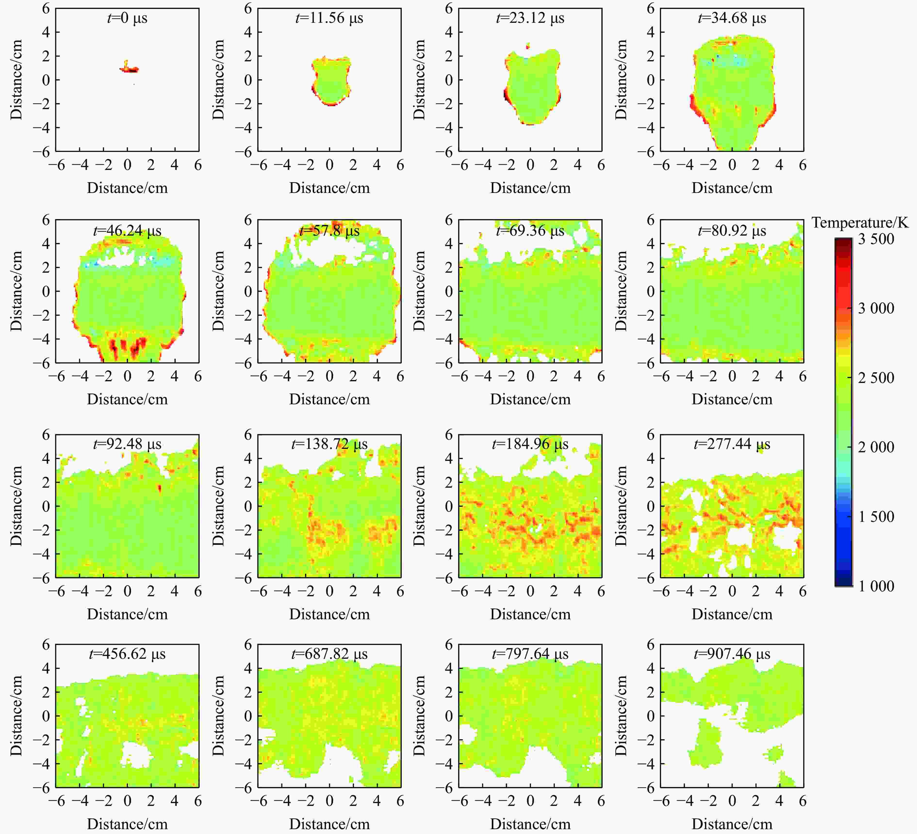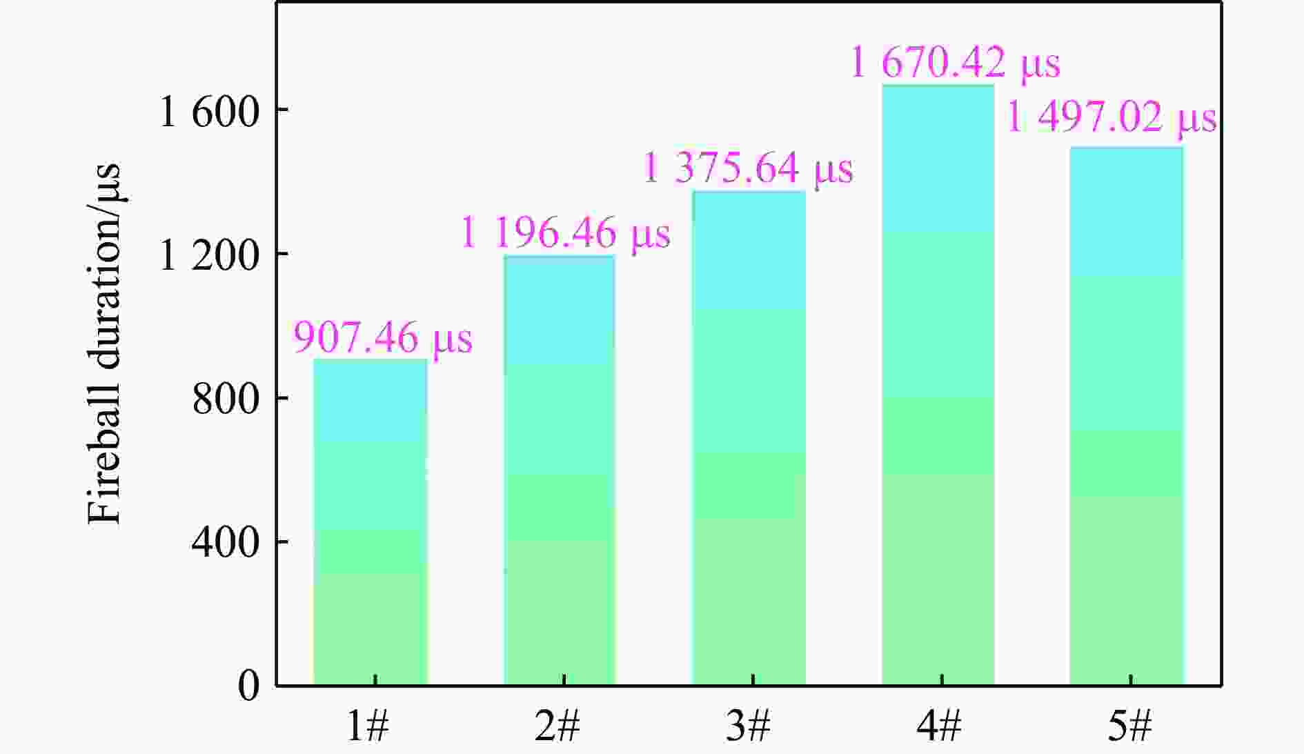 2782 K和1668.90 μs。固体爆炸产物分析表明,短切钛纤维通过改善Al/PTFE基体力学强度、延缓Al/PTFE环状活性材料碎裂时间并促进界面反应并参与高温化学反应,产生的协同作用和正反馈效应可以同时增强Al/PTFE活性材料的力学韧性与能量释放效率。Abstract: To improve the mechanical behaviors and explosion performance of the Al/PTFE reactive materials, short-cut titanium fibers were added to Al/PTFE annular reactive materials, and subsequently assembled with RDX explosive column to form a composite charge. The effects of different titanium fiber contents on the mechanical behaviors of the annular reactive materials were investigated using a universal material testing machine and a split Hopkinson pressure bar. The influence of short-cut titanium fiber contents on the quasi-static pressure, shock wave parameters and thermal damage effects of the composite charge was studied in depth by the free-field explosion test system and spherical explosion container test system combined with the colorimetric temperature measurement technology. The temperature field of explosion flame was reconstructed by the colorimetric temperature measurement method with a high-speed camera, which was based on the gray-body radiation theory. A tungsten lamp calibrated the measurement accuracy of the temperature mapping system, and the fitting relationship between the temperatures and the gray values of the high-speed images was derived to obtain the conversion coefficient. The test results of mechanical properties showed that with the increase of titanium fiber content, the elastic modulus, yield strength and compressive strength of Al/PTFE annular reactive materials under quasi-static compression, as well as the yield strength and compressive strength under high-speed impact, all exhibited an initial increase, which were followed by a decrease, reaching the maximum values at 3% content. The experimental results of explosion performance showed that short-cut titanium fibers could significantly enhance the explosion performance of Al/PTFE-RDX composite charges. When the content of short-cut titanium fibers was 3%, the peak overpressure of the explosion shock wave, its positive phase duration and positive impulse were 37.68 kPa, 695.34 µs and 12.34 Pa·s, respectively. With 5% content of short-cut titanium fibers, the afterburning effect was the most significant. The maximum values of the explosion quasi-static pressure, average fireball temperature and fireball duration reached 70.50 kPa,2782 K and1668.90 µs, respectively. Analysis of solid explosion products indicated that short-cut titanium fibers could enhance the mechanical strength of the Al/PTFE matrix, delay the fragmentation time of the Al/PTFE annular reactive materials, promote the interfacial reactions, and participate in high-temperature chemical reactions, generating a synergistic effect and positive feedback to improve the mechanical toughness and energy release efficiency of the reactive materials.-