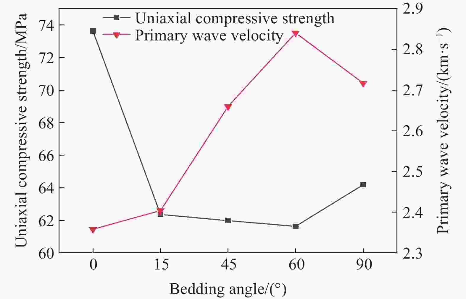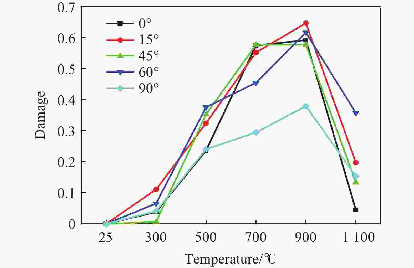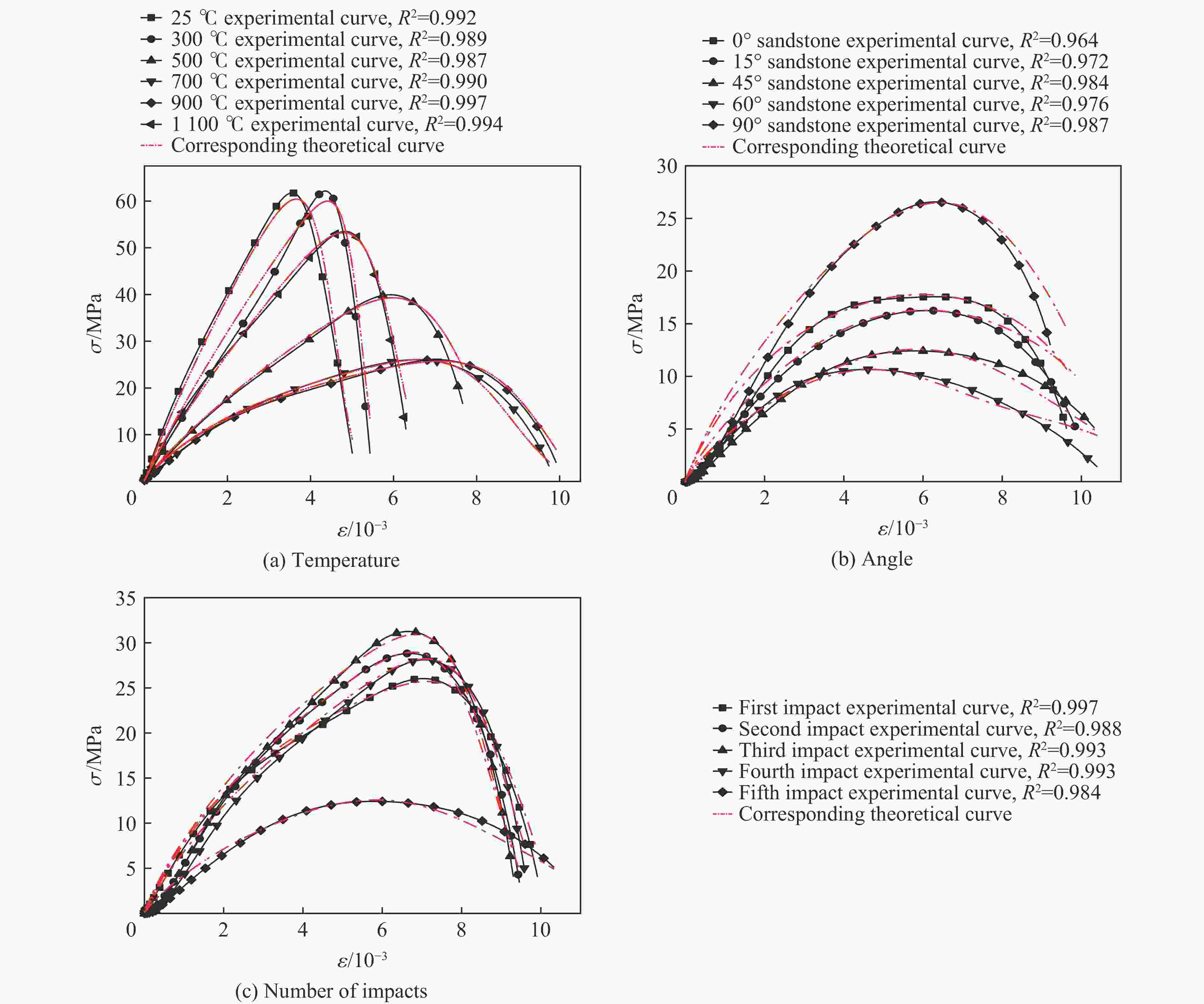 1100 ℃)作用后层理砂岩的物理特性进行测试;其次利用霍普金森压杆(split Hopkinson pressure bar,SHPB)装置开展了循环冲击下高温层理砂岩动力学特性研究;最后,基于层理岩石黏弹性损伤元件模型,构建了考虑高温-冲击荷载耦合损伤的层理岩石动态本构模型,并通过实验数据对模型进行了验证。结果表明:砂岩主要矿物晶体石英的变晶温度处于500~700 ℃之间。温度越高,砂岩表观颜色越深,质量越小,波速和峰值应力先减小后增大。温度对0°、45°层理砂岩造成的损伤更大,900 ℃时损伤最为显著。在1300 V冲击电压下,层理砂岩的峰值应力随冲击次数的增加呈现先升后降的趋势。冲击荷载使高温后的0°层理砂岩更容易破坏,而45°和60°层理砂岩表现出较强的抗冲击能力。模型预测曲线与试验曲线相差较小,表明该模型在描述高温层理砂岩循环冲击力学特性方面具有良好的适用性。Abstract: To investigate the dynamic characteristics and dynamic damage constitutive model of high-temperature bedding sandstone under cyclic impact, the physical properties of bedding sandstone after exposure to 300−1100 ℃ were first examined, and the influence of temperature on the color, mineral composition, mass and wave velocity of the specimens was recorded. Second, the dynamic characteristics of high-temperature bedding sandstone under cyclic impact were studied with a split Hopkinson pressure bar (SHPB) apparatus, and the dynamic responses of bedding sandstone at different strain rates and impact numbers were analyzed. Finally, on the basis of the visco-elastic damage element model for bedding rock, a dynamic constitutive model that accounts for high-temperature-impact-load coupling damage was established and verified against experimental data. The results show that the crystallization temperature of the dominant mineral quartz lies between 500 ℃ and 700 ℃; the higher the temperature, the darker the apparent color of the rock and the lower its mass. With increasing temperature, the wave velocity and peak stress first decrease and then increase. Temperature inflicts greater damage on 0° and 45° bedding sandstone, and the damage is most pronounced at 900 ℃. Under an impact voltage of1300 V, the peak stress of bedding sandstone increases and then decreases with increasing impact number. Impact loading renders 0° bedding sandstone more susceptible to failure after high-temperature exposure, whereas 45° and 60° bedding sandstone exhibit strong impact resistance. The difference between the predicted and experimental curves is small, indicating that the model satisfactorily describes the cyclic-impact mechanical behavior of high-temperature bedding sandstone. The findings provide a valuable theoretical reference for the prevention and control of rock dynamic disasters in complex deep geothermal engineering environments.-