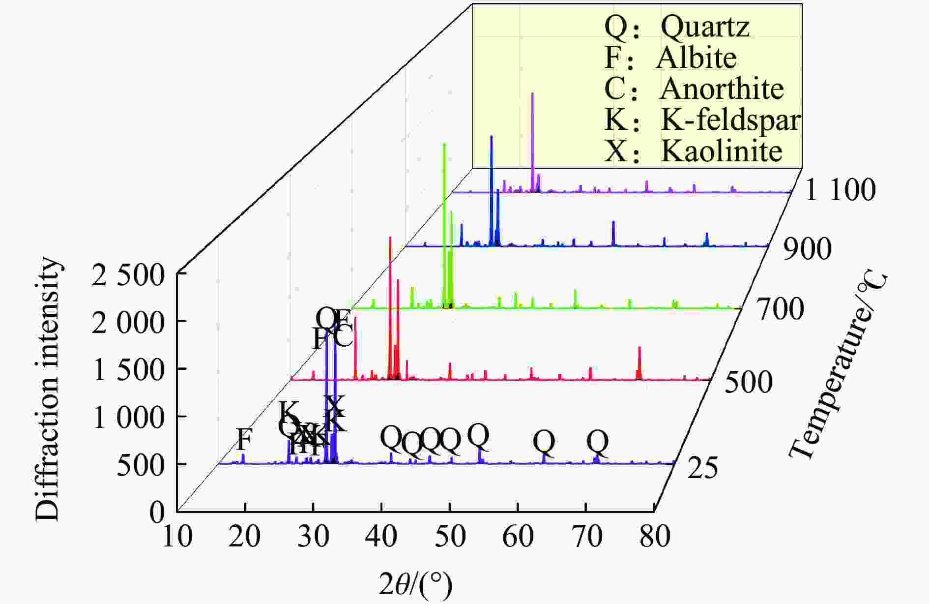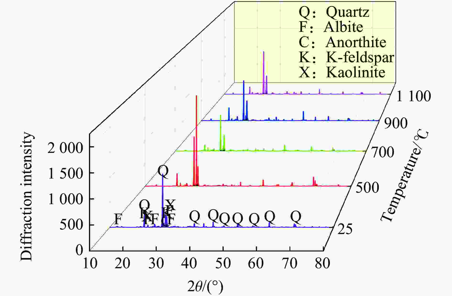 温度/℃ 物质 质量分数/% 25 石英 26.9 钠长石 20.1 钙长石 11.4 钾长石 6.1 高岭石 35.5 500 石英 42.1 钠长石 36.5 高岭石 21.4 700 石英 62.7 钠长石 37.3 900 石英 65.2 钠长石 34.8 1100 石英 73.5 钠长石 26.5 表 3 主要矿物的熔融温度范围