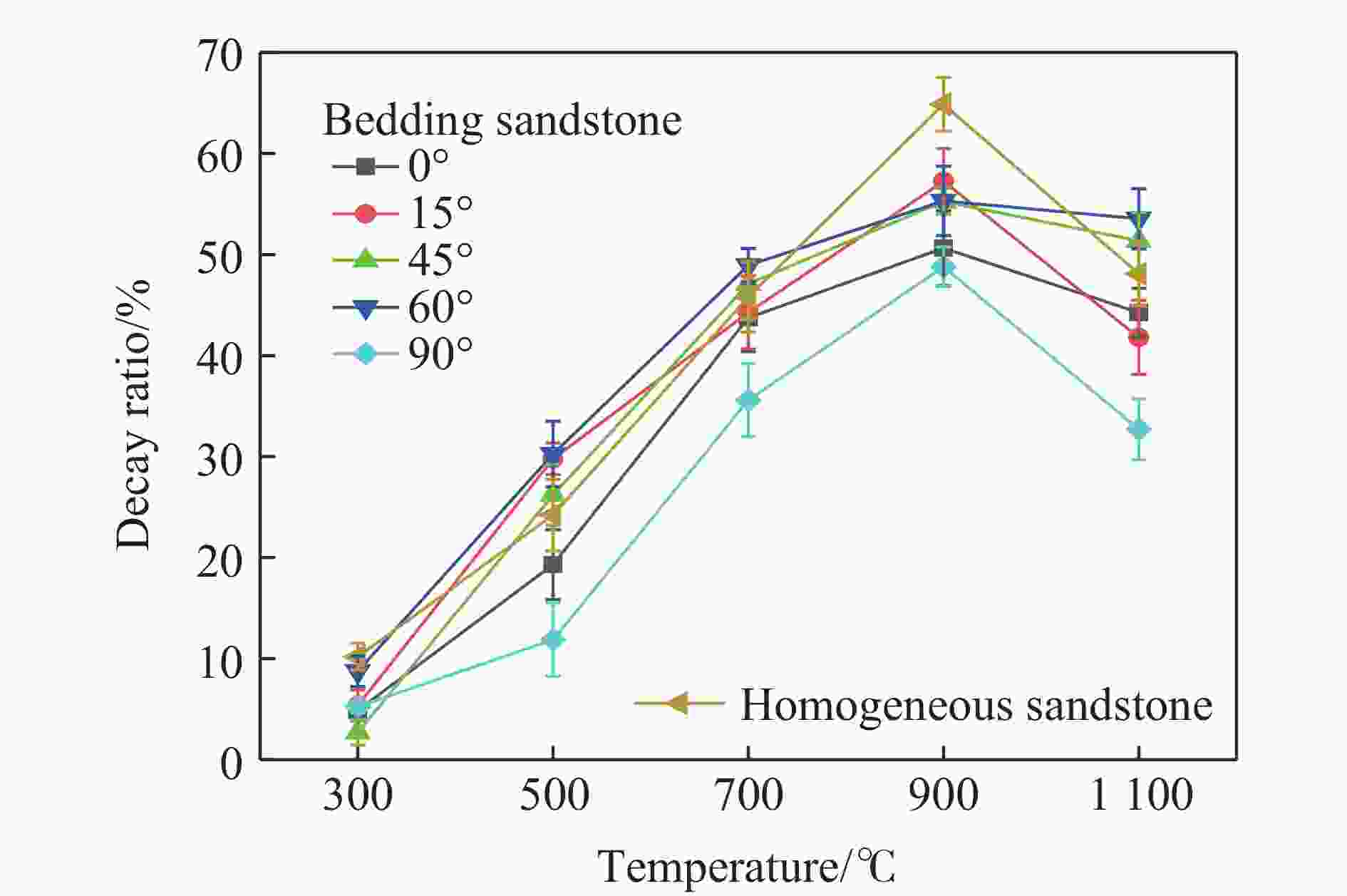 温度/℃ 物质 质量分数/% 25 石英 47.2 钠长石 31.2 钙长石 10.5 钾长石 4.4 高岭石 6.7 500 石英 66.5 钠长石 33.5 700 石英 62.6 钠长石 37.4 900 石英 55.7 钠长石 44.3 1100 石英 62.1 钠长石 37.9 表 2 高温处理后砂岩层理部分的主要矿物成分