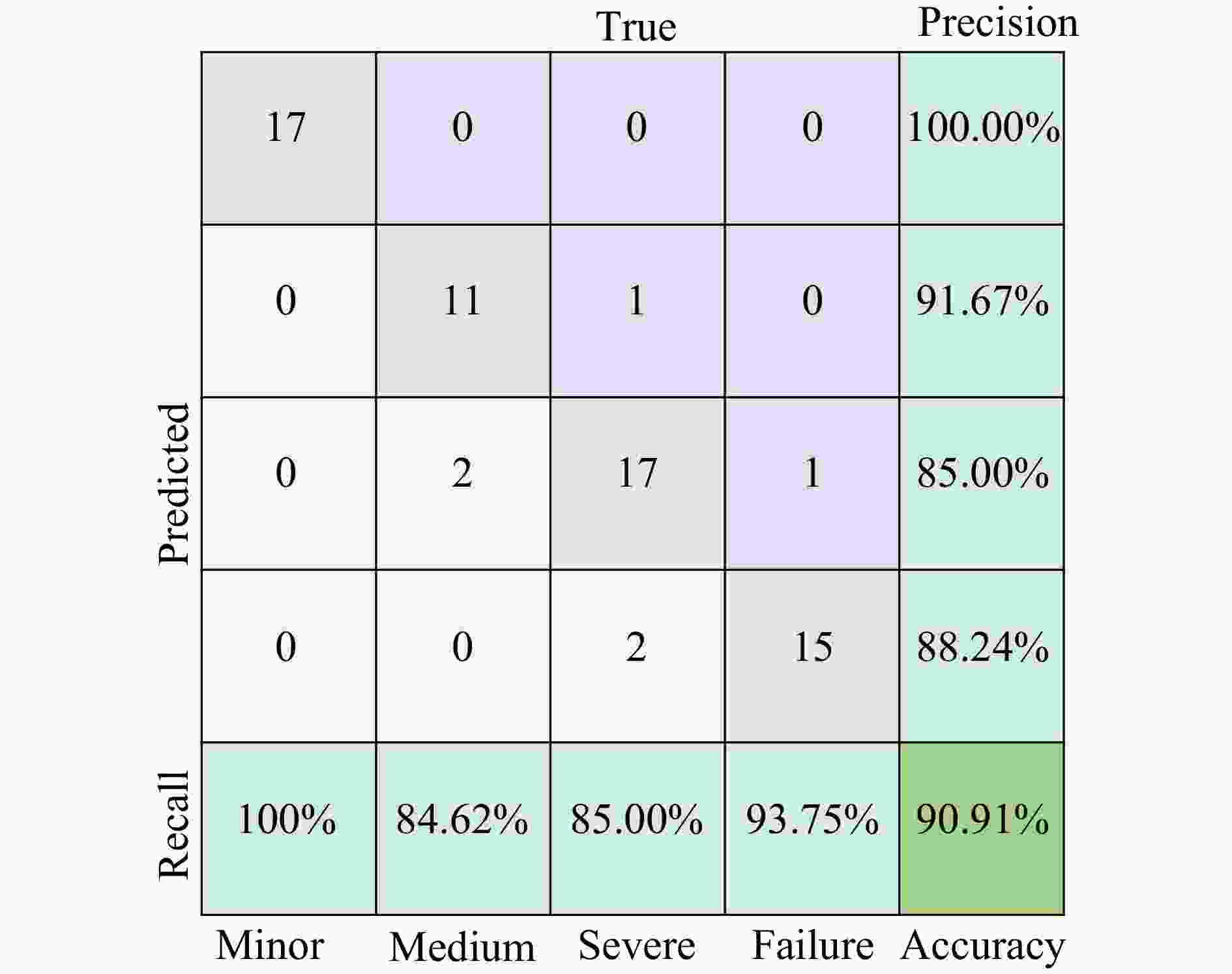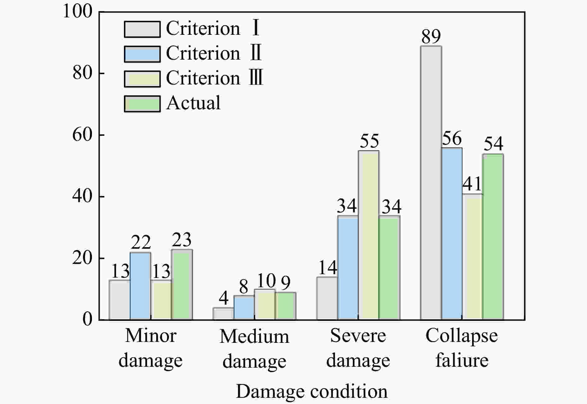 准则 Acc/% P/% Rc/% F1 Ka Ⅰ 59.17 60.70 48.20 0.54 0.331 Ⅱ 95.00 92.92 90.10 0.92 0.925 Ⅲ 74.17 76.51 71.65 0.74 0.625 表 8 基于损伤评估数据集的简化模型分类指标
