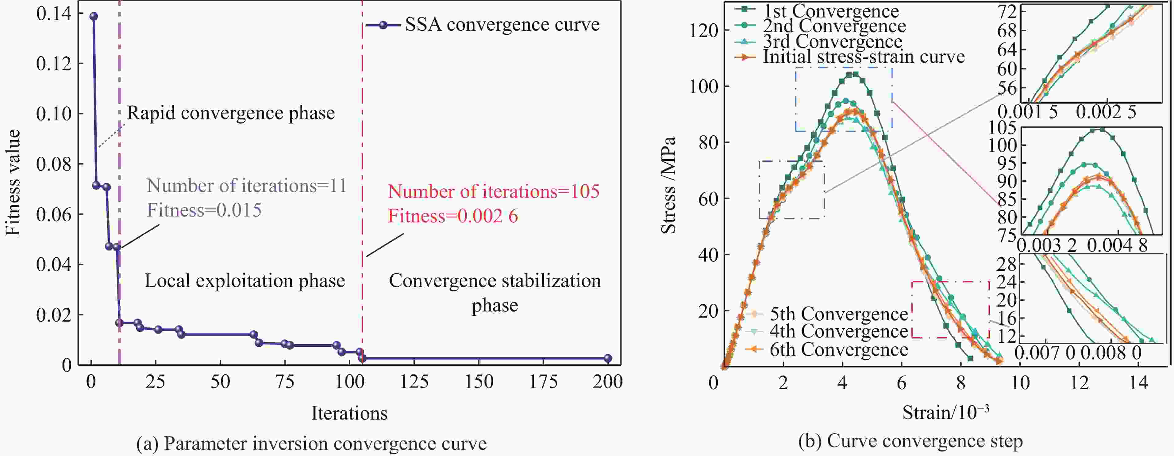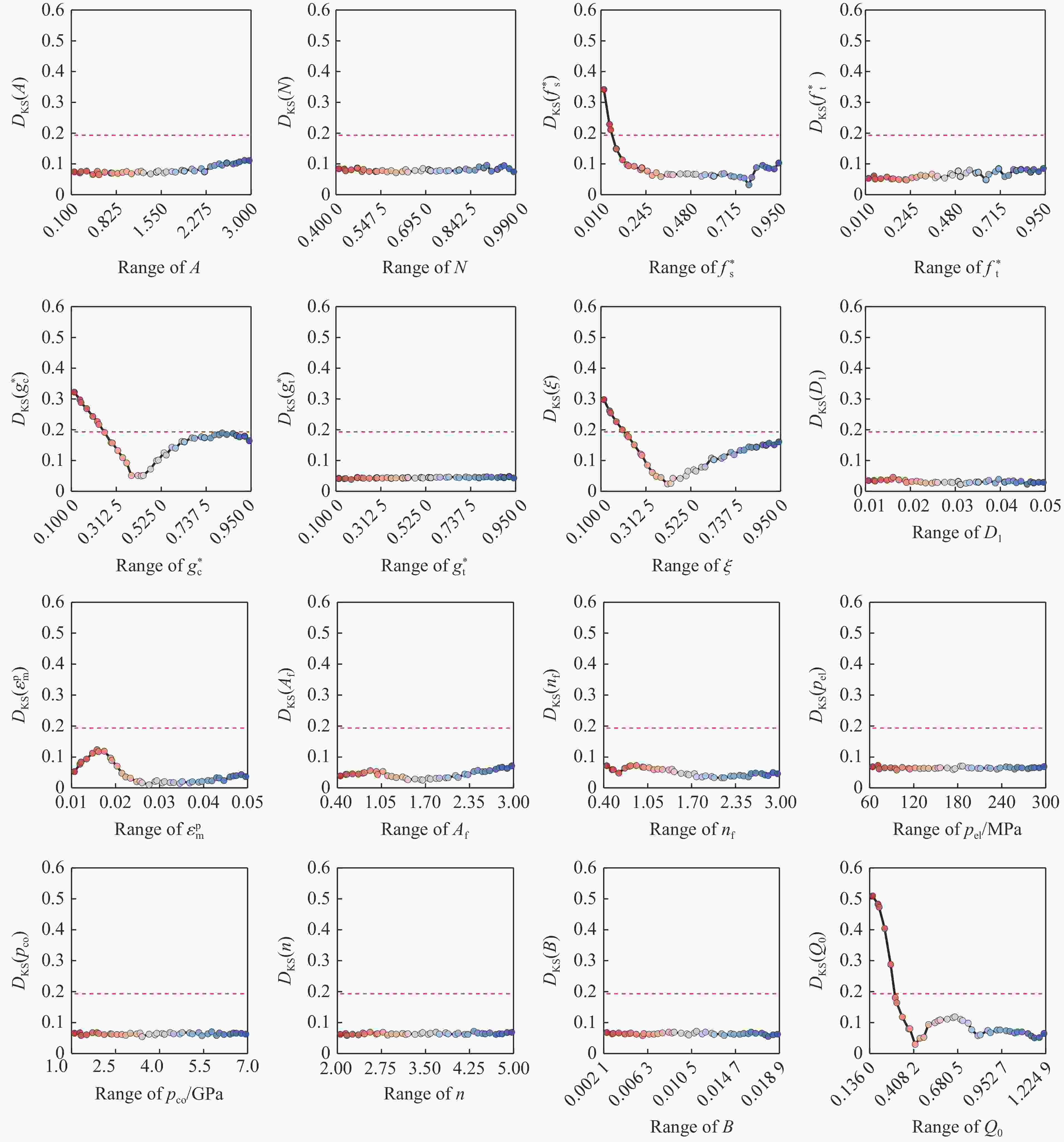 参数 范围 参数 范围 A [0.1, 3] Af [0.2, 3] N [0.4, 1] nf [0.2, 3] $ f_{\text{s}}^{\text{*}} $ [0.01, 0.95] $ \varepsilon _{\text{m}}^{\text{p}} $ [0.01, 0.05] $ f_{\text{t}}^{\text{*}} $ [0.01, 0.95] D1 [0.01, 0.05] $ g_{\text{c}}^{\text{*}} $ [0.1, 0.95] B [ 0.0021 ,0.0189 ]$ g_{t}^{\text{*}} $ [0.1, 0.95] Q0 [0.136, 1.224] $ \xi $ [0.1, 0.95] pco/GPa [1, 7] n [2, 5] pel/MPa [60, 300] 表 4 待反演参数上下限