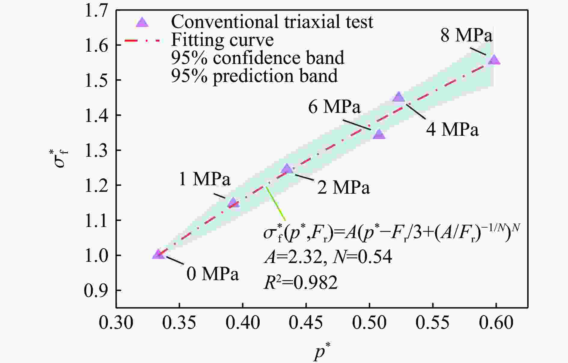 参数(单位) 符号 参数(单位) 符号 密度(g/cm3) ρ0 压缩屈服面参数 $ g_{\text{c}}^{\text{*}} $ 抗压强度(MPa) fc 拉伸屈服面参数 $ g_{\text{t}}^{\text{*}} $ 孔隙压缩压力(MPa) pel 压缩应变率指数 βc 孔隙压实压力(GPa) pco 拉伸应变率指数 βt 初始孔隙度 α0 相对抗剪强度 $ f_{\text{s}}^{*} $ 孔隙度指数 n 相对抗拉强度 $ f_{\text{t}}^{*} $ 罗德角相关参数 Q0, B0 剪切模量缩减系数 $ \xi $ 失效面参数 A, N 剪切模量(GPa) G 残余面参数 Af, nf 状态方程参数 B0, B1, T1, T2 损伤参数 D1, D2 Hugoniot多项式系数(GPa) A1, A2, A3 最小等效塑性应变 $ \varepsilon _{\text{m}}^{\text{p}} $ 参考压缩和拉伸应变率 $ {\dot{\varepsilon }}^{\text{c}}{}_{\text{0}} $,$ {\dot{\varepsilon }}^{\text{t}}{}_{\text{0}} $ 压缩应变率 $ {\dot{\varepsilon }}^{\text{c}} $ 拉伸应变率 $ {\dot{\varepsilon }}^{\text{t}} $ 表 2 三轴压缩试验结果