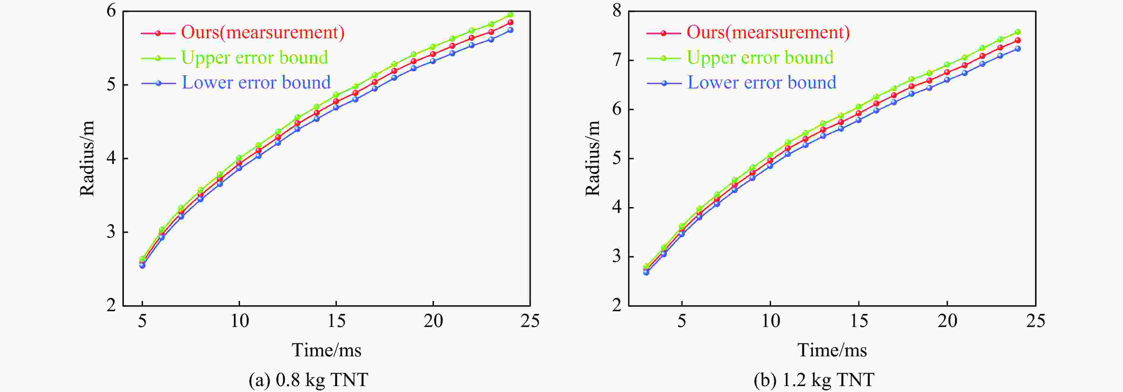 方法 平均绝对误差/pixels 均方误差/pixels $\mathrm{R}^2$ LSM 5.72 8.28 0.86 NSWPM-CFA 3.2 3.0 0.90 SWPM-CFA(Ours) 2.95 2.20 0.94 表 3 0.85 kg TNT 当量条件下本方法测量结果误差统计