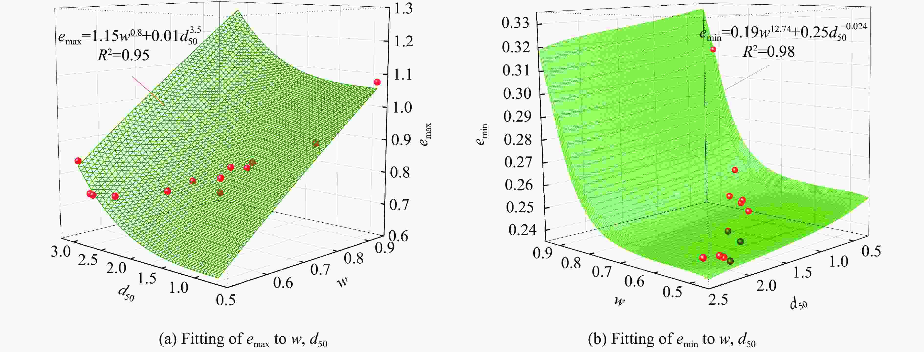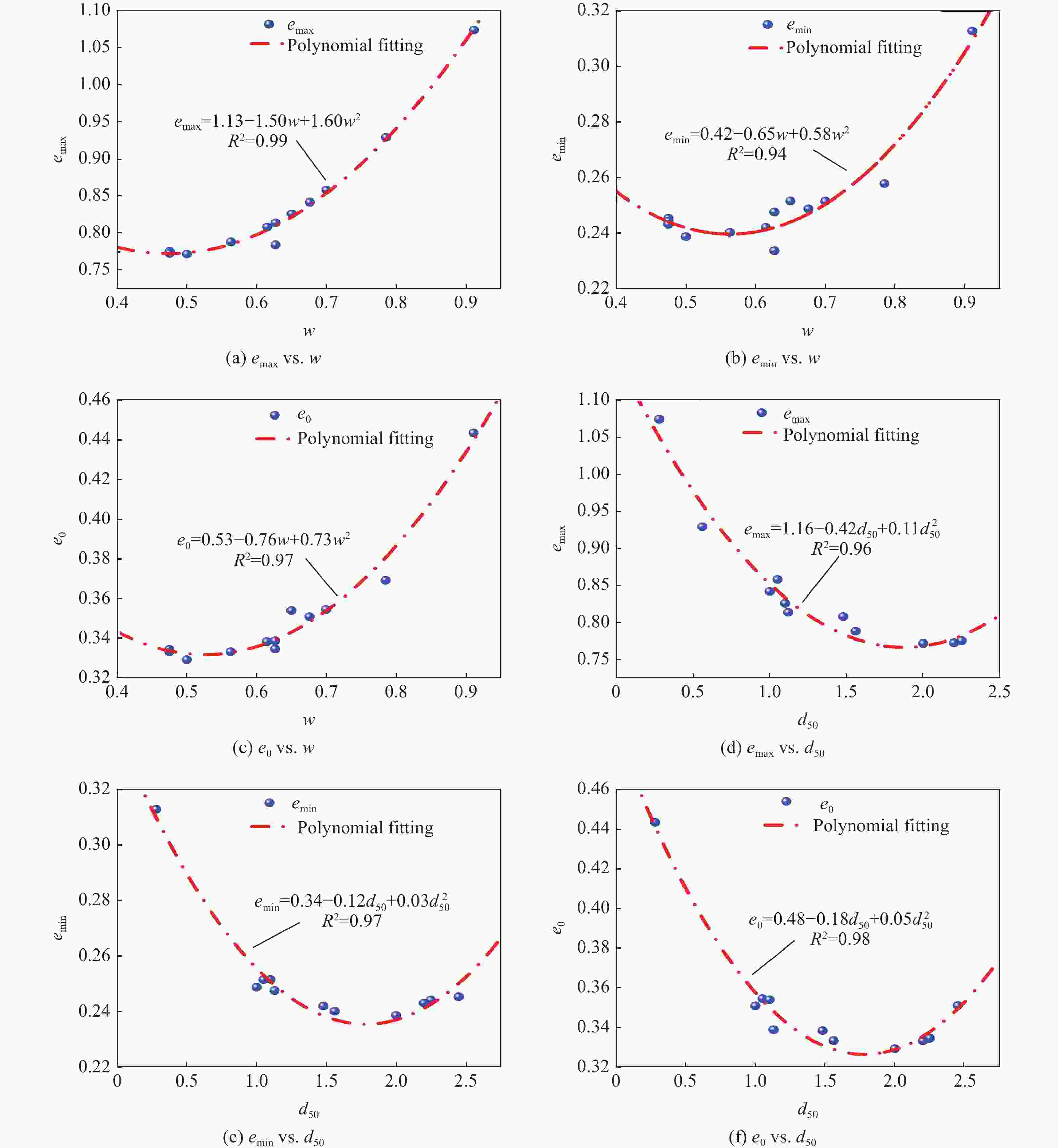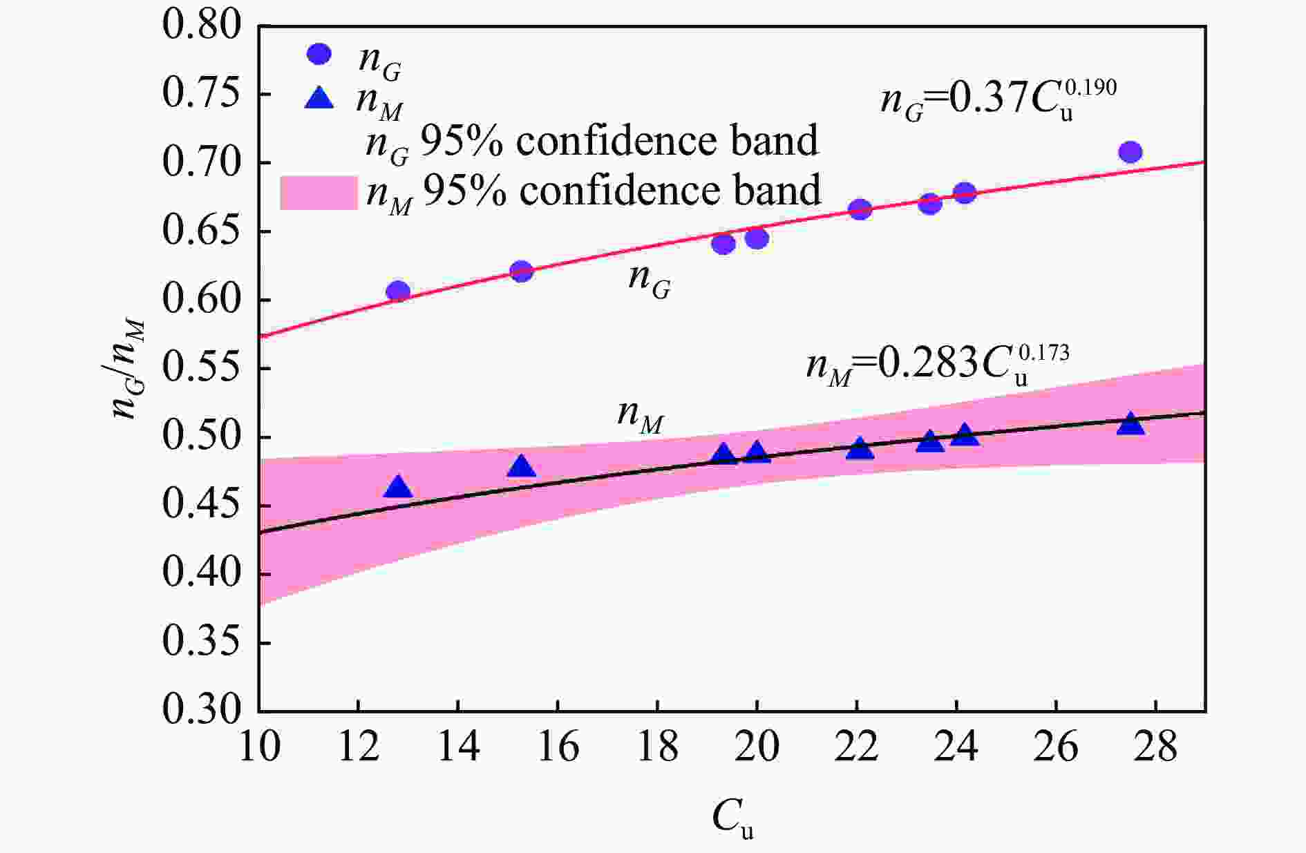试样 dmax/mm w/% ρmax/(g·cm−3) ρmin/(g·cm−3) d50/mm Cu Cc Dr ρs/(g·cm−3) emax emin e0 YS-40 40 47.50 2.224 1.485 2.45 23.53 1.40 0.83 2.050 0.865 0.246 0.351 T-20 20 50.00 2.236 1.563 2.00 20.40 1.33 0.83 2.084 0.772 0.239 0.329 D-20 20 47.50 2.226 1.560 2.25 23.53 1.40 0.83 2.075 0.776 0.244 0.335 X-20 20 62.70 2.22 1.552 1.13 23.47 1.34 0.83 2.069 0.784 0.248 0.339 T-10 10 56.30 2.233 1.549 1.56 15.27 1.19 0.83 2.077 0.788 0.240 0.334 D-10 10 47.50 2.228 1.562 2.20 22.07 1.46 0.83 2.077 0.774 0.243 0.333 X-10 10 78.50 2.202 1.448 0.56 24.17 1.41 0.83 2.023 0.913 0.258 0.369 H-10 10 62.70 2.245 1.515 1.12 23.47 1.34 0.83 2.075 0.828 0.234 0.335 T-5 5 70.00 2.213 1.491 1.05 19.33 2.03 0.83 2.045 0.858 0.252 0.355 D-5 5 61.50 2.230 1.532 1.48 12.80 2.22 0.83 2.070 0.808 0.242 0.338 X-5 5 91.10 2.110 1.331 0.28 27.50 1.72 0.83 1.919 1.082 0.313 0.444 H1-5 5 65.00 2.213 1.493 1.10 22.13 1.42 0.83 2.045 0.855 0.252 0.354 H2-5 5 67.60 2.218 1.497 1.00 20.00 1.35 0.83 2.050 0.850 0.249 0.351 表 2 不同试样模型参数$A_G $、$A_M $与$R^2 $