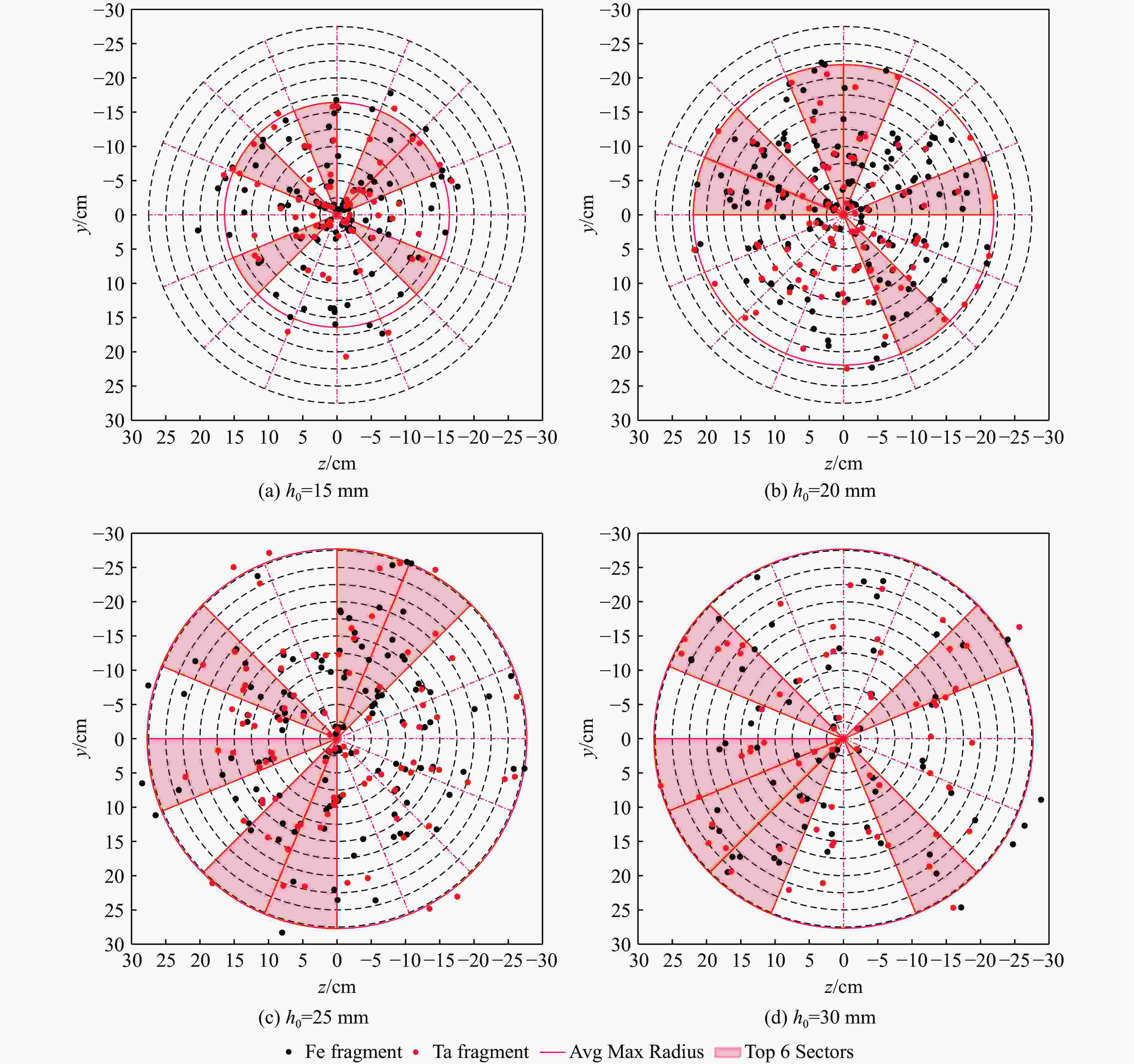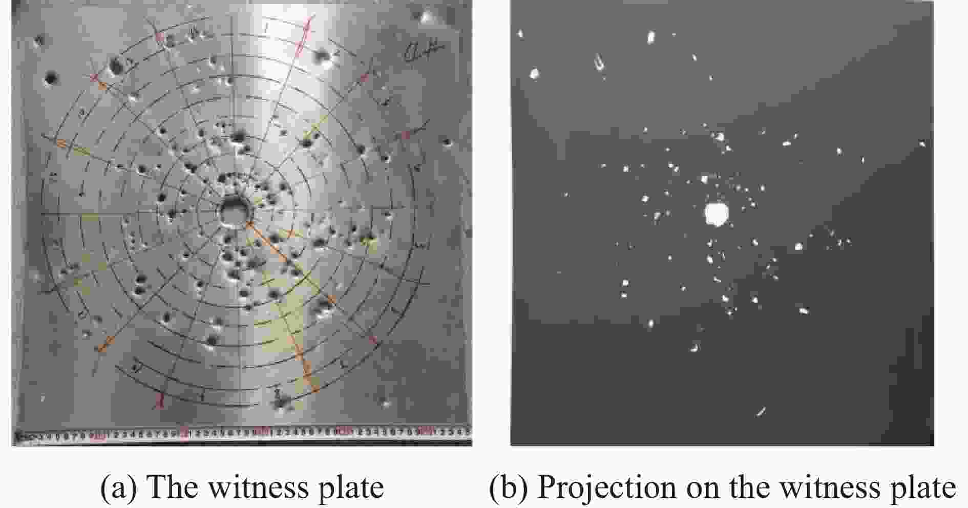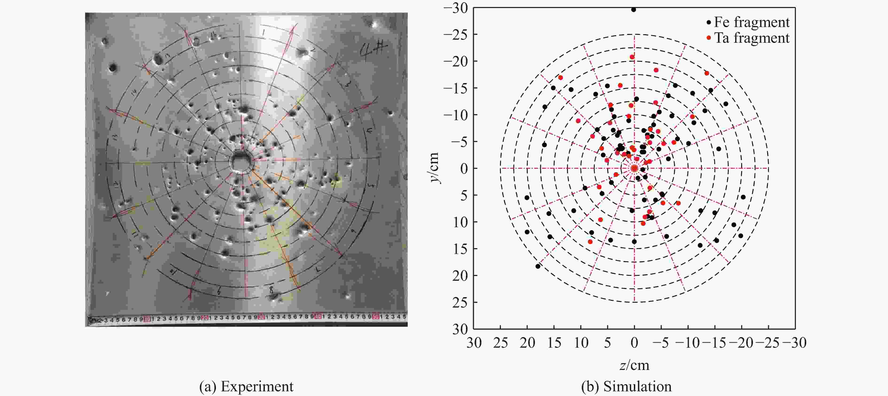 δ/%硬度 Ta_2.5W 223 354 50 130HV 45钢 ≥ 355 ≥ 600 ≥ 16 ≤ 229HBW 材料 ρ0/(g·cm−3) A/MPa B/MPa n c m D1 D2 D3 D4 D5 Ta_2.5W 16.70 211 381 0.75 0.068 0.38 1.355 1.833 -1.93 0.015 1.868 P1/GPa c0/(m·s−1) S1 S2 S3 a γ0 5.6 3410 1.2 0 0 0.42 1.67 表 4 靶后破片云形貌特征尺寸数值模拟与试验对比
