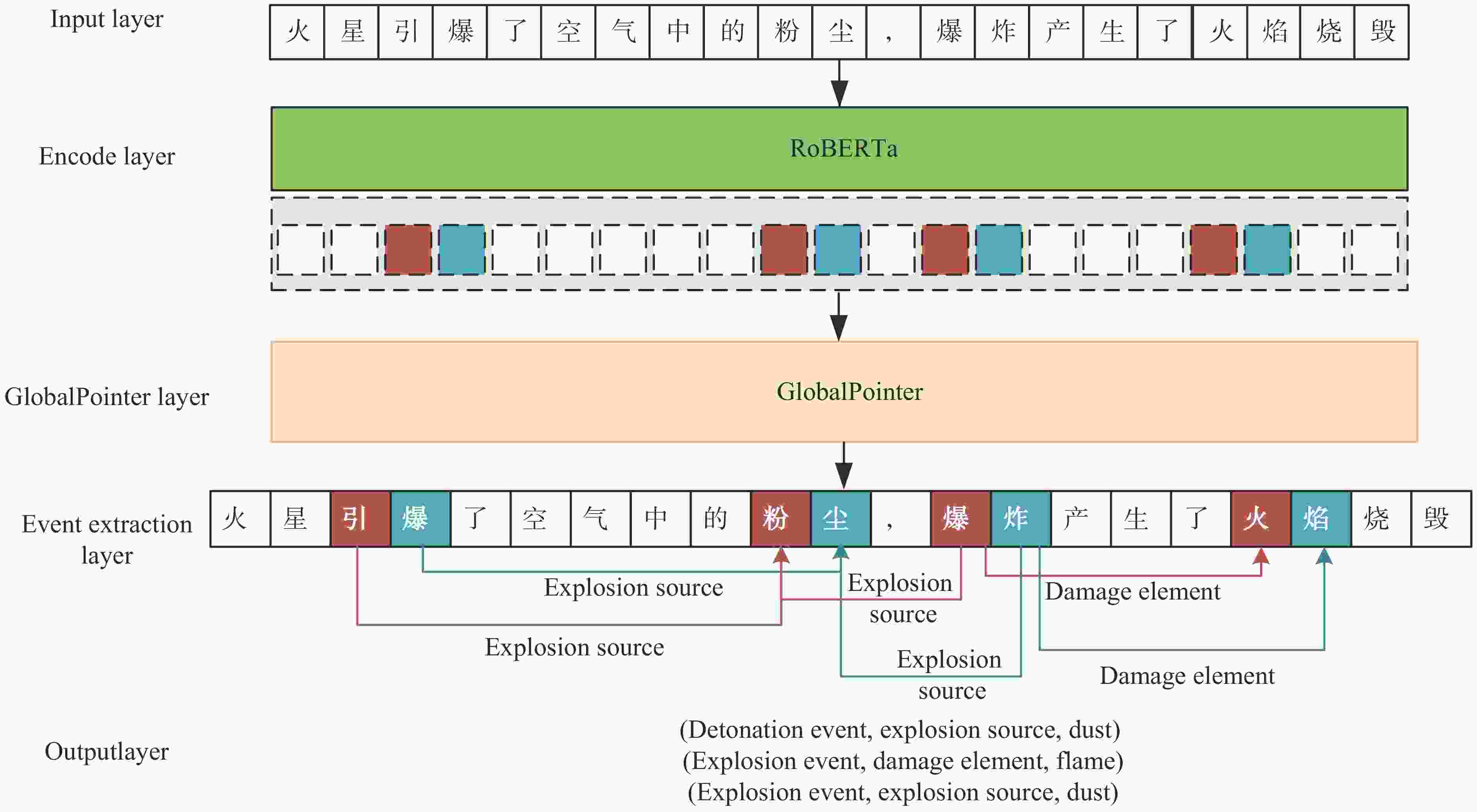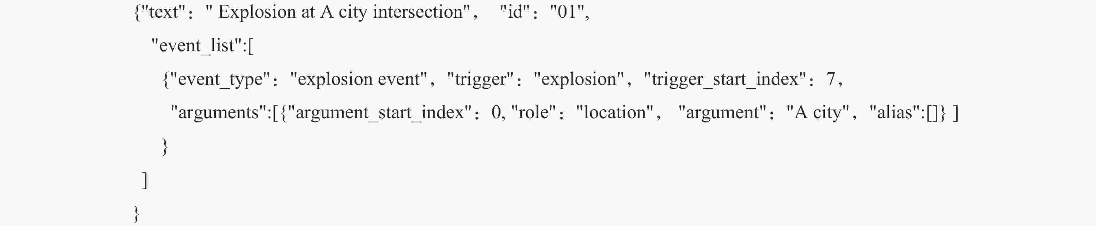 问题 事例 说明 重叠事件 爆炸导致小轿车燃烧 事件类型:爆炸事件、毁伤事件 嵌套事件 爆炸抛出的碎石砸毁了附近的房屋 事件类型:爆炸事件、毁伤事件 表 2 意外爆炸毁伤领域中的事件类型、触发词、论元角色和论元