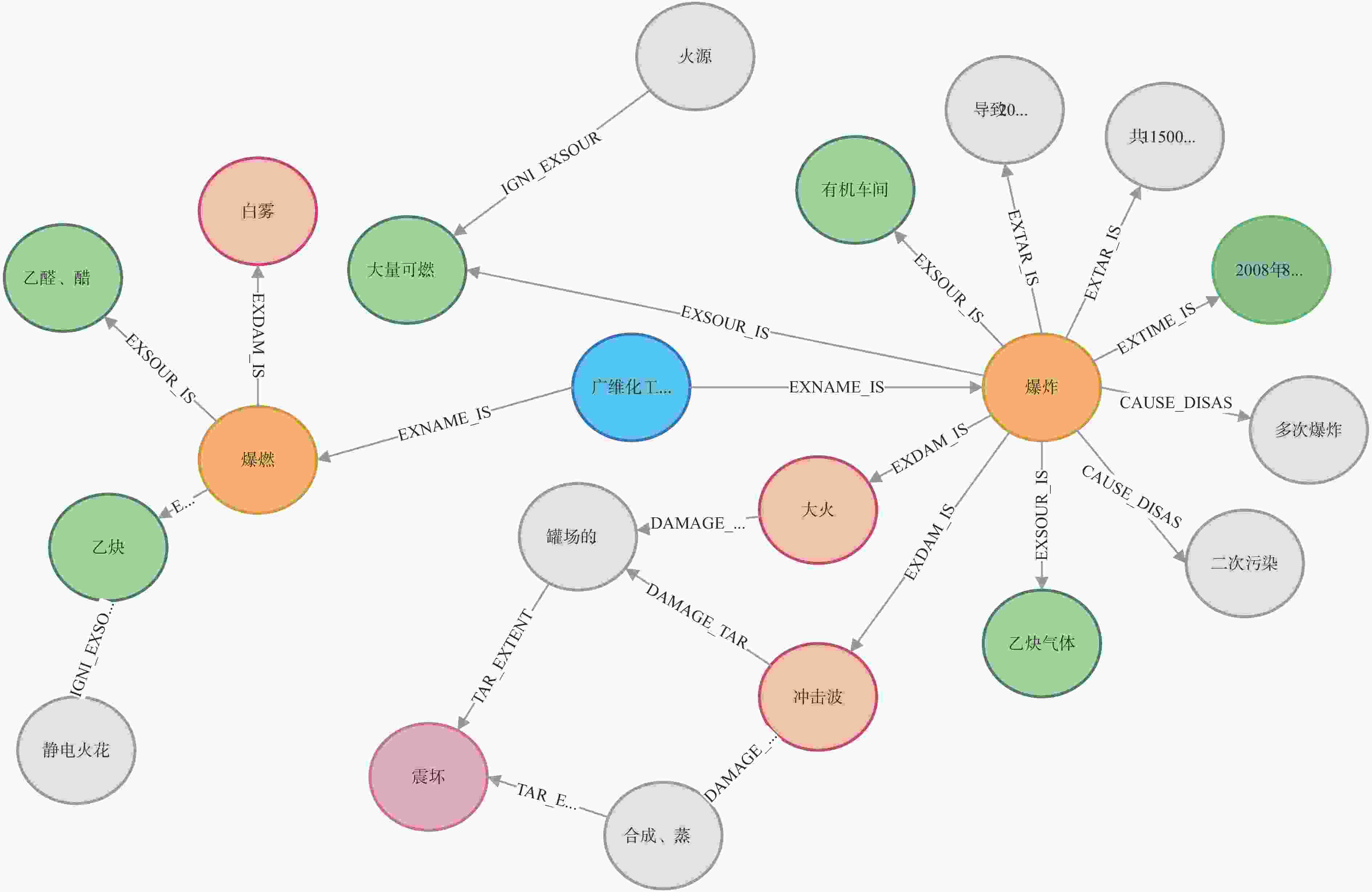头实体 关系 尾实体 爆炸 EXTIME_IS 2008年8月26日6时40分 爆炸 EXTARIS 20人死亡、60受伤 爆炸 EXTAR_IS 厂区附近3km范围18个村屯及工厂职工、家属共 11500 多名群众大火 EXLOC_IS 广西维尼纶集团有限责任公司所属广西广维化工股份有限公司 爆燃 EXDAM_IS 白雾 爆燃 EXSOUR_IS 乙炔、乙醛、醋酸乙烯等易燃易爆气体 静电火花 IGNIEXSOUR 乙炔、乙醛、醋酸乙烯等易燃易爆气体 爆炸 EXSOUR_IS 大量可燃液体和乙炔 火源 IGNI_EXSOUR 大量可燃液体和乙炔 表 7 从报告3中提取的三元组