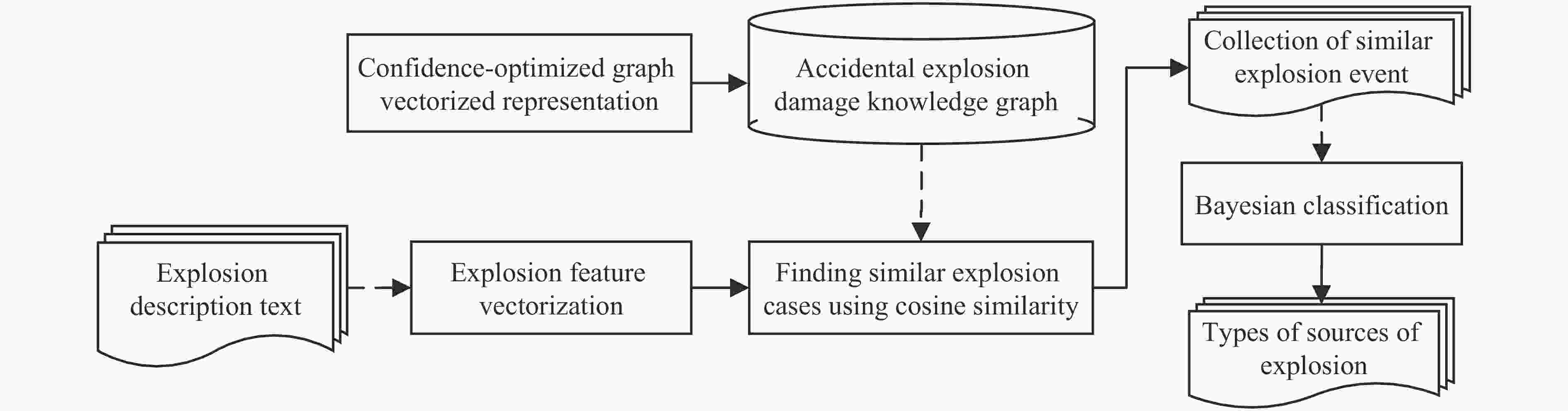 摘要: 利用具有多源、异构、重叠等特征的爆炸事故调查报告建立意外爆炸毁伤知识图谱,对进行数据驱动的爆炸评估以及溯源具有重要作用。针对意外爆炸事故调查数据中存在重叠和嵌套事件的特点,采用以事件联合抽取为核心的知识图谱构建方法以及爆炸调查报告构建了意外爆炸毁伤知识图谱;通过余弦相似度在知识图谱中检索类似爆炸事件并采用贝叶斯分类方法进行分类,较准确地实现了对贝鲁特港口爆炸事故爆炸源物资种类的确定。知识图谱构建结果表明,在意外爆炸毁伤语料库上的事件分类以及事件元素分类分析表明,相较于现有抽取模型,提出的基于动态掩码的事件联合抽取方法的F1值分别提高至少2%和5.4%。溯源分析表明,基于知识图谱的溯源与传统的人工溯源相比,其速度和准确性都有较大的提高。Abstract: Constructing a knowledge graph for accidental explosion damage using investigation reports of explosion accident characterized by multi-source, heterogeneous, and overlapping information plays a significant role in data-driven explosion assessment and traceability analysis. To address the overlapping and nested events in accidental explosion investigation data, a knowledge graph construction method centered on event joint extraction was employed, utilizing explosion investigation reports to build the accidental explosion damage knowledge graph. By retrieving similar explosion events within the knowledge graph using cosine similarity and applying a Bayesian classification method, the type of explosive materials involved in the Beirut port explosion incident was identified with relatively high accuracy. The knowledge graph construction results demonstrate that on the accidental explosion damage corpus, the proposed dynamic masking-based event joint extraction method improved the F1 scores for event classification and event element classification by at least 2% and 5.4%, respectively, compared to existing extraction models. Traceability analysis indicates that knowledge graph-based traceability offers significant improvements in both speed and accuracy compared to traditional manual traceability methods.