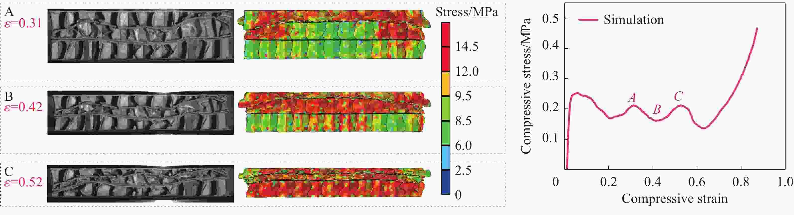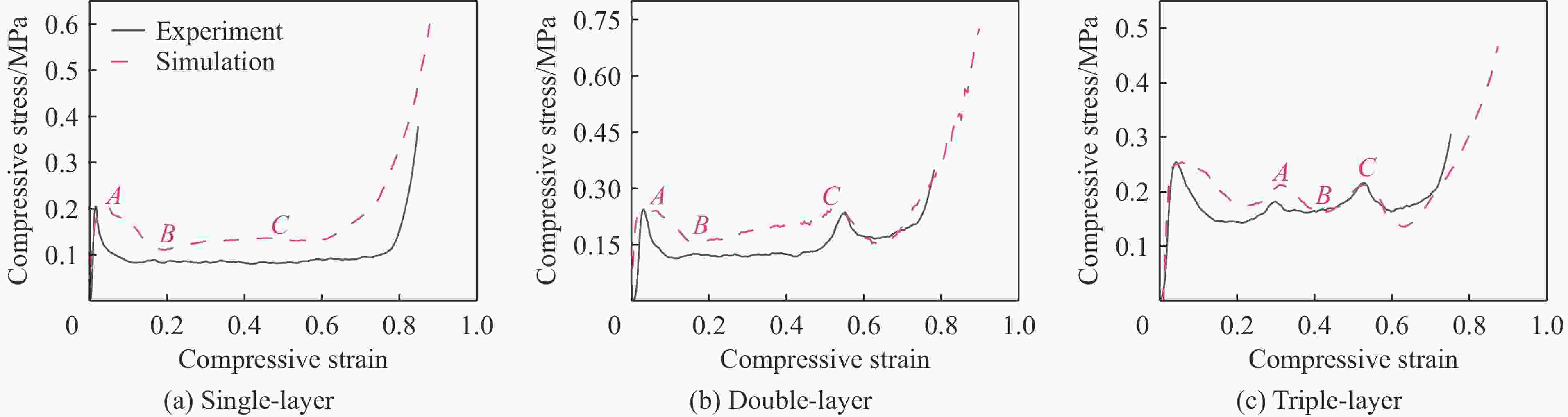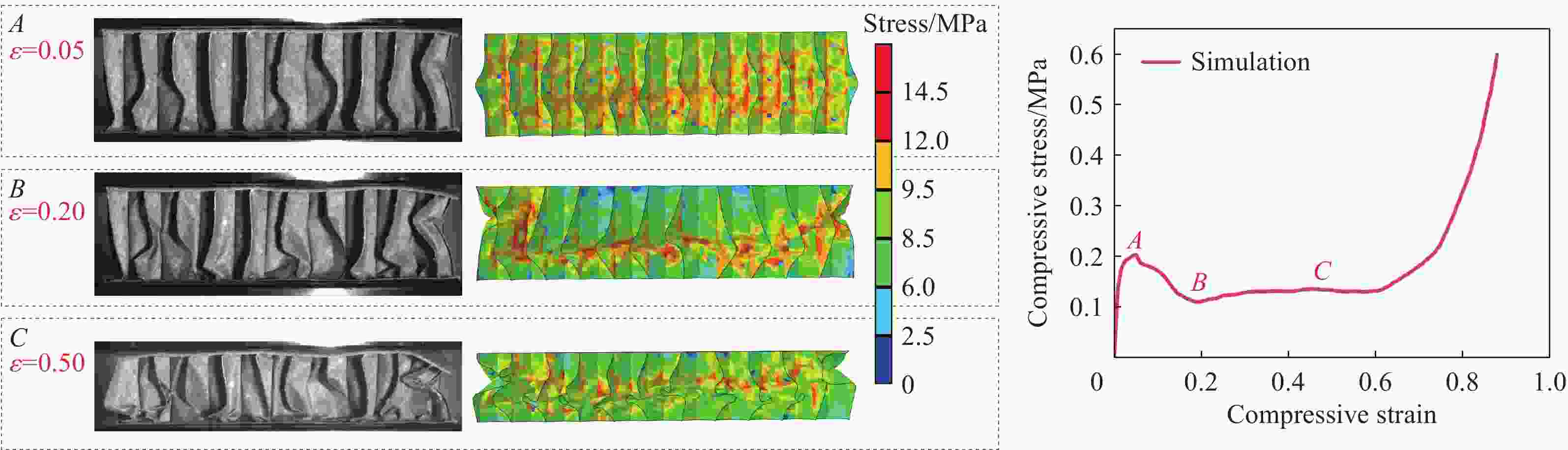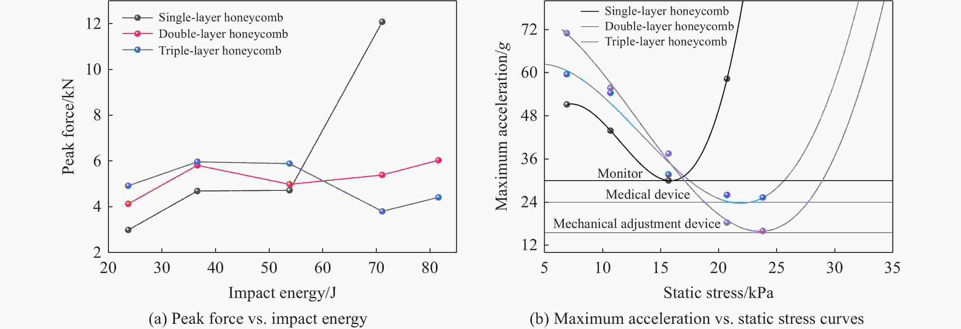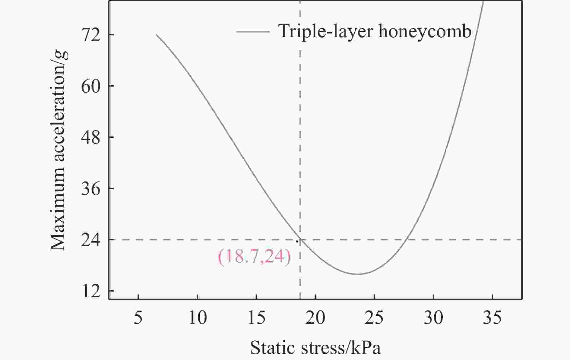 纸蜂窝结构 峰值应力 致密应变 试验/MPa 模拟/MPa 误差/% 试验 模拟 误差/% 单层蜂窝 0.203 0.202 0.5 0.74 0.71 4 双层蜂窝 0.244 0.241 1.1 0.73 0.74 1.3 三层蜂窝 0.253 0.254 0.3 0.73 0.72 1.3 表 6 落锤试验最大加速度-静应力结果