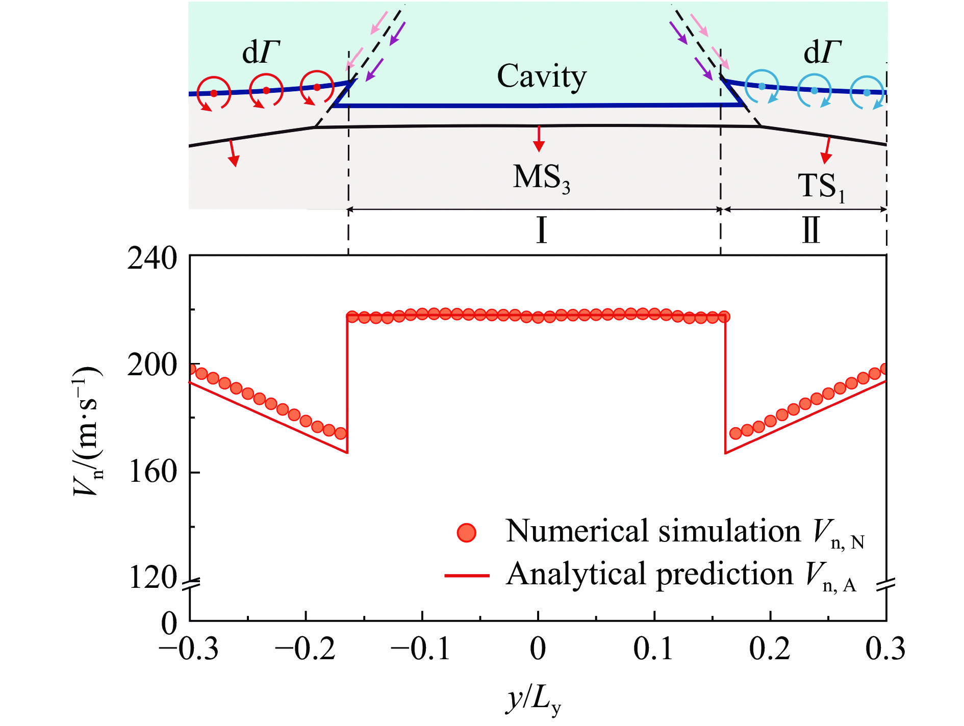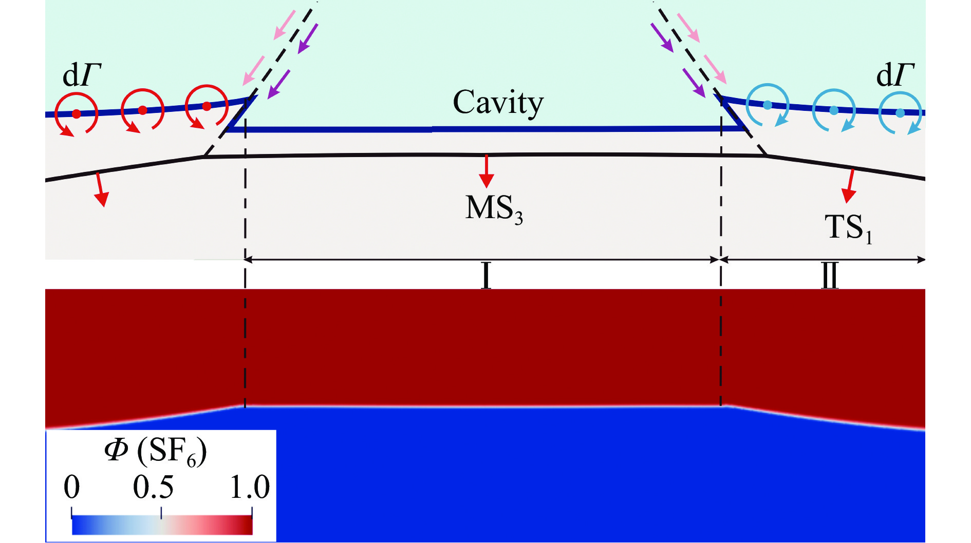 采用数值模拟与理论分析相结合的方法,研究了马赫反射波系与平面SF6/N2界面的作用过程,特别关注其中马赫反射波系的入射加载阶段。在入射平面激波马赫数为1.8的情况下,给出了绕刚体圆柱后形成马赫反射波系的数值纹影,定性分析了马赫反射波系入射加载重/轻界面的波系演化过程。运用三激波理论对折射过程进行分析求解,结果表明该理论解可以良好预测折射后的激波形态以及界面上的环量沉积和速度扰动。进一步,通过绘制激波极曲线和稀疏波特征线,直观描述了入射加载过程中波系前后的压力变化和气流偏转。理论分析和数值模拟结果均表明,马赫反射波系中激波强度以及入射角的差异诱导了界面上的纵向速度扰动,激波加载带来的切向速度诱导了界面上的环量沉积,速度扰动和环量主导了重/轻界面前期的演化。
