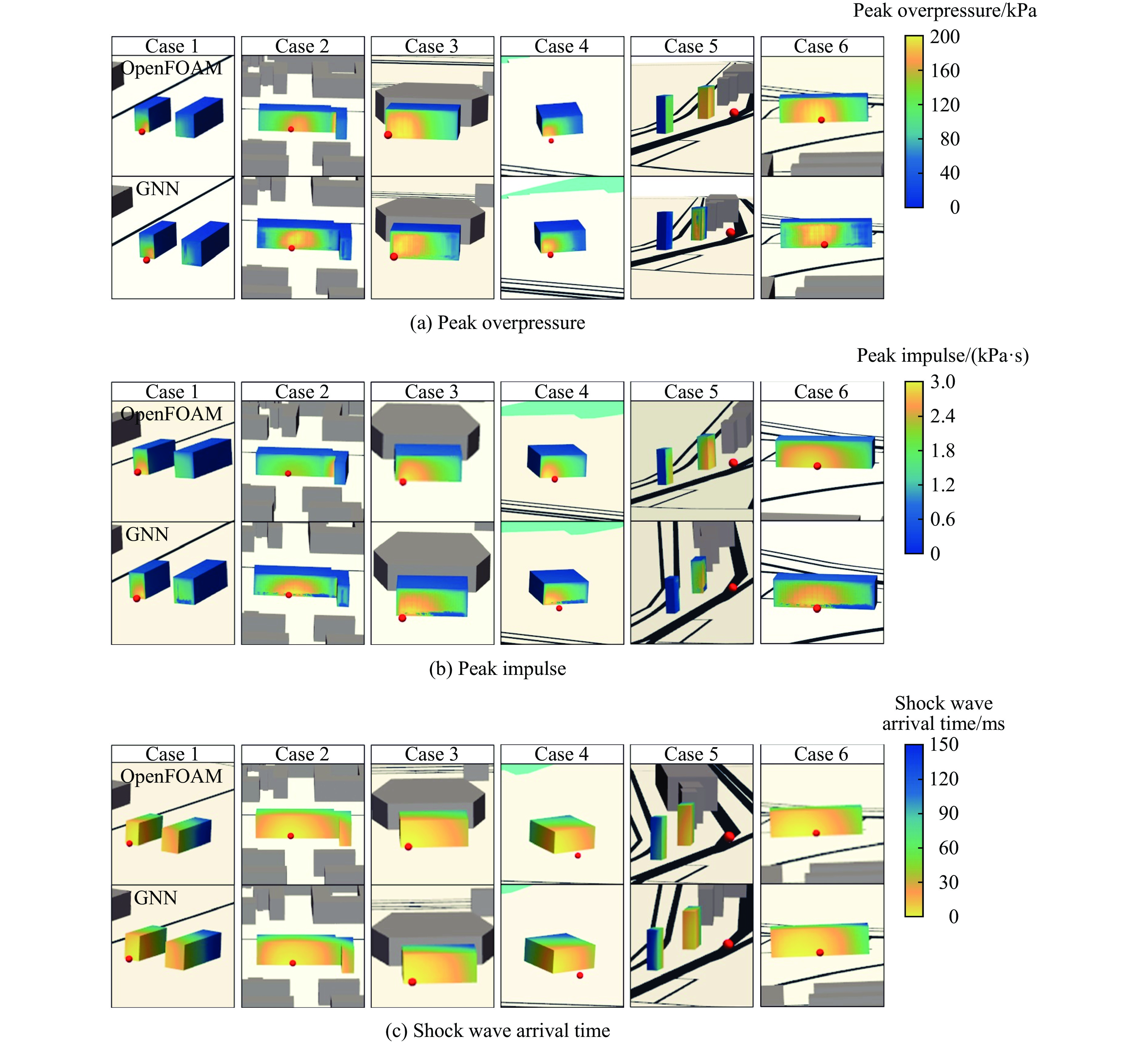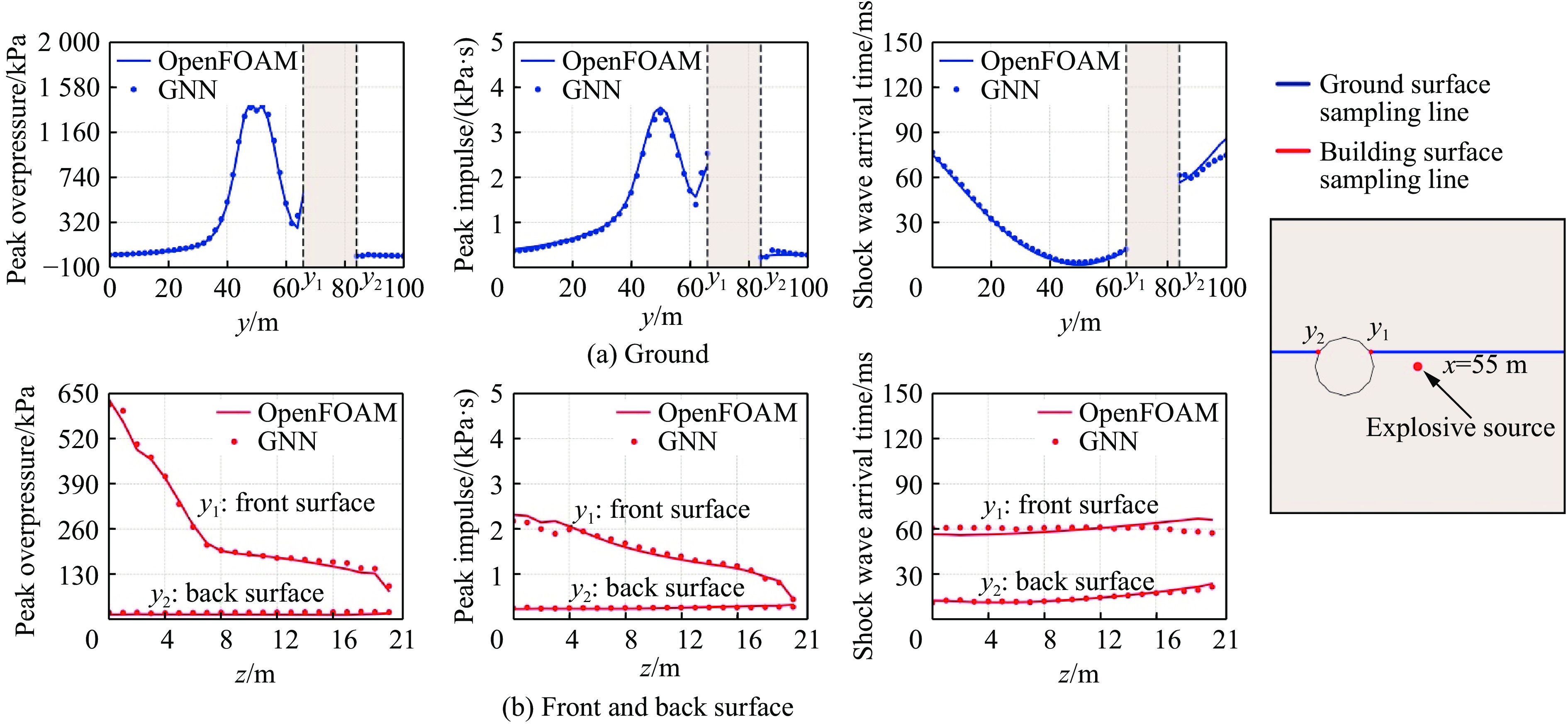 为准确预测建筑外爆威力场,解决传统经验公式中未能充分考虑环境因素的复杂性而导致的精度受限、数值仿真在处理大规模城市场景时效率低下的难题,构建了一种基于图神经网络(graph neural network, GNN)的爆炸威力场预测模型,直接利用建筑的几何特征,对其表面的爆炸峰值超压、峰值冲量及冲击波到达时间等三维物理场的进行预测。与数值仿真结果的对比验证表明,本文模型展现出了卓越的预测性能:对不同几何结构的单体建筑表面超压参数的预测均方误差为0.97%;对复杂几何建筑、建筑群落建筑表面超压参数的平均预测误差为3.17%;当应用于实际城市区域时,平均预测误差为1.29%;物理场单次预测耗时不超过0.6 s,与数值仿真相比速度提升3~4个数量级。基于模型的高精度预测,不仅可以重构建筑表面任意位置的超压时程曲线,还能准确评估结构的毁伤程度。