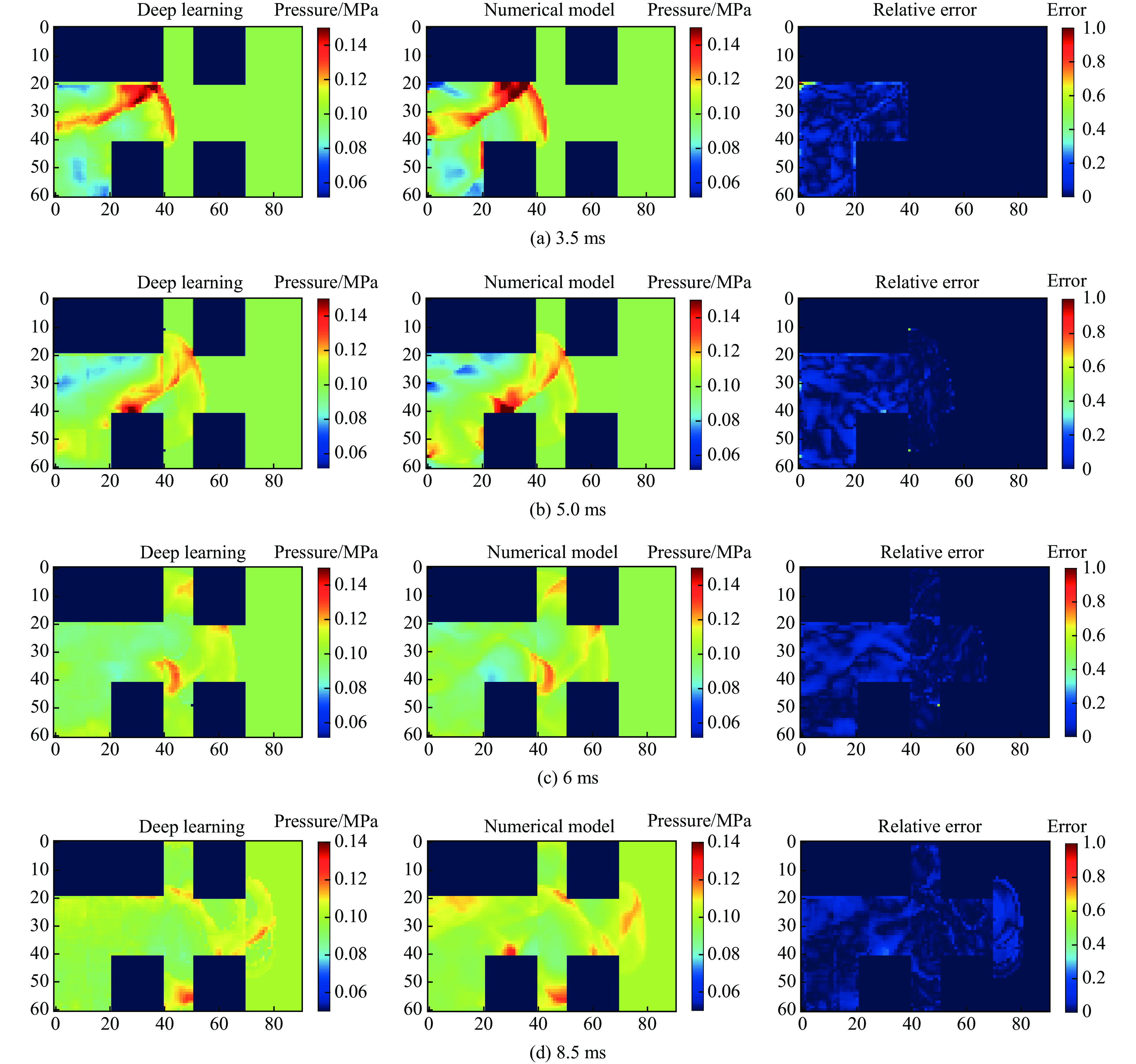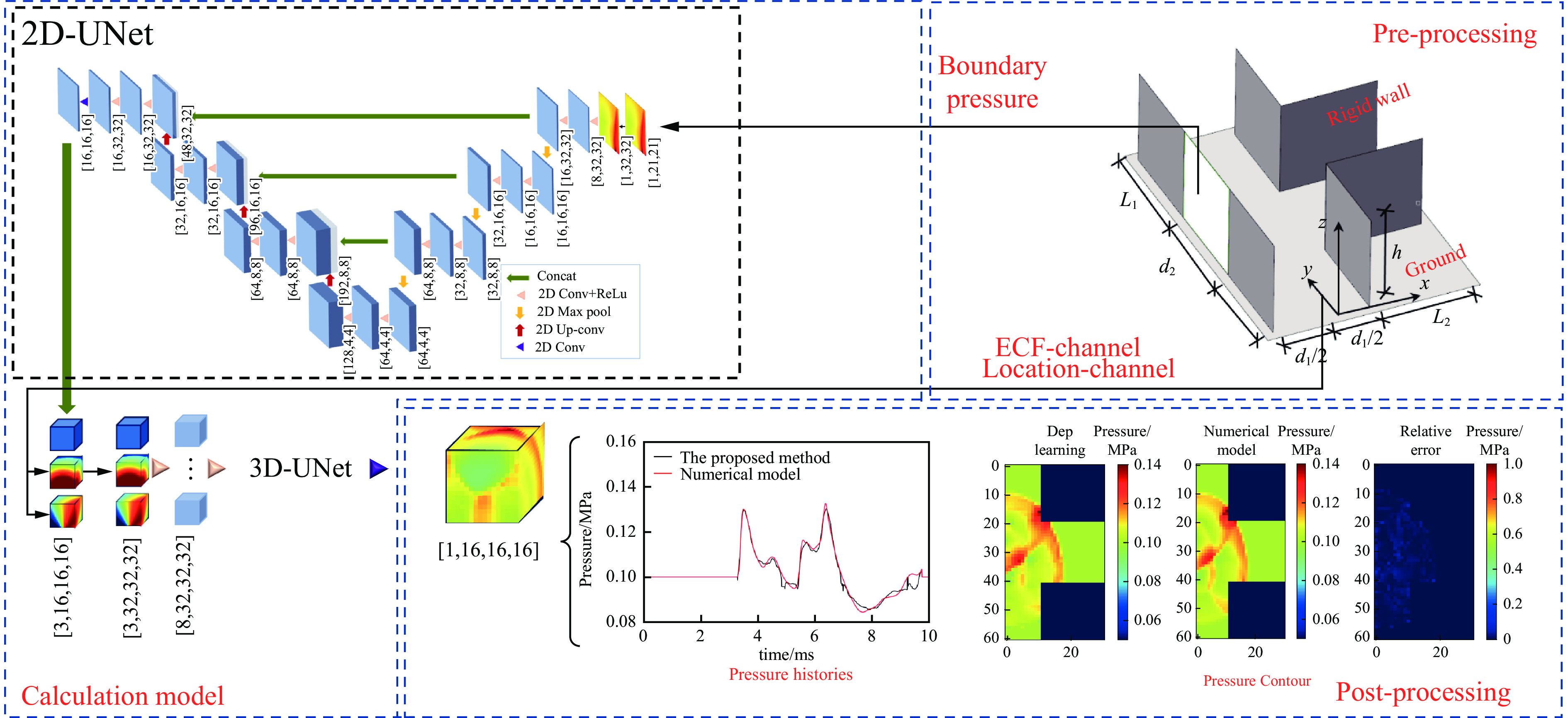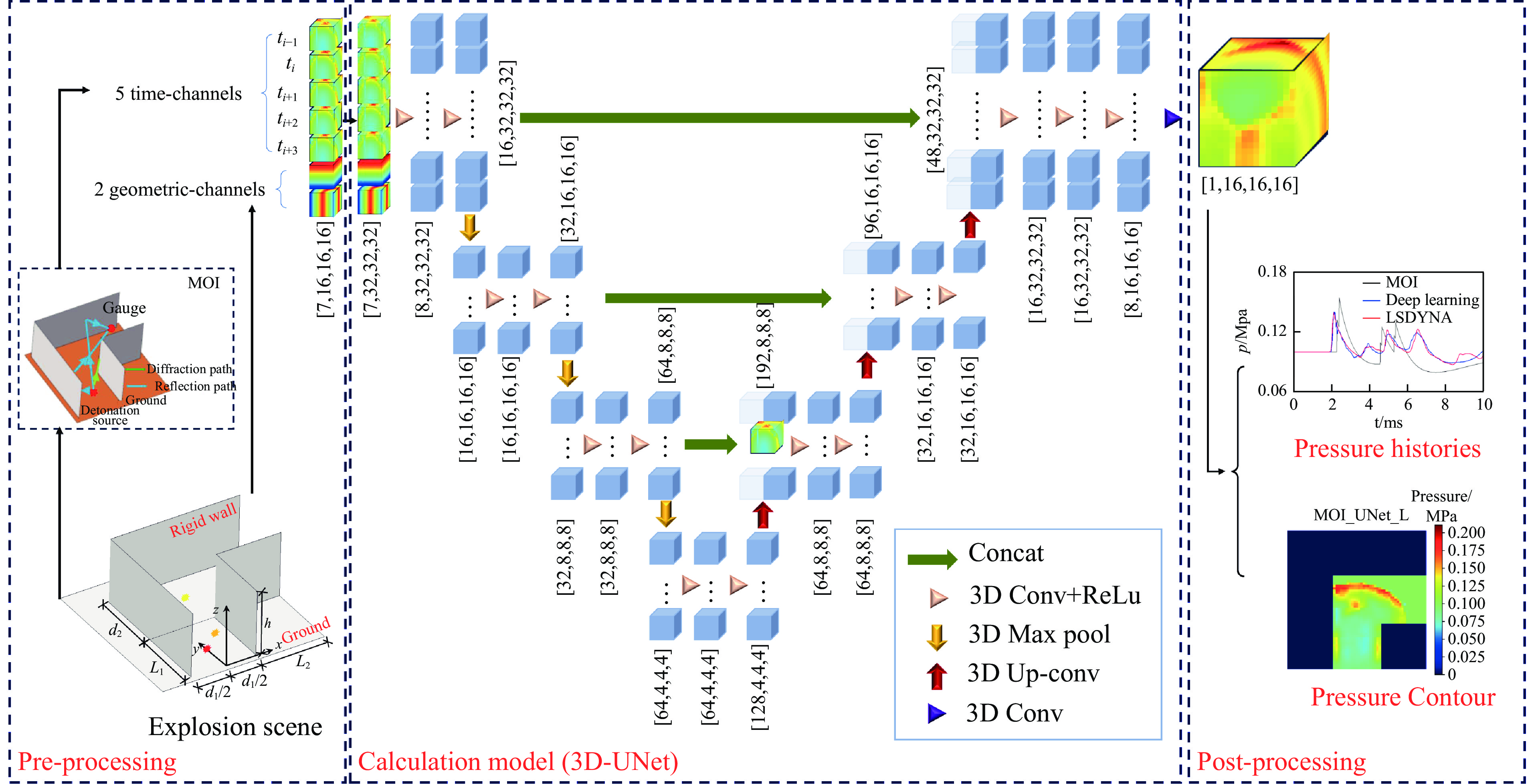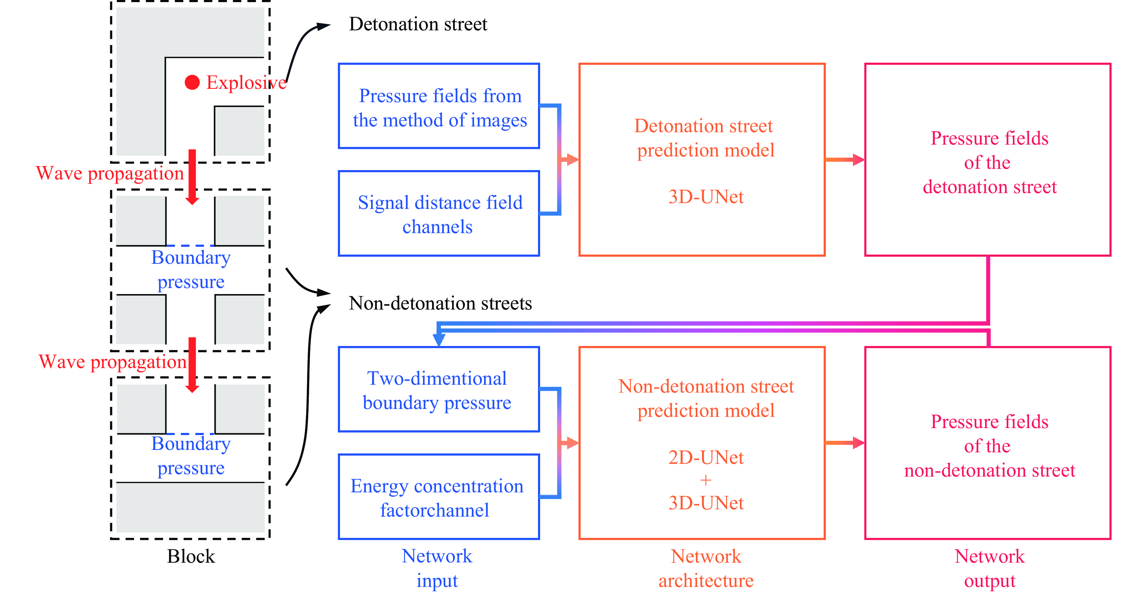 快速准确地评估复杂街区爆炸荷载对实现高效结构抗爆设计及灾后损伤评估具有重要意义,然而传统经验公式、物理模型及数值模拟方法难以兼顾计算效率与预测精度,现有深度学习爆炸荷载预测模型尚难以用于复杂街区场景。为实现复杂街区爆炸荷载快速准确计算,提出了一种物理信息和数据融合驱动的复杂街区爆炸荷载预测方法,其基本思想是“空间分区、逐步推理”策略,分别针对起爆街道和非起爆街道构建快速网络预测模型,并通过各街道间的边界压力协同工作。两种网络预测模型通过分别引入镜像爆源方法、信号距离场和能量密度因子融合流场关键物理特征,并分别采用3D-UNet网络、2D-UNet联合3D-UNet组成的级联网络作为架构。基于验证后的数值模拟方法生成了两种网络的目标数据,并开展了对应模型训练。模型预测性能的评估结果表明:该方法能够准确预测复杂街区压力场的时空演化过程,在起爆街道和非起爆街道中的流场预测结果与数值模拟结果的相对误差在20%以内,有效描述了流场中指定位置的压力时程。双网络协同方法的推理耗时约为对应数值模拟方法计算时间的2%,单一时刻流场数据存储代价小于对应D3PLOT文件的0.2%,显著降低了计算与数据存储代价。研究为大型复杂街区爆炸荷载快速评估提供了新方法,可为城市建筑抗爆设计和评估提供高效决策支持。