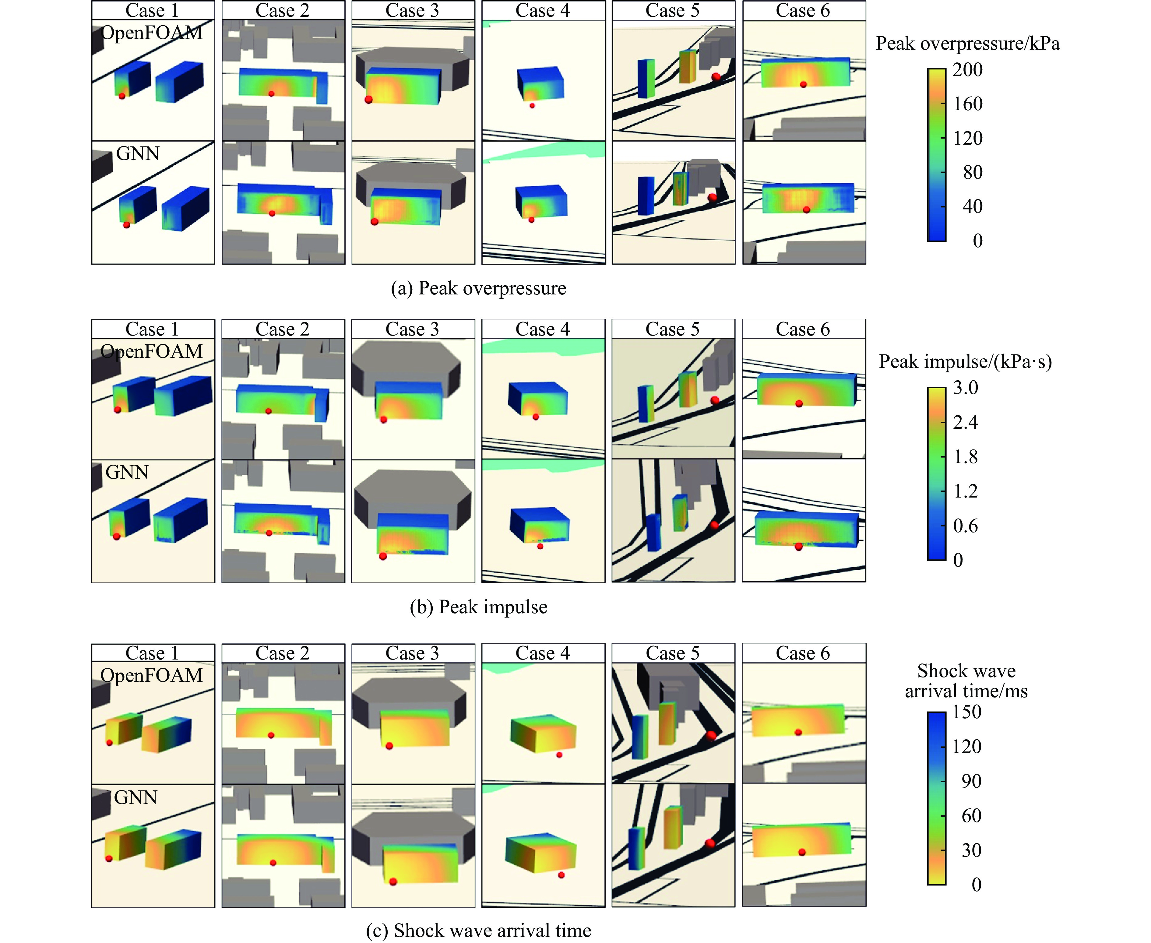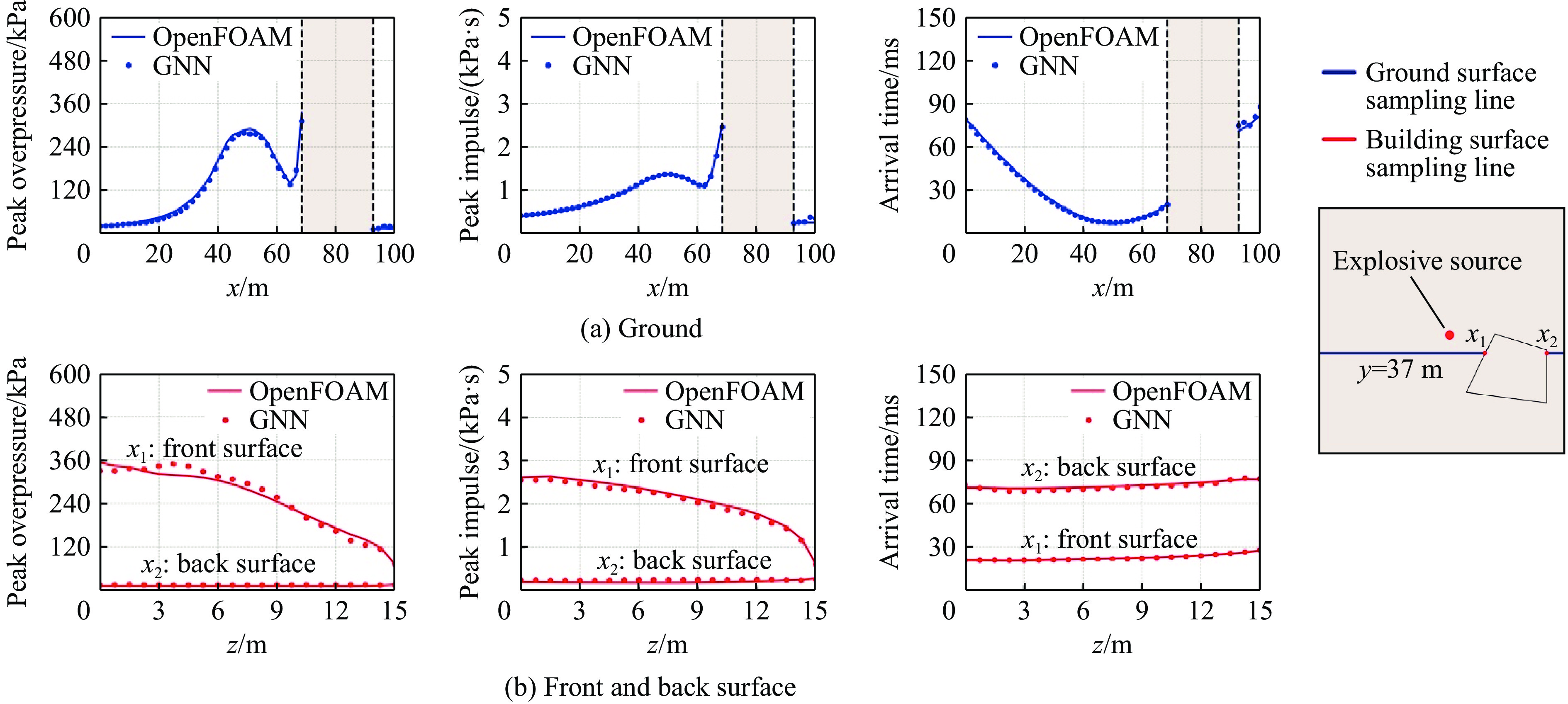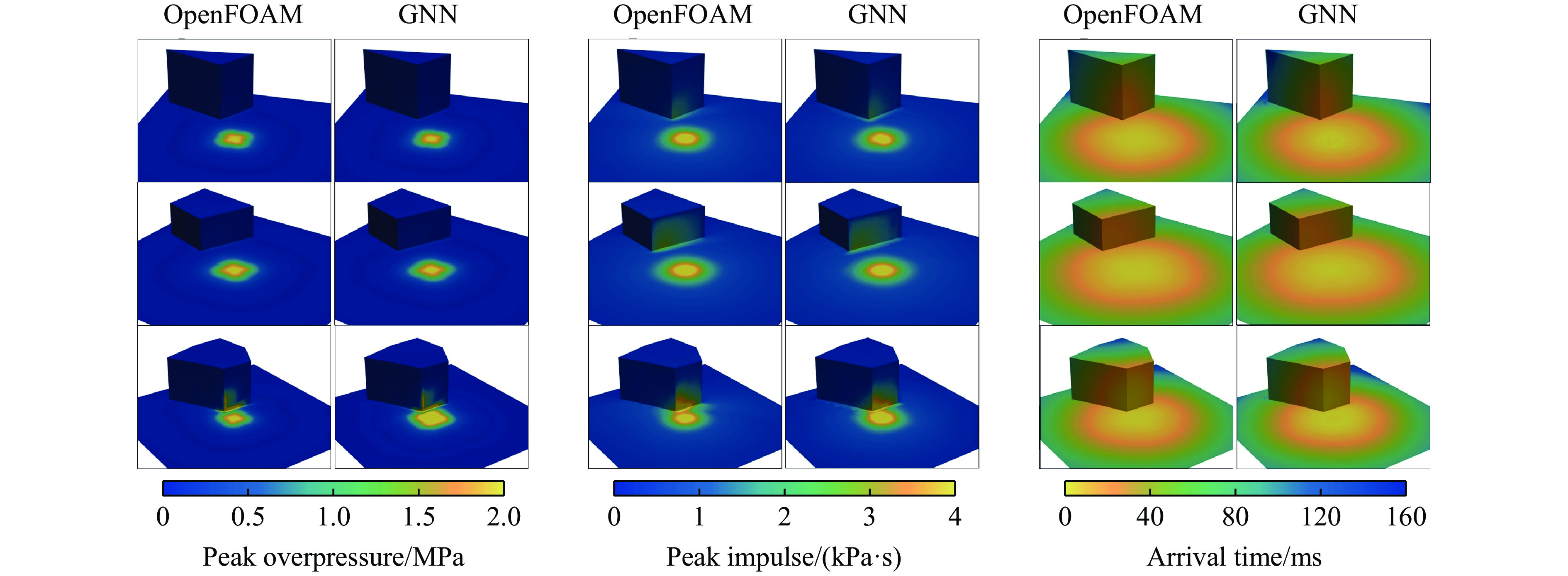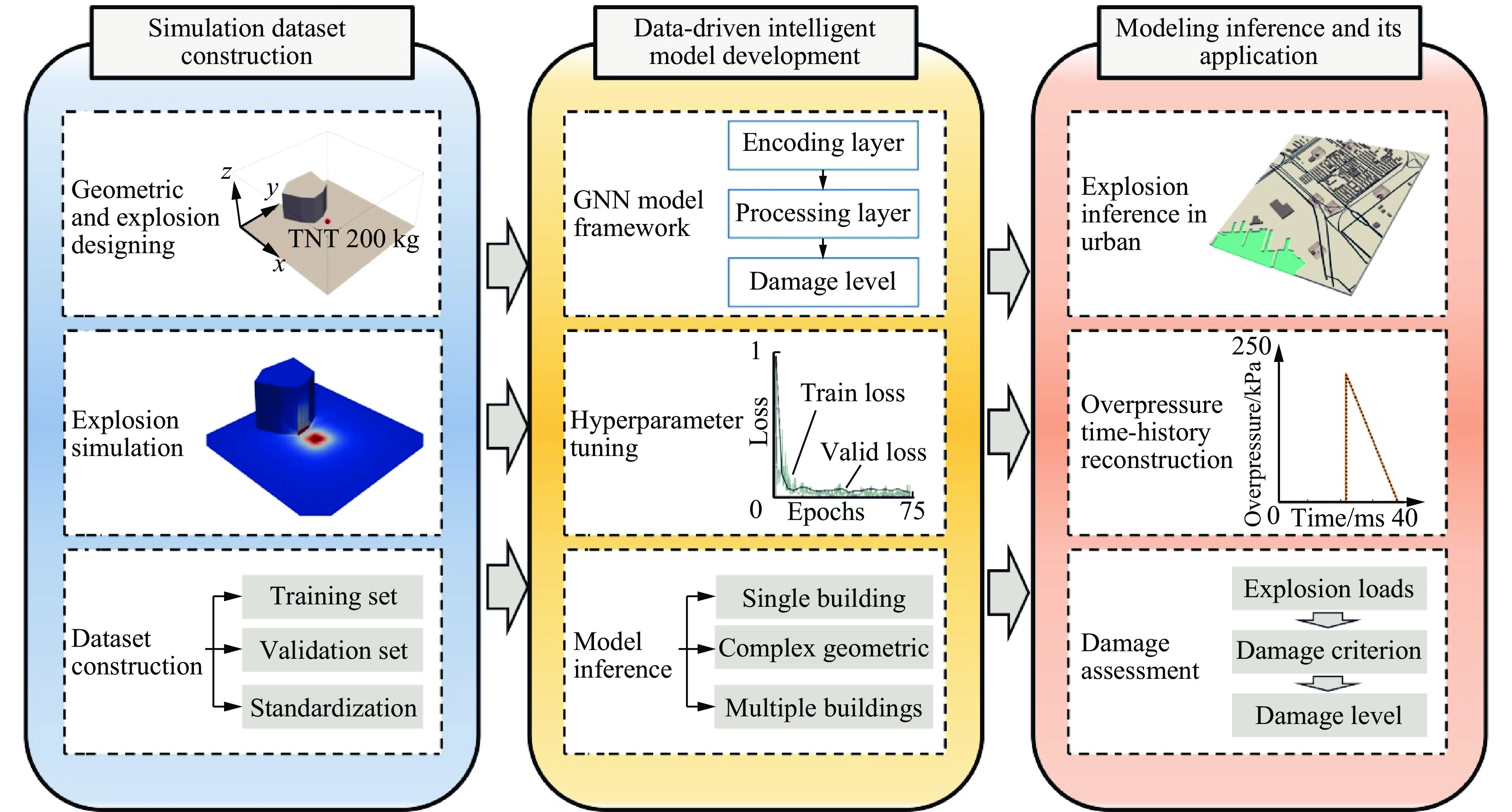 To accurately predict the explosion power fields in buildings, solving the failure of traditional empirical formulas often failing to account for complex environmental factor due to their inability to account for complex environmental factors, and that of numerical simulations inefficient for large-scale urban scenarios and do not meet the needs of rapid damage assessment. Addressing this challenge, an innovative prediction model for explosion power fields based on graph neural networks (GNN) was constructed using an end-to-end strategy. This model enabled rapid and precise forecasting of three-dimensional physical fields, including peak overpressure, peak impulse, and shock-wave arrival times on building surfaces. Compared with numerical simulations, the proposed GNN model demonstrated excellent predictive performance: it achieved a mean square error of 0.97% for predicting surface overpressure parameters of single buildings with varying geometries, and an average prediction error of 3.17% for complex geometric buildings and building communities. When applied to real-world urban settings, the model maintains an average prediction error of 1.29%, completing individual physical field predictions in under 0.6 seconds—three to four orders of magnitude faster than numerical simulations. Furthermore, the model's high-precision predictions allow for the reconstruction of overpressure time history curves at any building surface location and the accurate assessment of structural damage. The proposed GNN model offers a novel approach for rapidly and accurately predicting explosion power fields in urban buildings during blast events. This advancement significantly enhances the capabilities for explosion damage assessment and anti-explosion design in ultra-large-scale complex engineering scenarios, providing substantial engineering value.