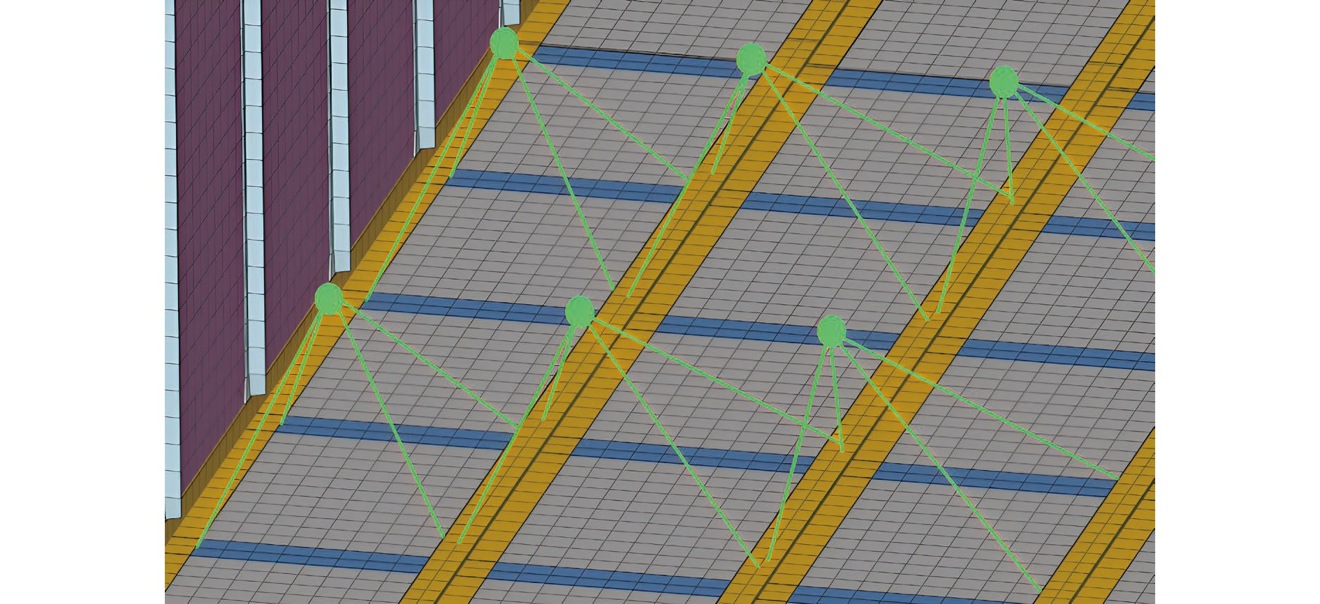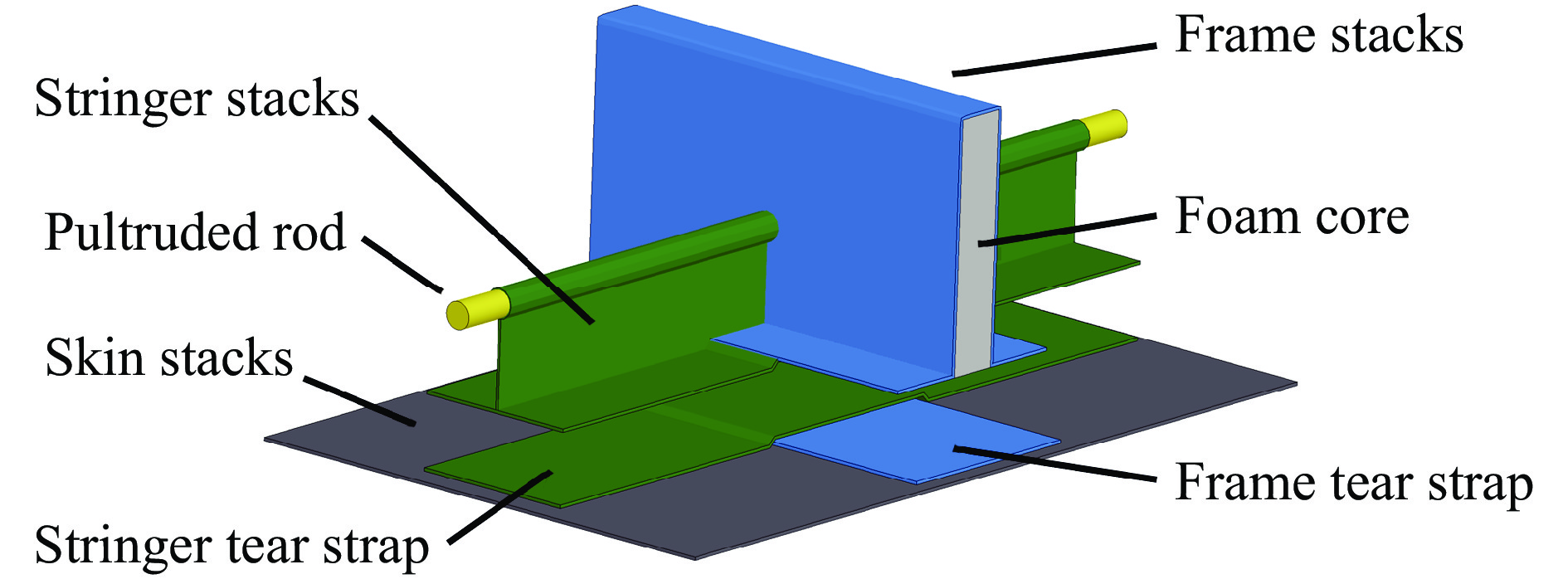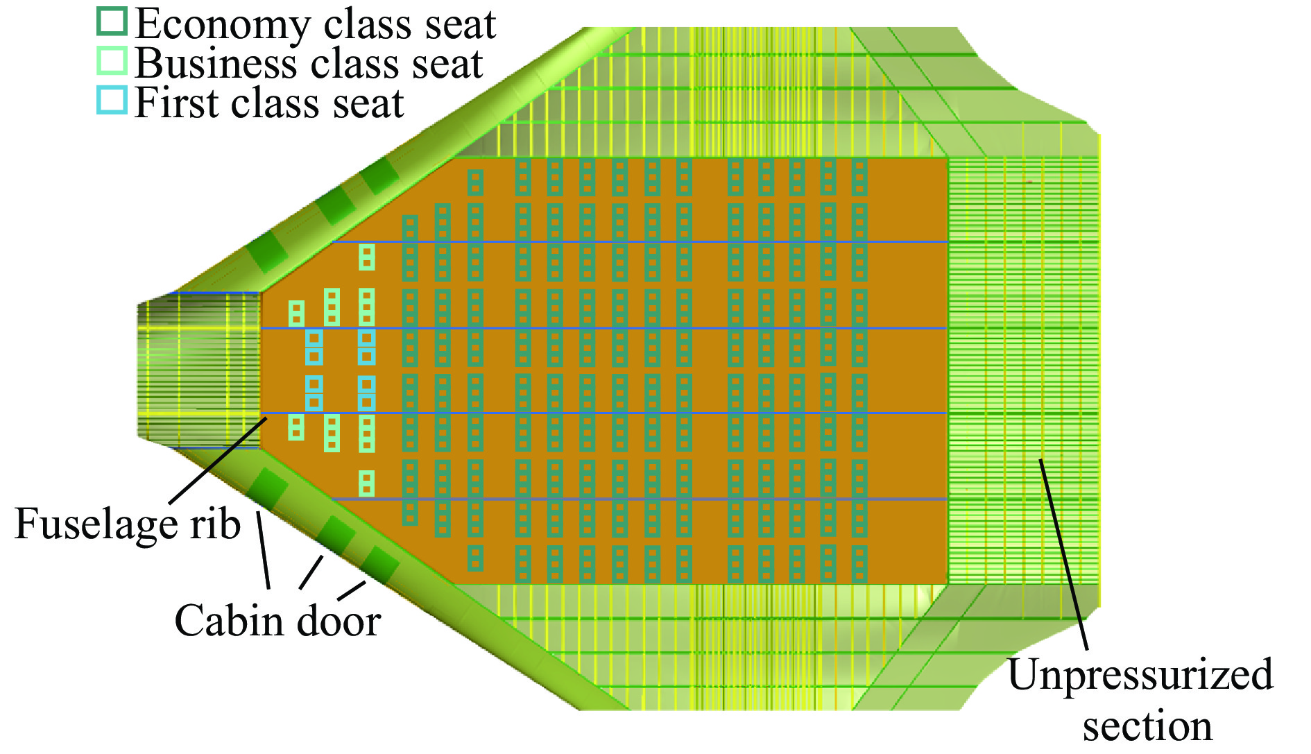 Significant structural and layout disparities exist between the blended wing body (BWB) civil aircraft and conventional cylindrical fuselage metal aircraft. These differences render the impact resistance characteristics of the non-circular fuselage structure and the injury mechanisms for occupants unclear. To address this, a 460-seat BWB aircraft model was developed based on the pultruded rod stitched efficient unitized structure (PRSEUS) proposed by the National Aeronautics and Space Administration (NASA). The aircraft features a wingspan of 80 meters, a range of approximately 16,000 km, a cruising Mach number of 0.85, and a cruising altitude of 11 000 m. Three typical loading conditions were employed to evaluate the strength and stiffness of the BWB structure: critical maneuvering loads (2.5g positive overload and −1.0g negative overload) and cabin pressurization loads (double the cabin pressurization load). Through iterative structural design optimization, the model was confirmed to meet these typical loading requirements while demonstrating sufficient safety margins. The model incorporated all major structural components of the BWB configuration, including skin, frames, stringers, cargo floor, cabin floor, support columns, and fuselage ribs. In the finite element modeling process, elements with minimal influence on the crash response were reasonably simplified to reduce computational complexity. For instance, the outer wings and engines were simplified as concentrated mass points, and the cabin seats and passengers were modeled as concentrated masses fixed to the seat rails. The primary structural components, such as the skin, stringers, floor, and floor beams, were constructed from AS4 carbon fiber composite laminates and modeled using shell elements. The pultruded rods were made of AS4 carbon fiber composite and modeled using beam elements. The foam core of the frames and fuselage ribs were made of Rohacell-110-WF foam material and modeled using solid elements. The remaining structures were made of