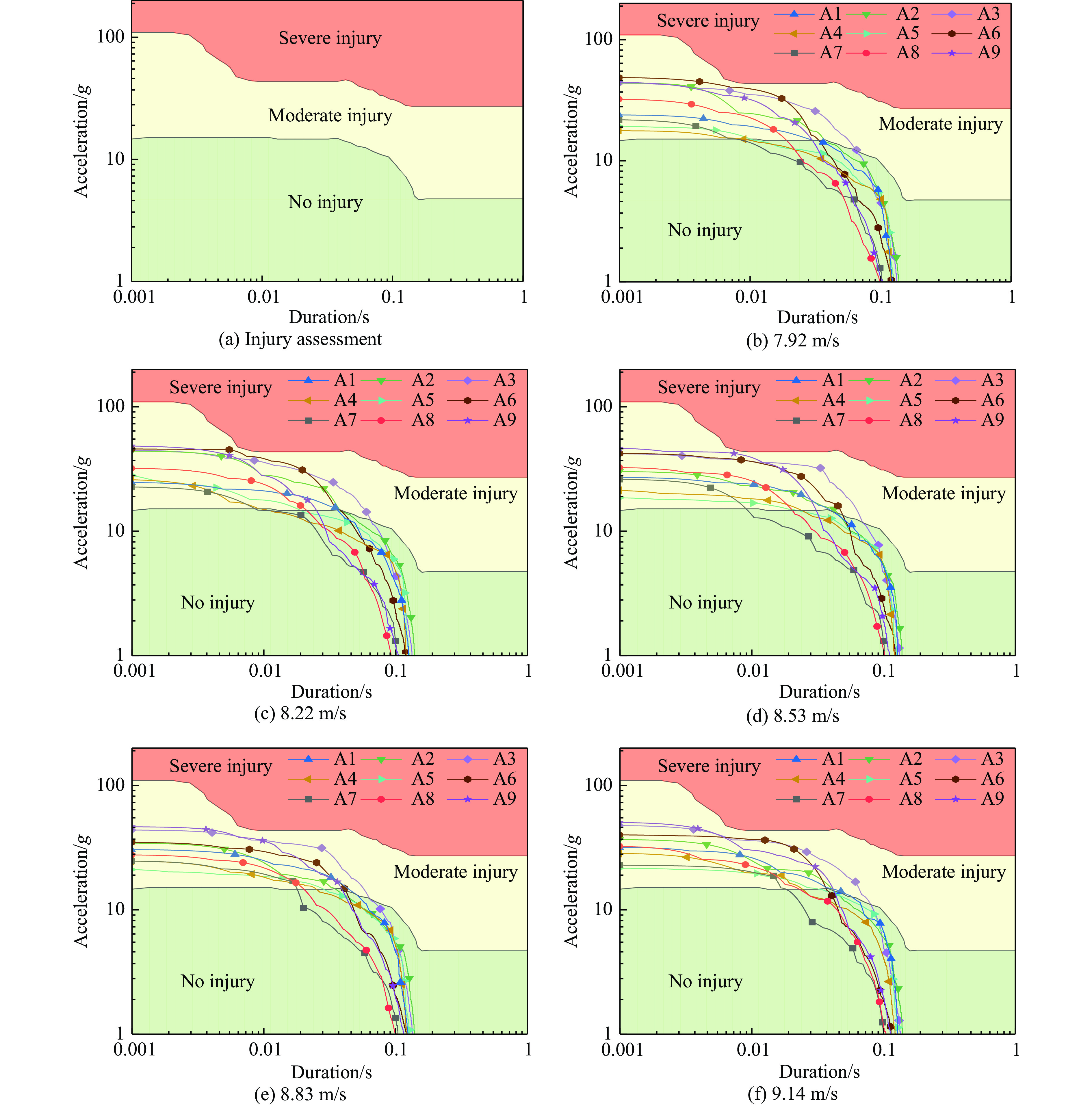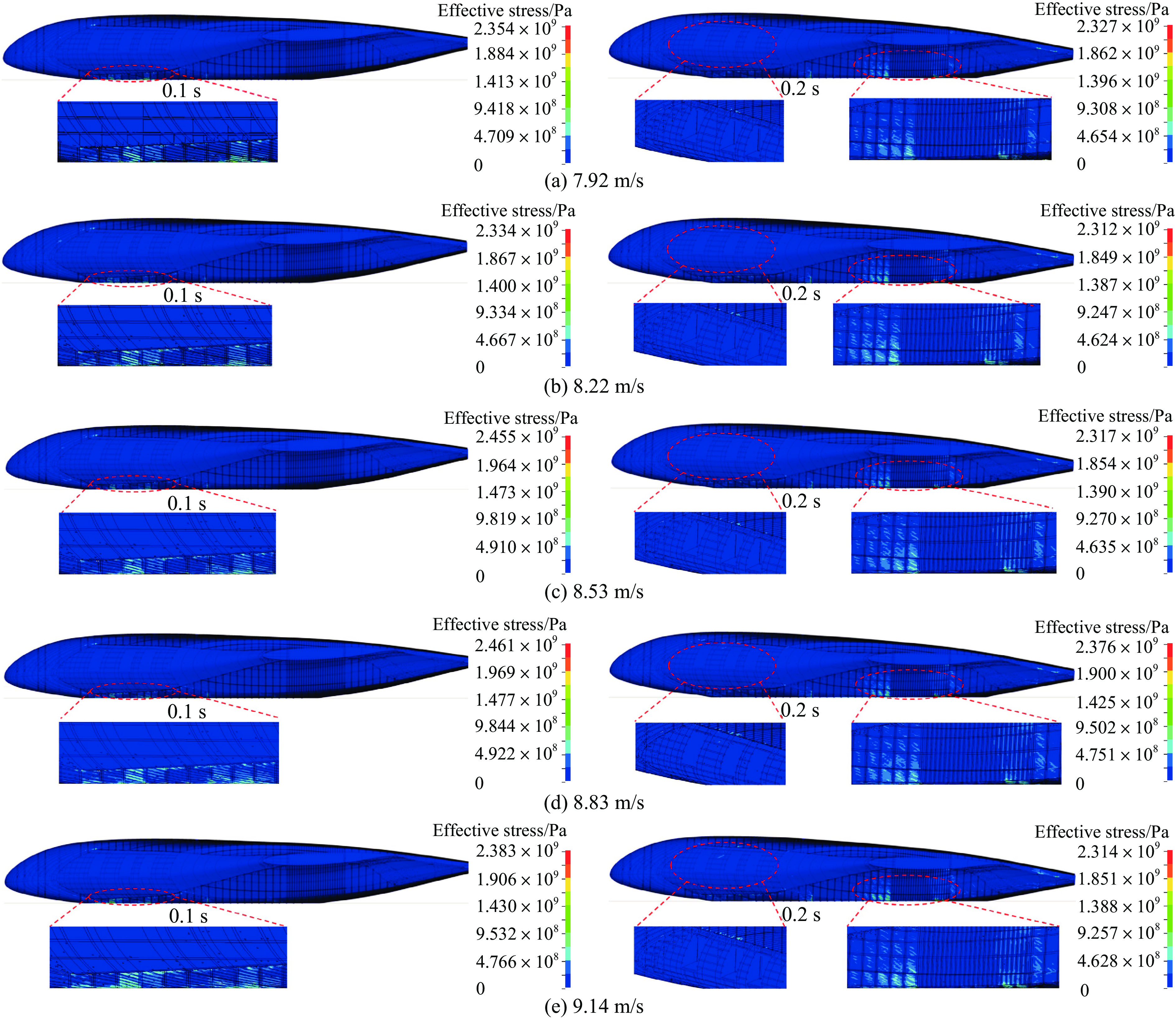 Significant structural and layout disparities exist between the blended wing body (BWB) civil aircraft and conventional cylindrical fuselage metal aircraft. These differences render the impact resistance characteristics of the non-circular fuselage structure and the injury mechanisms for occupants unclear. To address this, a 460-seat BWB aircraft model was developed based on the pultruded rod stitched efficient unitized structure (PRSEUS) proposed by the National Aeronautics and Space Administration (NASA). The aircraft features a wingspan of 80 meters, a range of approximately 16,000 km, a cruising Mach number of 0.85, and a cruising altitude of 11 000 m. Three typical loading conditions were employed to evaluate the strength and stiffness of the BWB structure: critical maneuvering loads (2.5g positive overload and −1.0g negative overload) and cabin pressurization loads (double the cabin pressurization load). Through iterative structural design optimization, the model was confirmed to meet these typical loading requirements while demonstrating sufficient safety margins. The model incorporated all major structural components of the BWB configuration, including skin, frames, stringers, cargo floor, cabin floor, support columns, and fuselage ribs. In the finite element modeling process, elements with minimal influence on the crash response were reasonably simplified to reduce computational complexity. For instance, the outer wings and engines were simplified as concentrated mass points, and the cabin seats and passengers were modeled as concentrated masses fixed to the seat rails. The primary structural components, such as the skin, stringers, floor, and floor beams, were constructed from AS4 carbon fiber composite laminates and modeled using shell elements. The pultruded rods were made of AS4 carbon fiber composite and modeled using beam elements. The foam core of the frames and fuselage ribs were made of Rohacell-110-WF foam material and modeled using solid elements. The remaining structures were made of7075 aluminum alloy and modeled using shell elements. The final model had a total mass of 162.87 tons and consisted of 2 679 991 elements. Five vertical impact velocities ranging from 7.92 to 9.14 m/s were selected to analyze the cabin space integrity, acceleration response of the cabin floor, and the impact characteristics of the primary load-bearing structures. The results indicate that the cabin area of the lift-body fuselage remains largely intact under the different impact velocities. The primary damage occurs below the cabin floor, with compressive damage concentrated in the lower structures of the middle and aft fuselage. The survivable space is preserved. Compared to a round-section fuselage, the deformation of the BWB frames is relatively small, and upward bulging is not significant, making it challenging to form effective plastic hinges. During the crash, the acceleration load distribution of the blended wing body-integrated aircraft exhibits a decreasing trend from the central aisle to the sides of the fuselage, with peak acceleration loads being higher at the central aisle. Under all five crash conditions, passenger injury levels at various cabin positions fall within the serious but acceptable and safe regions. Regarding structural energy absorption, the frames are identified as the primary energy-absorbing structures, followed by the fuselage ribs. However, the cargo pillars do not effectively crush and absorb energy. For future crashworthiness design of BWB civil aircraft, the cargo structure should be a key consideration.