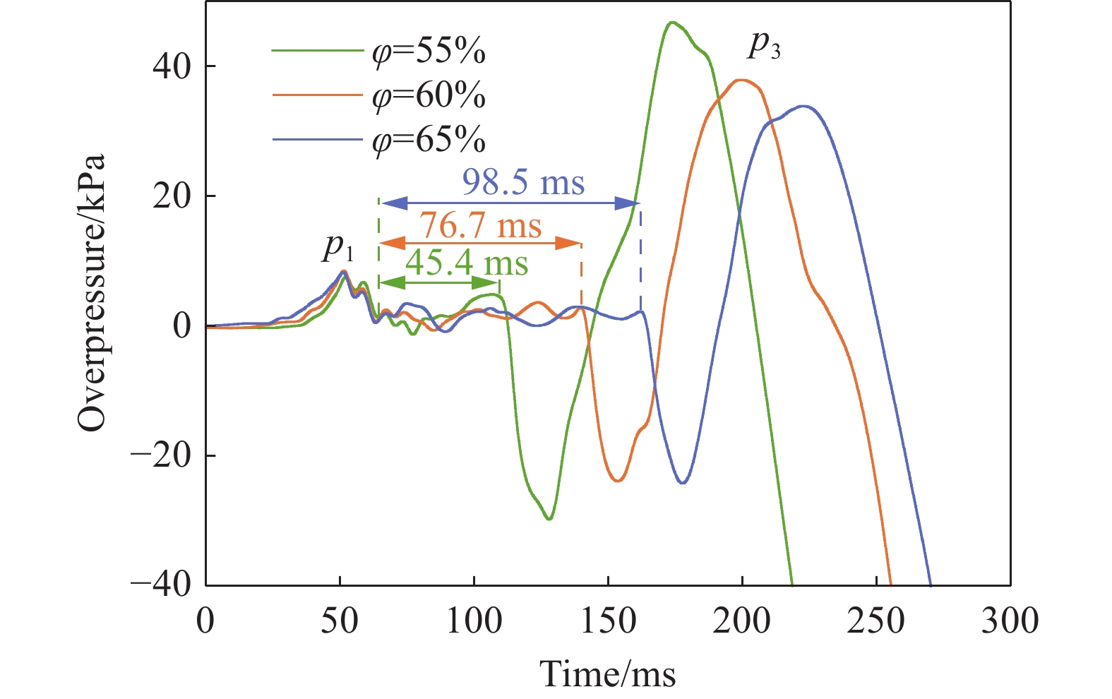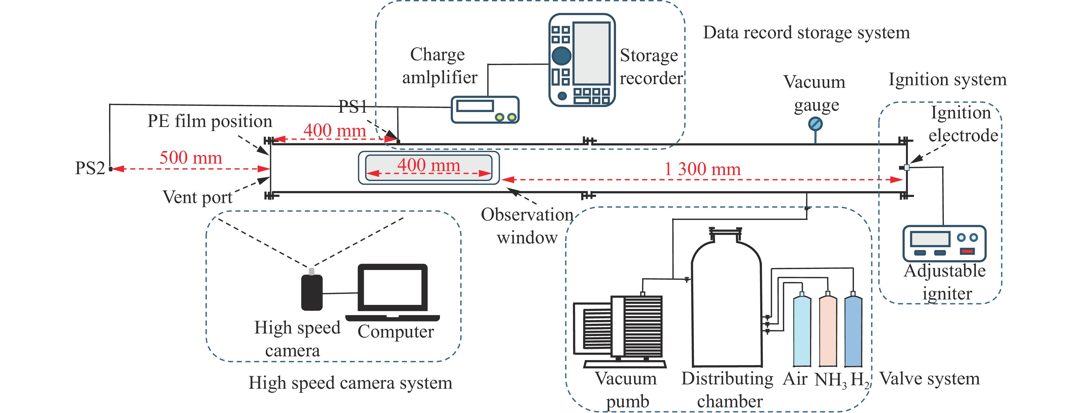 Renewable energy is addressing some of the key challenges facing global society today, and zero-carbon energy systems are the fundamental way to achieve carbon neutrality. Therefore, hydrogen and ammonia have gained great attention as zero-carbon energy sources. To further study the combustion characteristics of ammonia-hydrogen-air premixed gas flame inside and outside the duct, the influence of ammonia doped amount (φ) on the flame morphology and the evolution of pressure inside and outside the duct under stoichiometric ratio was explored with the help of high-speed photography and pressure sensor in the2000 -mm-long stainless steel duct with a 400-mm-long and 70-mm-wide observation window. The results show that φ significantly affects the pressure inside and outside the duct, and the time to reach the reverse flow phenomenon caused by the secondary explosion also increases. The pressure measuring point PS1 is set at 400 mm away from the explosion vent in the duct to collect data. The pressure curves in the duct under each working condition are presented as a three-peak structure, named p1, p2, and p3. The three pressure peaks are caused by the rupture of the explosion vent film, the gas venting in the duct, and the gas reverse generated by the secondary explosion outside the duct. The size of p1 depends on the tensile strength of the explosion venting membrane, and its amplitude is almost independent of the φ. p2 and p3 both increase with the increase of φ, and the p3 increase rate is the largest when φ is in 50%–65%. p2 changes from a single peak to a fluctuating pressure platform in the pressure curve diagram, and the time of the platform extends with the increase of φ. The pressure measurement point PS2 is set at the horizontal central axis, 500mm away from the explosion vent outside the duct, to collect data. And the peak pressure of the secondary explosion outside the duct (pout) decreases with the increase of the φ, and the time to reach pout increases. This study provides a theoretical basis for the utilization of ammonia and hydrogen energy.