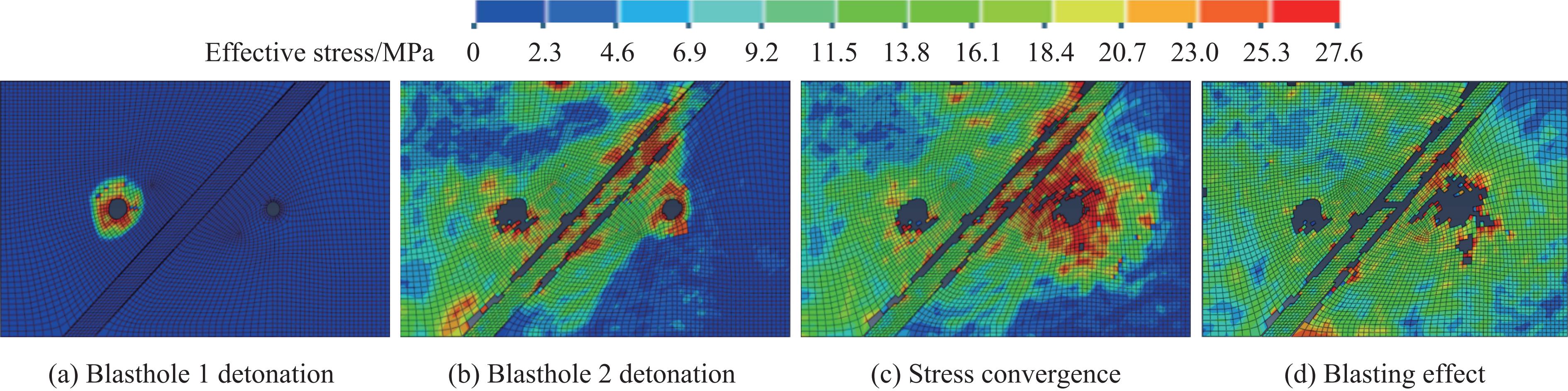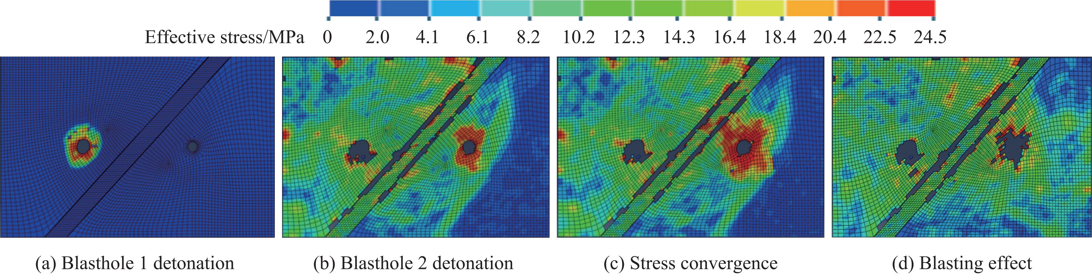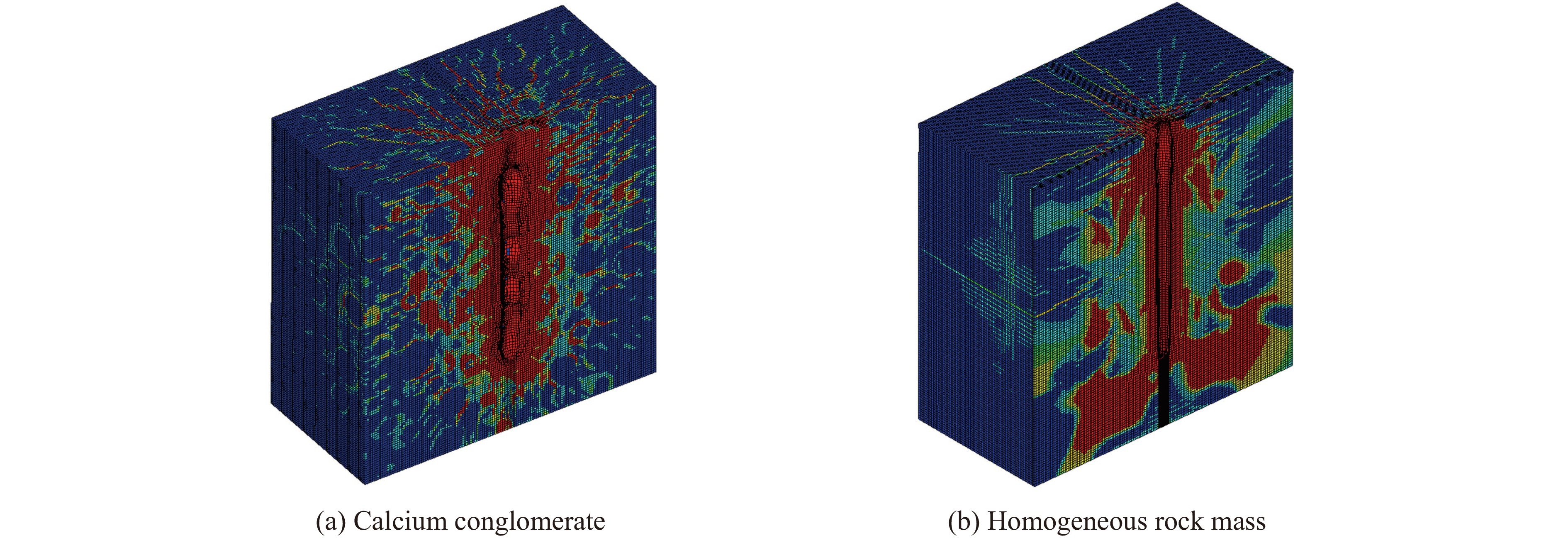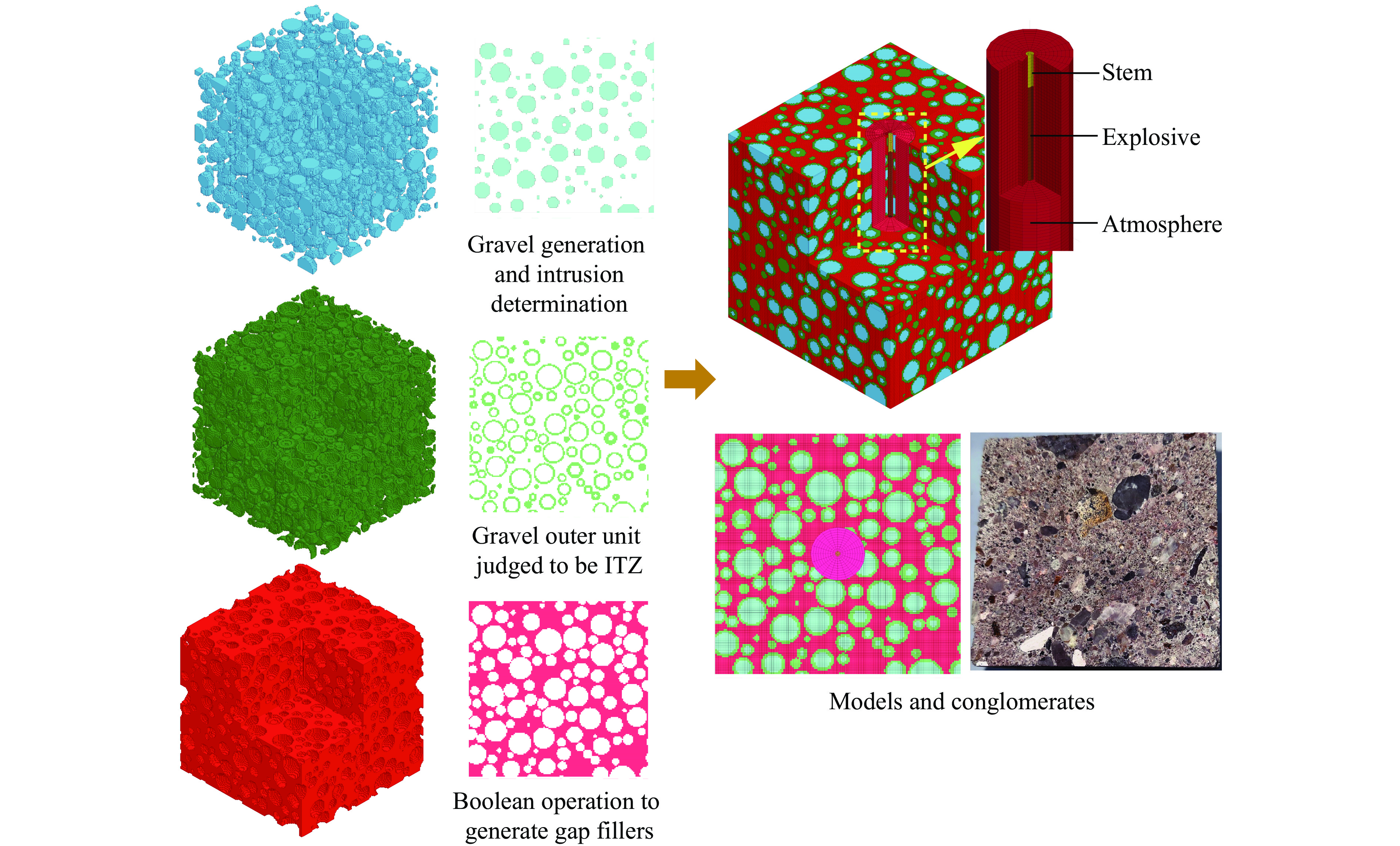 To study the damage law of calcareous conglomerate under blasting, firstly, the damage fracture process and mechanism of calcareous conglomerate under blasting load were revealed based on the theory of damage fracture mechanics. A meso-scale model of conglomerate, including filler, conglomerate and interfacial transition zone (ITZ), was established by using LS-DYNA and Fortran programming, and the propagation law of explosive stress wave and its damage characteristics were analyzed. The damage fracture process of calcareous conglomerate under blasting can be divided into four stages, namely: compression damage in both gravel and fill; tensile damage in gravel and compression damage in fill; tensile damage in both gravel and fill; and tensile damage at the intersection of gravel and fill. Numerical results show that under blasting loads, the gravel has higher equivalent stresses, the fill has the lowest, stress concentration is evident at the ITZ, and the stress gap between the gravel and the fill decreases as the distance increases. The conglomerate sustains relatively minor damage, with a notable phenomenon of damage occurring around it. However, the filler experiences significant damage. The expansion of blasting crack in calcareous conglomerate forms mainly along the direction of stress wave propagation. Cracks tend to develop along the filler with lower physical and mechanical properties, as well as along the junction surfaces. The damage to the gravel is comparatively less severe. Blasting blockiness is mainly manifested as the filler wrapping gravel, and the distribution of blasting blockiness is affected by the bonding force at the intersection surface and the distribution of gravel.