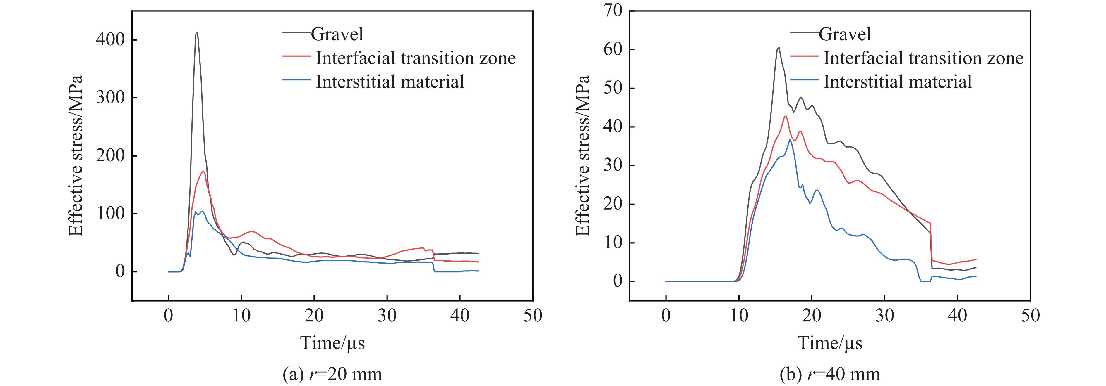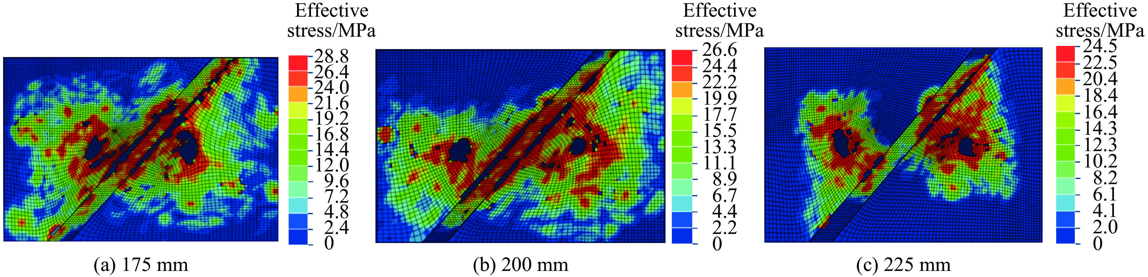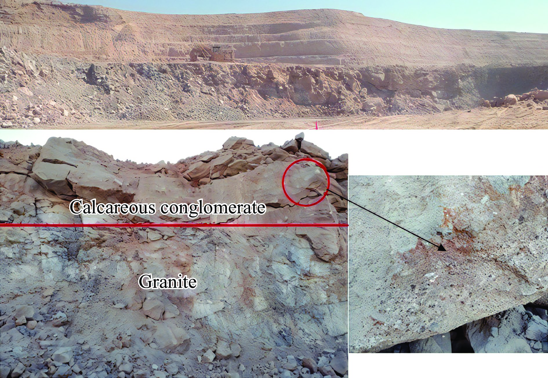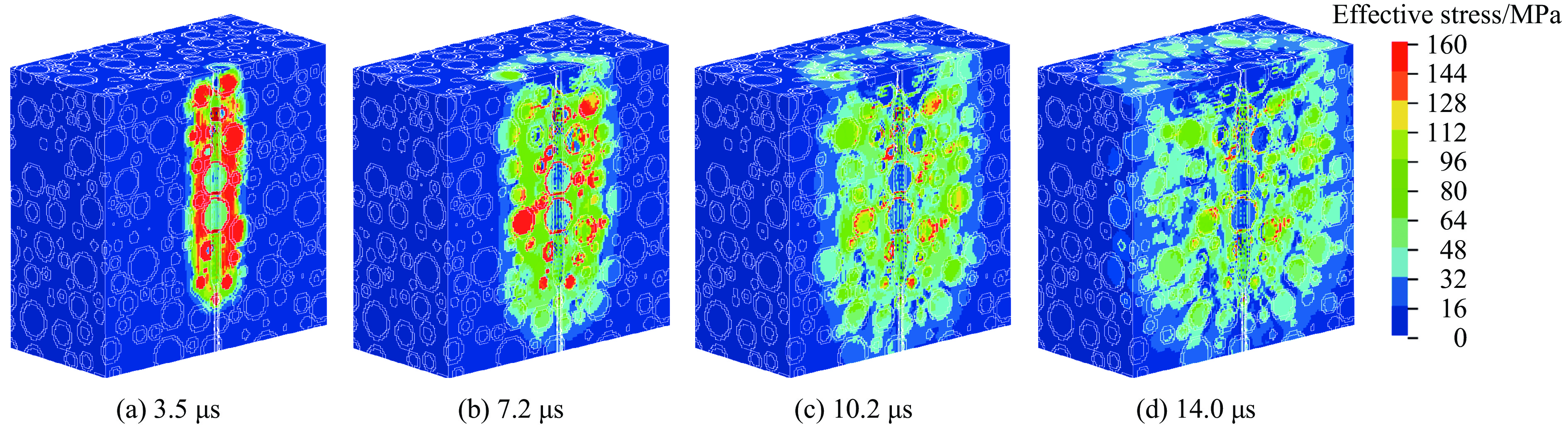 To study the damage law of calcareous conglomerate under blasting, firstly, the damage fracture process and mechanism of calcareous conglomerate under blasting load were revealed based on the theory of damage fracture mechanics. A meso-scale model of conglomerate, including filler, conglomerate and interfacial transition zone (ITZ), was established by using LS-DYNA and Fortran programming, and the propagation law of explosive stress wave and its damage characteristics were analyzed. The damage fracture process of calcareous conglomerate under blasting can be divided into four stages, namely: compression damage in both gravel and fill; tensile damage in gravel and compression damage in fill; tensile damage in both gravel and fill; and tensile damage at the intersection of gravel and fill. Numerical results show that under blasting loads, the gravel has higher equivalent stresses, the fill has the lowest, stress concentration is evident at the ITZ, and the stress gap between the gravel and the fill decreases as the distance increases. The conglomerate sustains relatively minor damage, with a notable phenomenon of damage occurring around it. However, the filler experiences significant damage. The expansion of blasting crack in calcareous conglomerate forms mainly along the direction of stress wave propagation. Cracks tend to develop along the filler with lower physical and mechanical properties, as well as along the junction surfaces. The damage to the gravel is comparatively less severe. Blasting blockiness is mainly manifested as the filler wrapping gravel, and the distribution of blasting blockiness is affected by the bonding force at the intersection surface and the distribution of gravel.