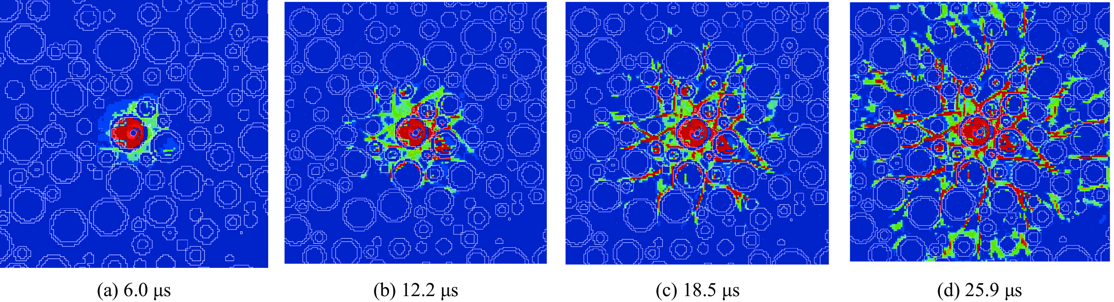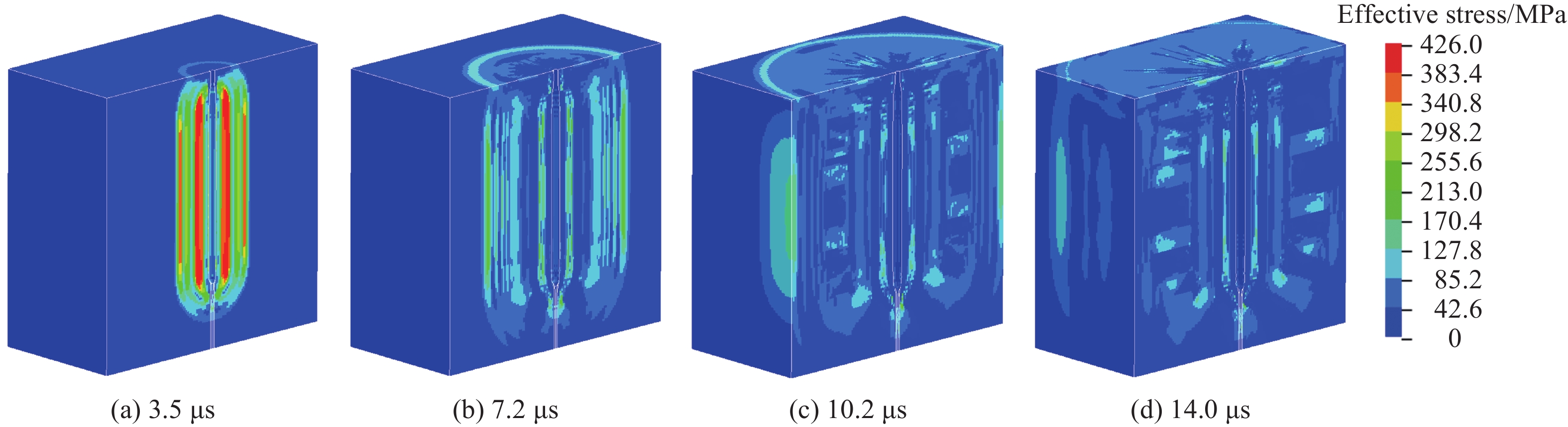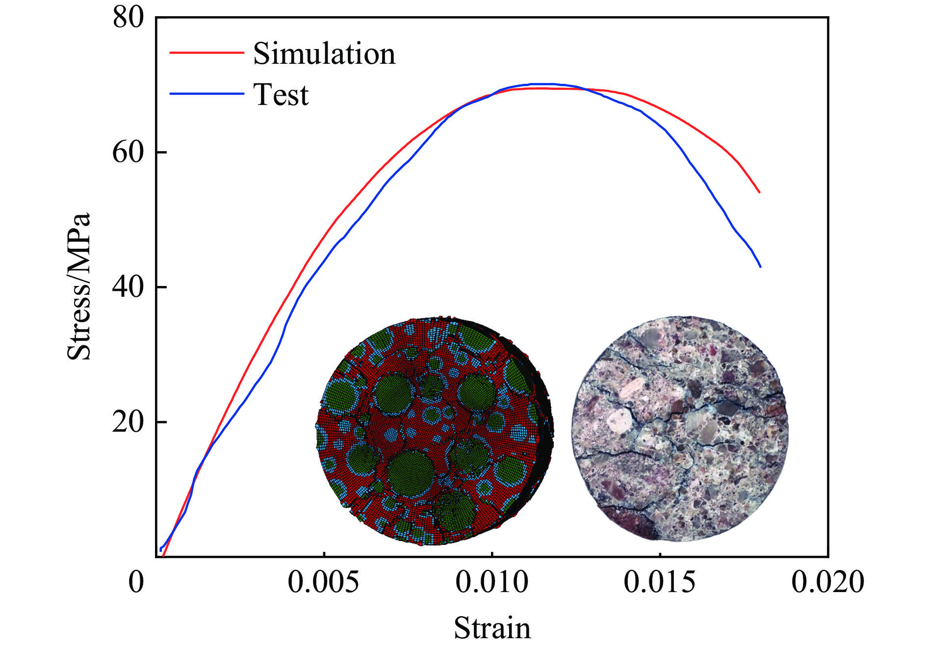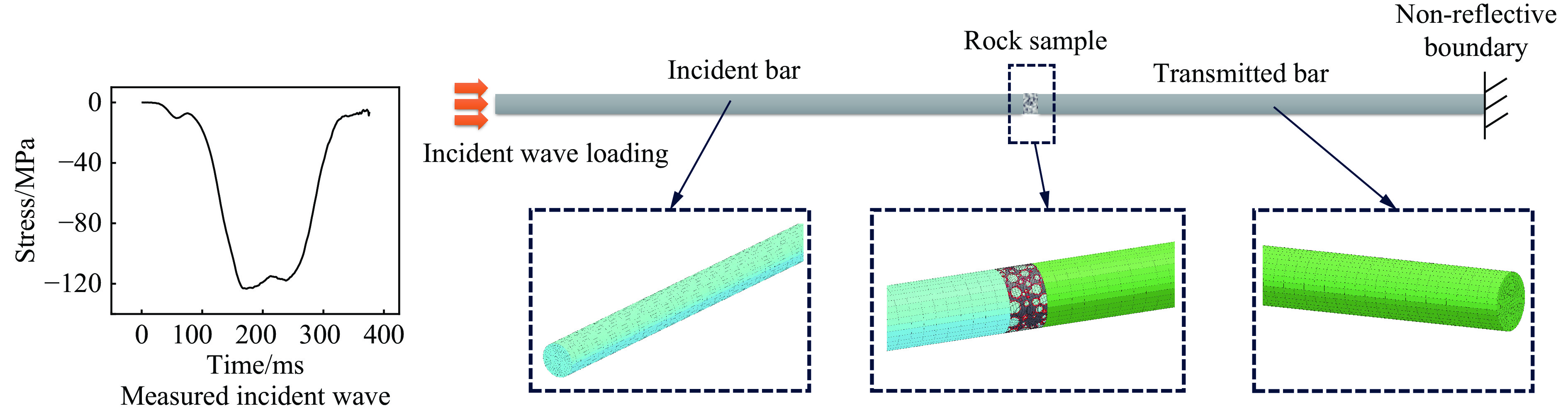 To study the damage law of calcareous conglomerate under blasting, firstly, the damage fracture process and mechanism of calcareous conglomerate under blasting load were revealed based on the theory of damage fracture mechanics. A meso-scale model of conglomerate, including filler, conglomerate and interfacial transition zone (ITZ), was established by using LS-DYNA and Fortran programming, and the propagation law of explosive stress wave and its damage characteristics were analyzed. The damage fracture process of calcareous conglomerate under blasting can be divided into four stages, namely: compression damage in both gravel and fill; tensile damage in gravel and compression damage in fill; tensile damage in both gravel and fill; and tensile damage at the intersection of gravel and fill. Numerical results show that under blasting loads, the gravel has higher equivalent stresses, the fill has the lowest, stress concentration is evident at the ITZ, and the stress gap between the gravel and the fill decreases as the distance increases. The conglomerate sustains relatively minor damage, with a notable phenomenon of damage occurring around it. However, the filler experiences significant damage. The expansion of blasting crack in calcareous conglomerate forms mainly along the direction of stress wave propagation. Cracks tend to develop along the filler with lower physical and mechanical properties, as well as along the junction surfaces. The damage to the gravel is comparatively less severe. Blasting blockiness is mainly manifested as the filler wrapping gravel, and the distribution of blasting blockiness is affected by the bonding force at the intersection surface and the distribution of gravel.