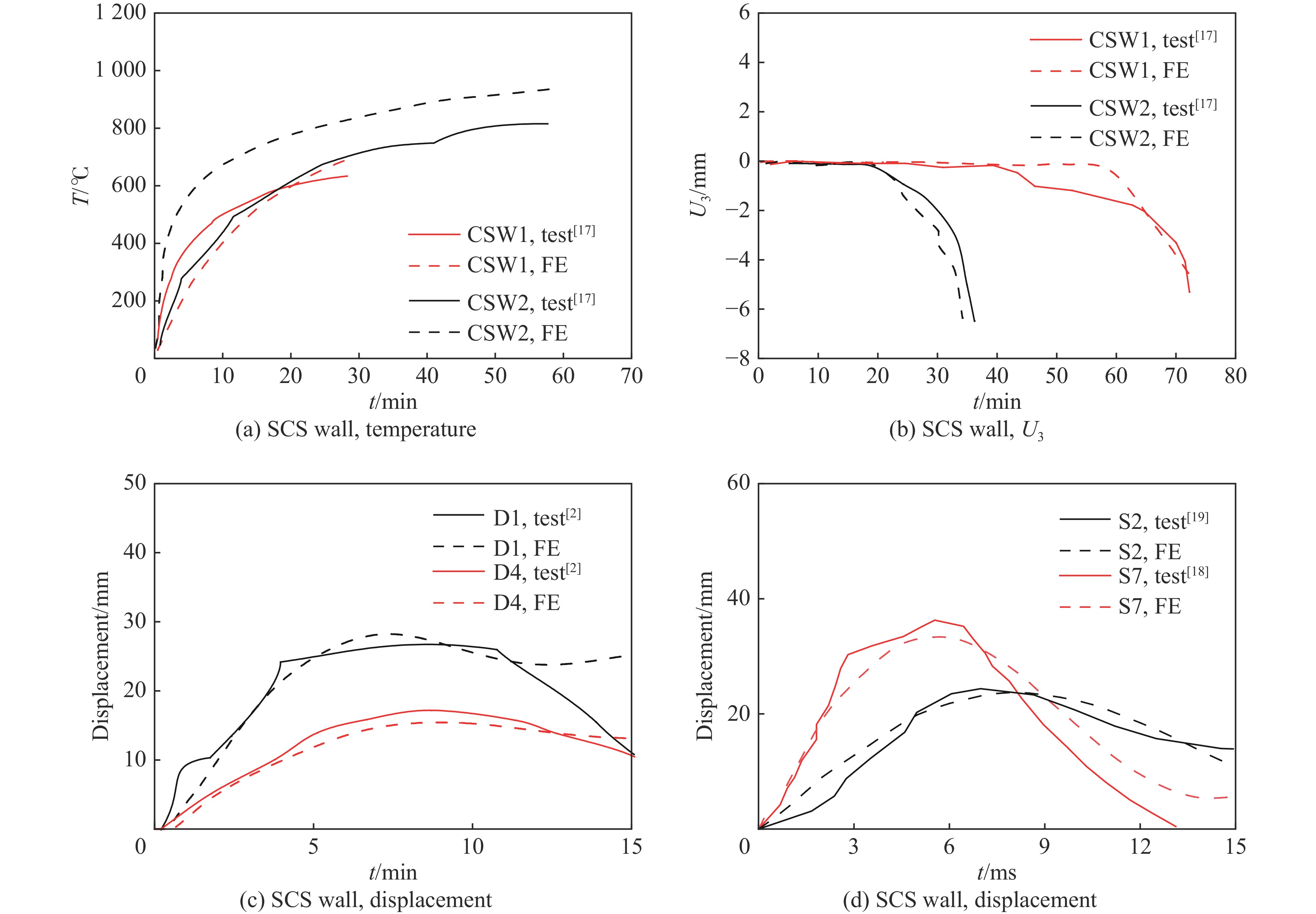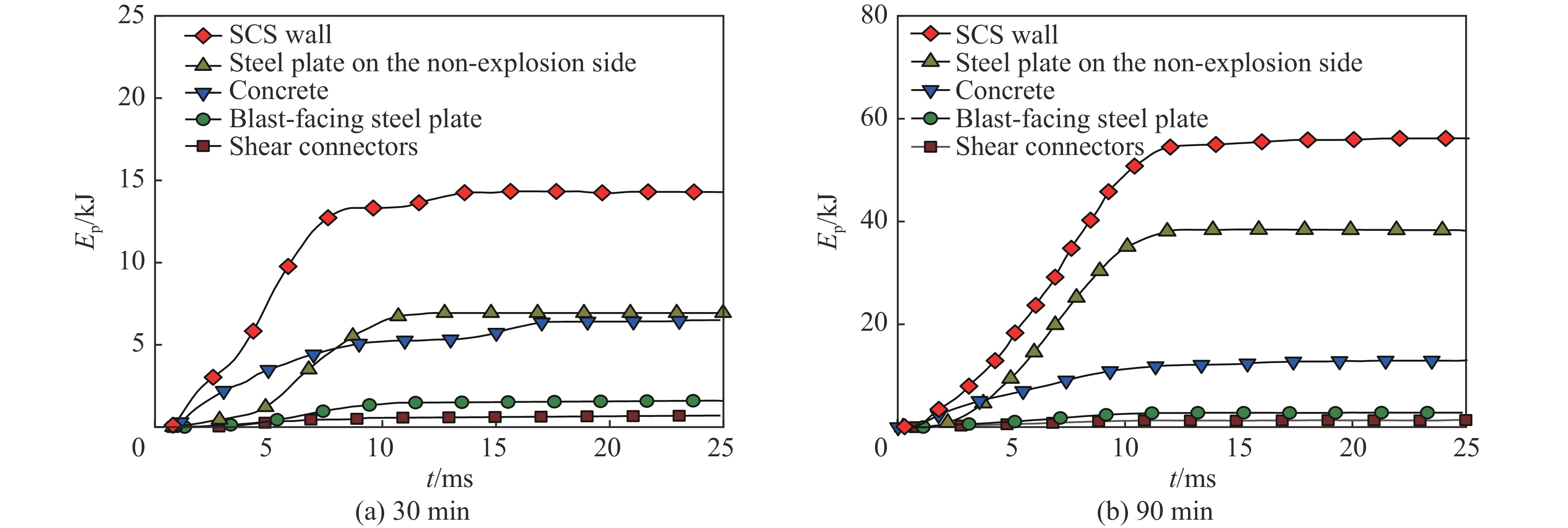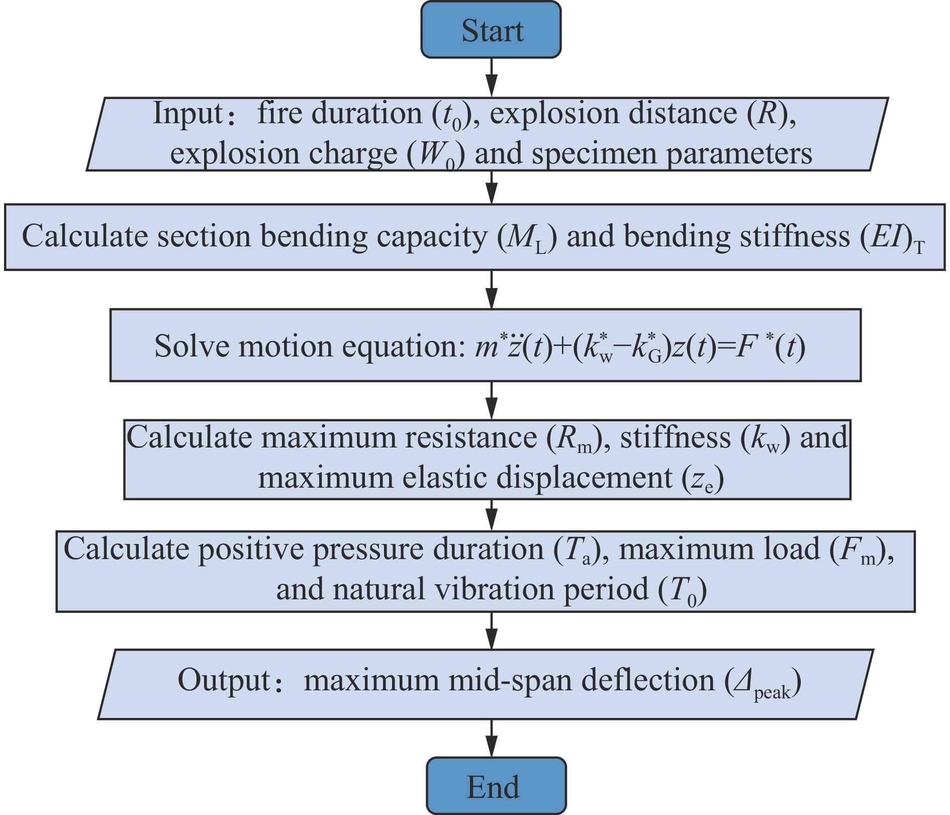 Steel-concrete-steel composite (SCS) wall has been applied in high-rise buildings and nuclear power plants. Its performance under accidental and extreme loads during the whole life cycle deserves attention. Considering that fires and explosions often occur simultaneously, and that the mechanical properties of steel and concrete are deteriorated significantly at high temperatures, this leads to serious degradation of blast resistance of structural members. In this context, a total of 120 finite element (FE) models of SCS walls under combined fire and explosion were established using ABAQUS software. First, the FE models were verified based on existing fire resistance tests and explosion tests at room temperature on SCS walls. Then, the blast resistance mechanism of SCS walls was analyzed, and the influences of key parameters, including fire duration, explosion charge, steel plate ratio, material strength, tie bars spacing and axial compression ratio, on the explosion resistance were investigated. Finally, based on the single-degree of freedom method, the formulas were proposed to predict the maximum deformation of SCS walls under combined fire exposure and explosion. The results show that SCS walls primarily exhibit overall bending failure under coupled fire exposure and explosion. With the increase of fire duration, the contribution of the steel plate on the fire-exposed side to the energy dissipation decreases, and the plastic deformation of the steel plate on the non-fire-exposed side gradually becomes the main energy dissipation component. Fire duration, explosion charge and steel strength significantly affect the blast resistance of SCS walls under fire conditions. When exposed to fire for 90 minutes, the maximum mid-span deformation decreases by approximately 22%, as the steel yield strength increases from 235 to 460 MPa. However, the influence of the concrete strength is minor. The maximum deformation of SCS walls can be reasonably predicted by the proposed formulas based on the single-degree of freedom method under coupled fire exposure and explosion.