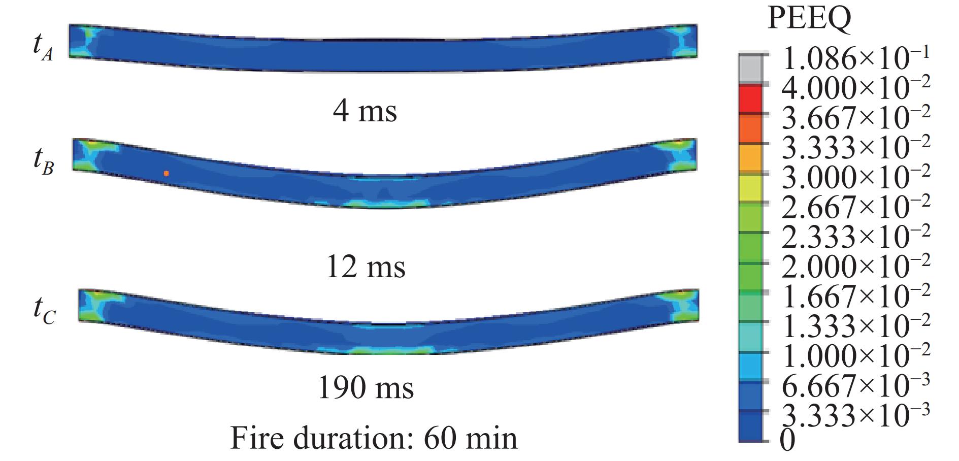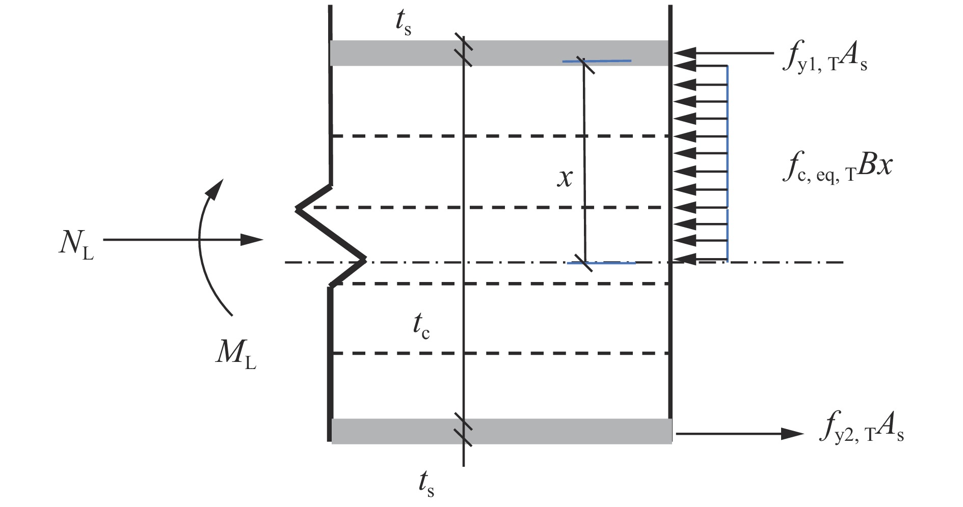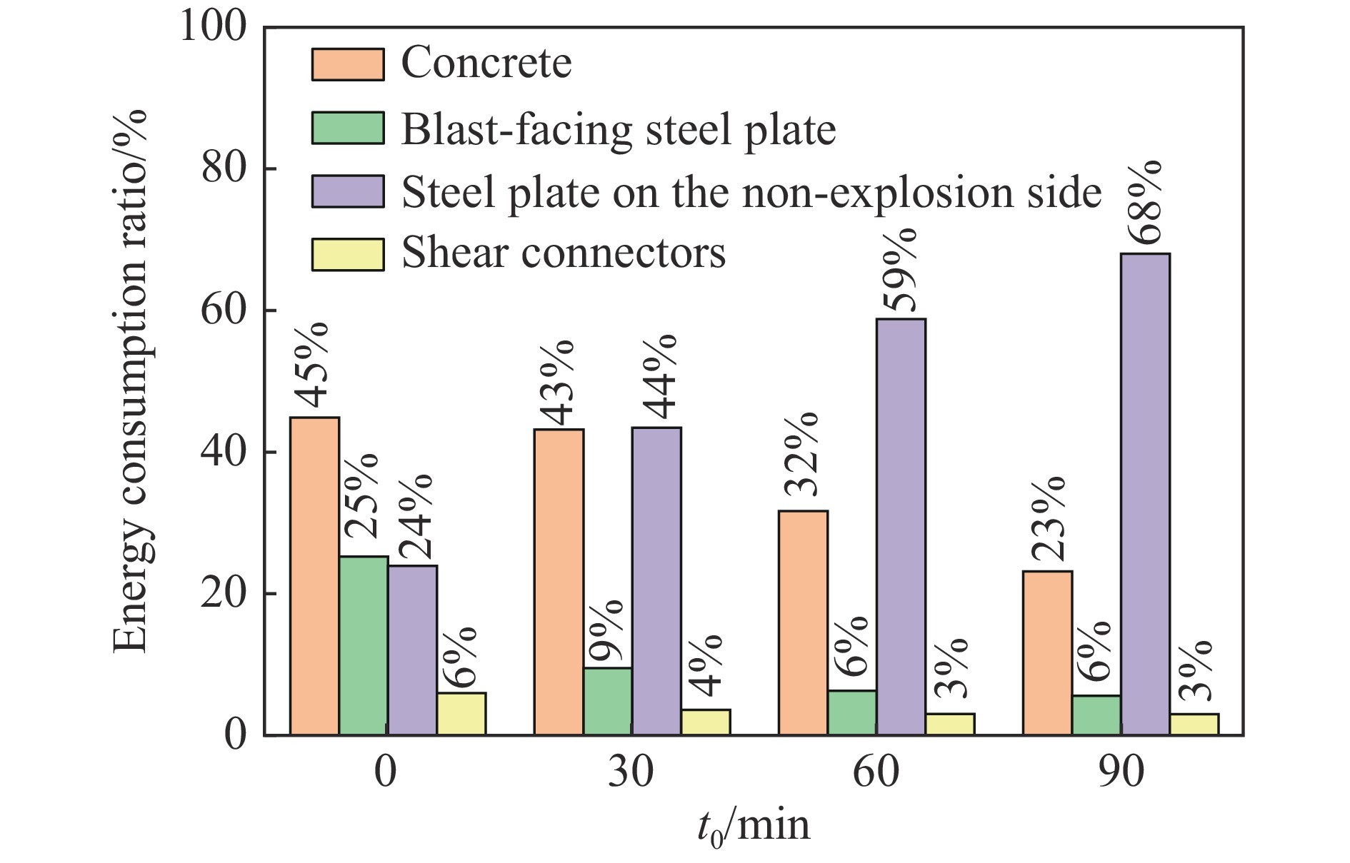 Steel-concrete-steel composite (SCS) wall has been applied in high-rise buildings and nuclear power plants. Its performance under accidental and extreme loads during the whole life cycle deserves attention. Considering that fires and explosions often occur simultaneously, and that the mechanical properties of steel and concrete are deteriorated significantly at high temperatures, this leads to serious degradation of blast resistance of structural members. In this context, a total of 120 finite element (FE) models of SCS walls under combined fire and explosion were established using ABAQUS software. First, the FE models were verified based on existing fire resistance tests and explosion tests at room temperature on SCS walls. Then, the blast resistance mechanism of SCS walls was analyzed, and the influences of key parameters, including fire duration, explosion charge, steel plate ratio, material strength, tie bars spacing and axial compression ratio, on the explosion resistance were investigated. Finally, based on the single-degree of freedom method, the formulas were proposed to predict the maximum deformation of SCS walls under combined fire exposure and explosion. The results show that SCS walls primarily exhibit overall bending failure under coupled fire exposure and explosion. With the increase of fire duration, the contribution of the steel plate on the fire-exposed side to the energy dissipation decreases, and the plastic deformation of the steel plate on the non-fire-exposed side gradually becomes the main energy dissipation component. Fire duration, explosion charge and steel strength significantly affect the blast resistance of SCS walls under fire conditions. When exposed to fire for 90 minutes, the maximum mid-span deformation decreases by approximately 22%, as the steel yield strength increases from 235 to 460 MPa. However, the influence of the concrete strength is minor. The maximum deformation of SCS walls can be reasonably predicted by the proposed formulas based on the single-degree of freedom method under coupled fire exposure and explosion.