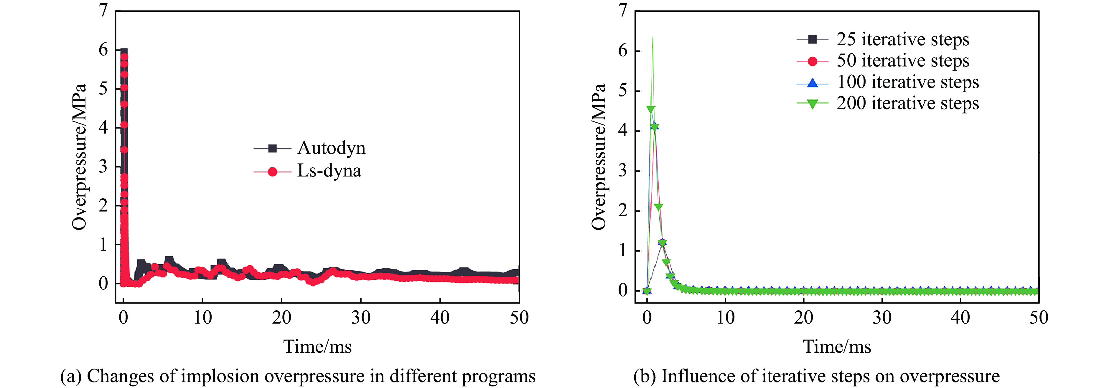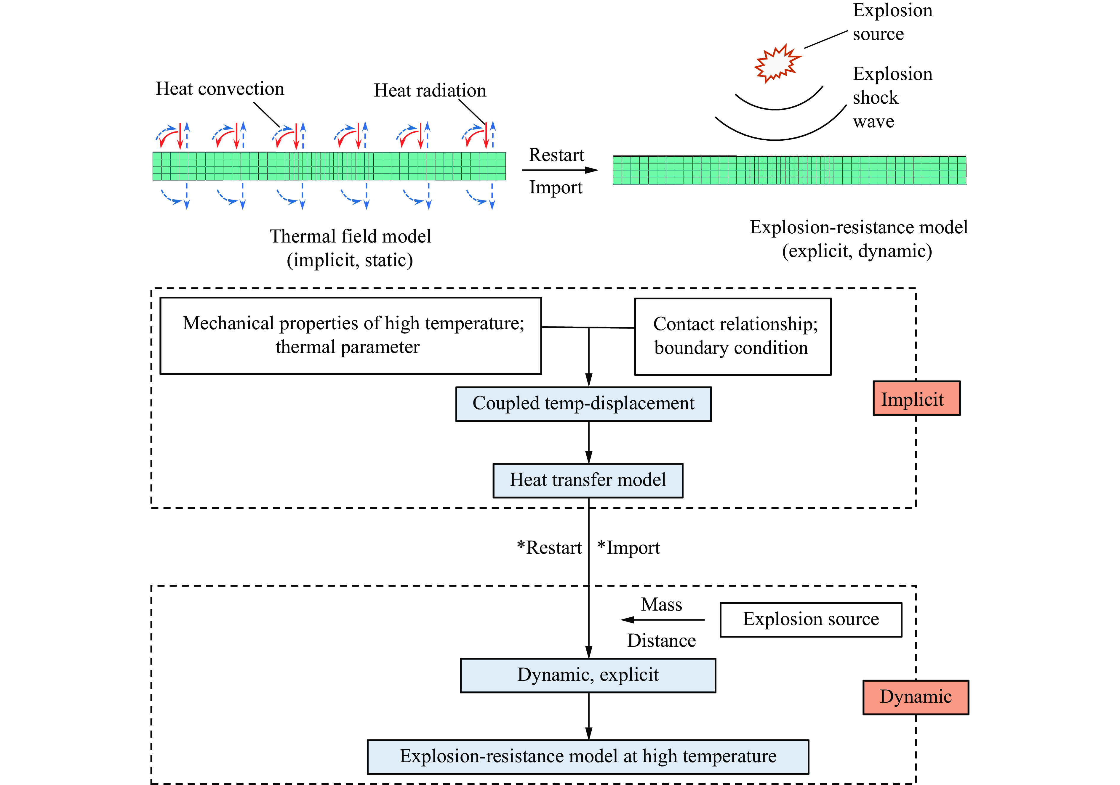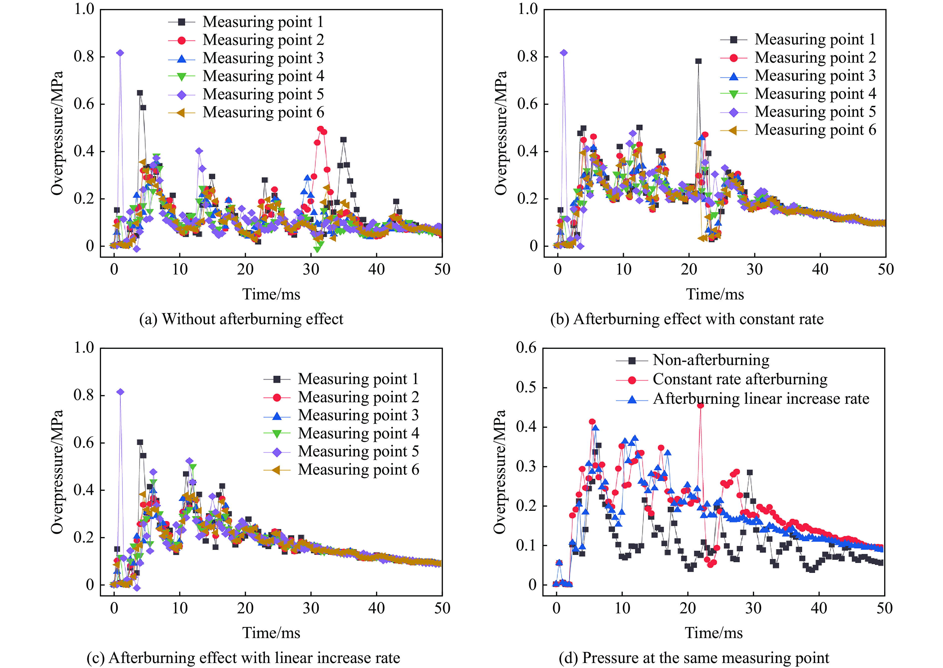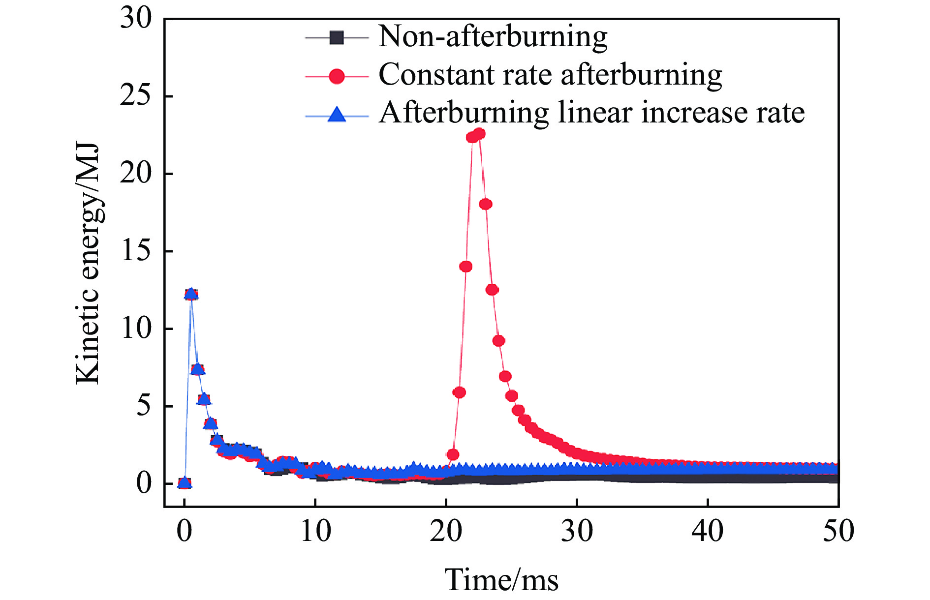 A Closed-Space Model was constructed using steel plates to examine the influence of afterburning energy load generated by explosive detonation products on the damage characteristics of confined space. Additionally, the quasi-static pressure in the confined space was simplified by applying the energy conservation law. Relying on the adiabatic index of the mixture of detonation products and air, as well as the complete afterburning degree of detonation products, a simulation method for the afterburning effect was proposed. This method was used to calculate the afterburning energy of detonation products and determine the beginning and ending times of the afterburning effect. The numerical simulation of implosion damage in a confined space was carried out by this method. The implosion simulation considering the afterburning energy load was performed by employing two simulation methods: constant reaction rate and linearly increasing reaction rate. The results were compared with the implosion simulation results without considering the afterburning effect. The influence and degree of change of the afterburning effect on the implosion damage characteristics were analyzed. It is found that the afterburning effect with different reaction rates has a significant influence on the detonation damage characteristics, except for the temperature, in confined spaces. Moreover, the enhancement effect of the constant reaction rate is the most significant. It increased the velocity and acceleration loads under implosion in the confined space by 42.67% and 71.21%, respectively. The overpressure and quasi-static pressure were increased by 74.42% and 74.95%, respectively, and the kinetic energy was increased by approximately 212%. The proposed simulation method for the afterburning effect can better simulate the dynamic response of implosion ruin in confined spaces and provides a more accurate simulation method of the afterburning effect for the design and evaluation of explosion-proof structures.