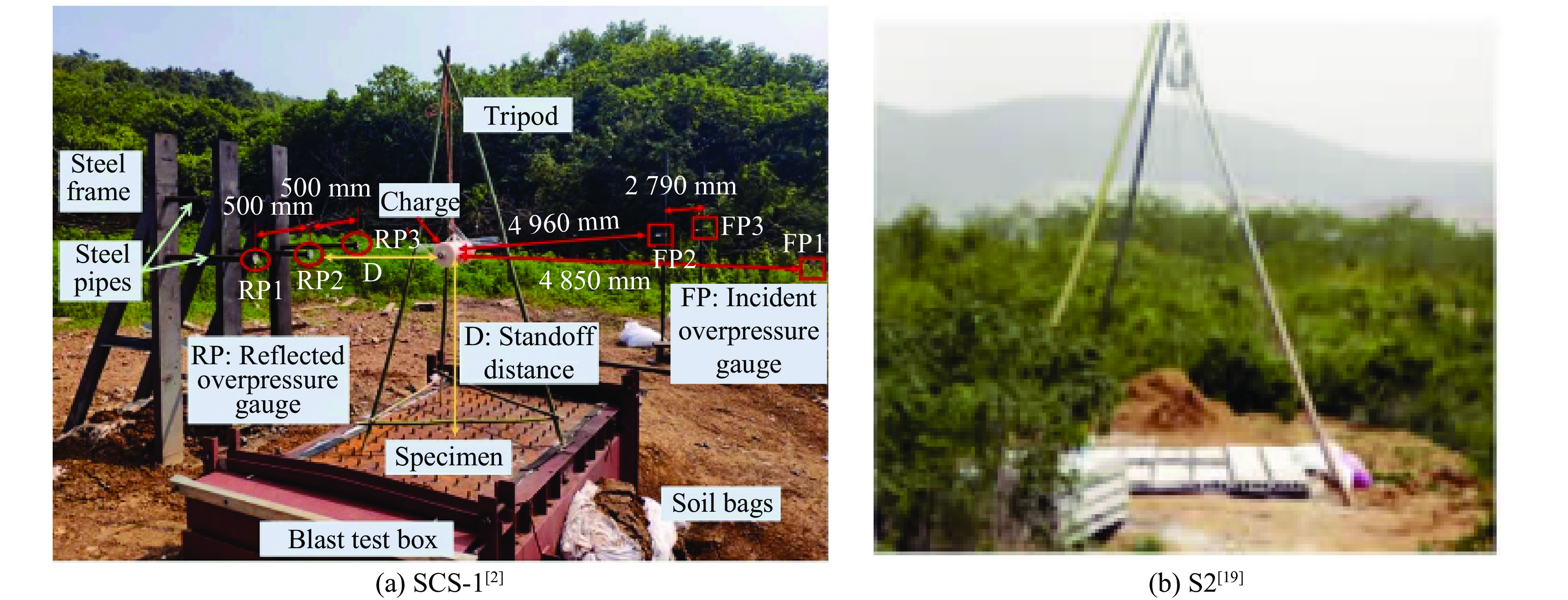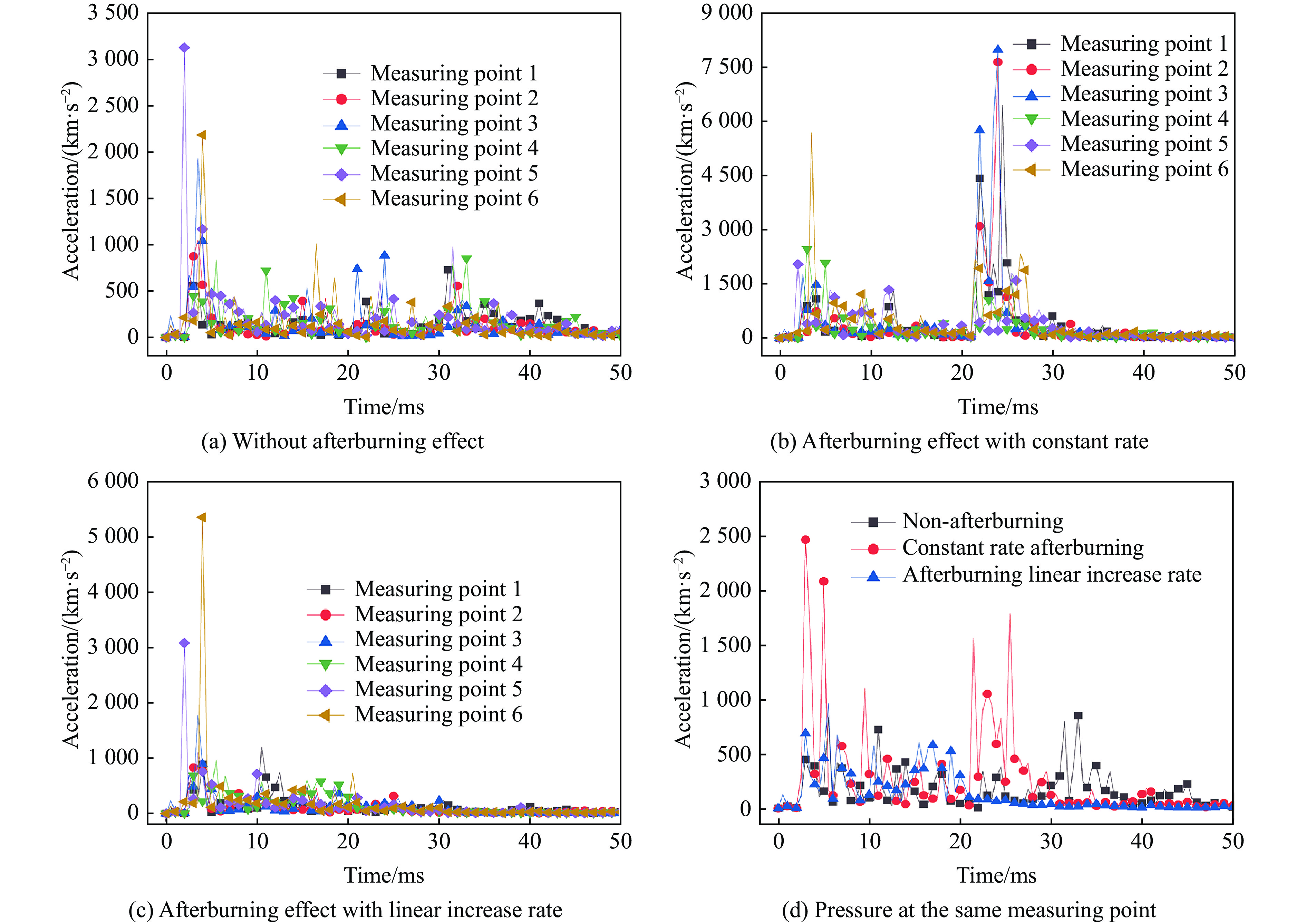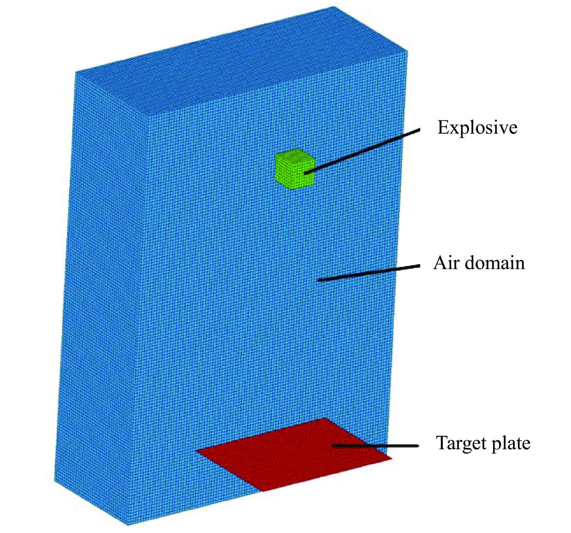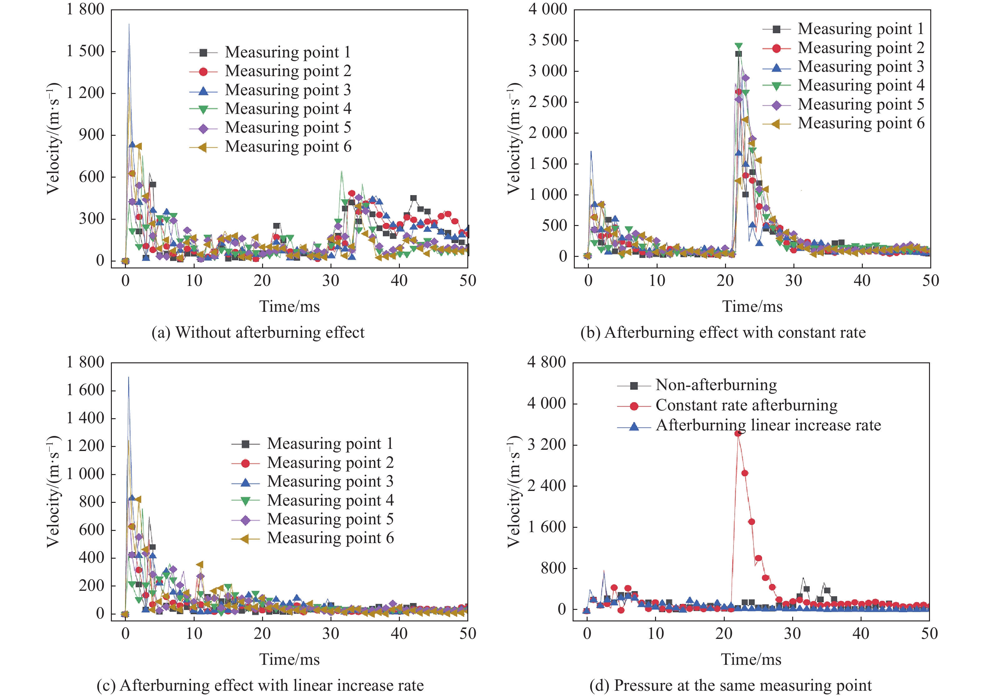 A Closed-Space Model was constructed using steel plates to examine the influence of afterburning energy load generated by explosive detonation products on the damage characteristics of confined space. Additionally, the quasi-static pressure in the confined space was simplified by applying the energy conservation law. Relying on the adiabatic index of the mixture of detonation products and air, as well as the complete afterburning degree of detonation products, a simulation method for the afterburning effect was proposed. This method was used to calculate the afterburning energy of detonation products and determine the beginning and ending times of the afterburning effect. The numerical simulation of implosion damage in a confined space was carried out by this method. The implosion simulation considering the afterburning energy load was performed by employing two simulation methods: constant reaction rate and linearly increasing reaction rate. The results were compared with the implosion simulation results without considering the afterburning effect. The influence and degree of change of the afterburning effect on the implosion damage characteristics were analyzed. It is found that the afterburning effect with different reaction rates has a significant influence on the detonation damage characteristics, except for the temperature, in confined spaces. Moreover, the enhancement effect of the constant reaction rate is the most significant. It increased the velocity and acceleration loads under implosion in the confined space by 42.67% and 71.21%, respectively. The overpressure and quasi-static pressure were increased by 74.42% and 74.95%, respectively, and the kinetic energy was increased by approximately 212%. The proposed simulation method for the afterburning effect can better simulate the dynamic response of implosion ruin in confined spaces and provides a more accurate simulation method of the afterburning effect for the design and evaluation of explosion-proof structures.