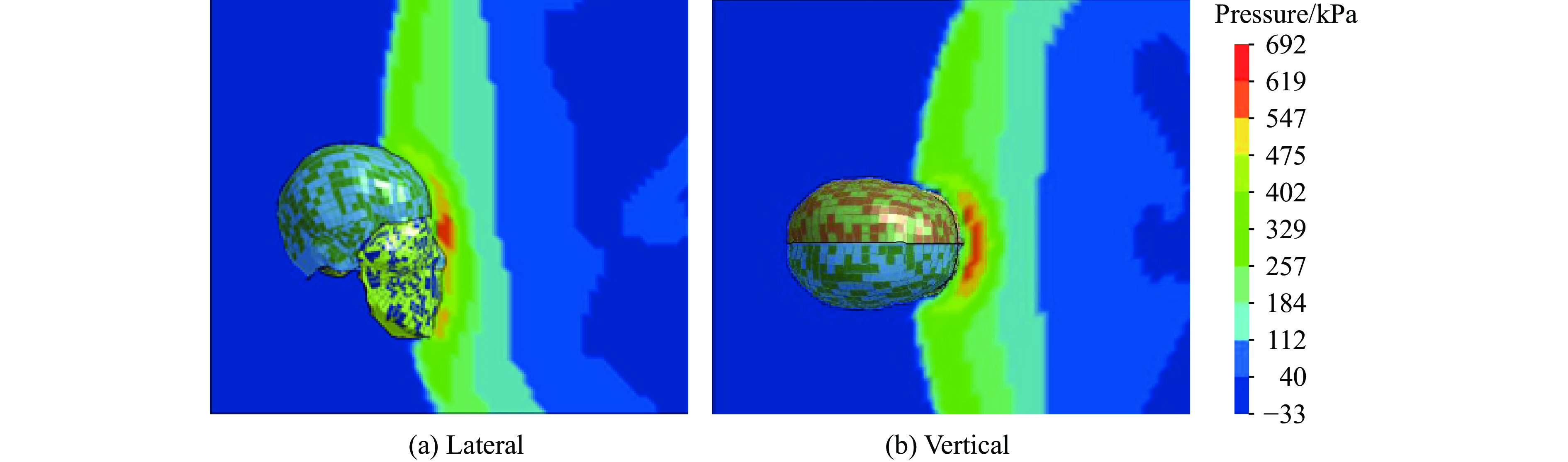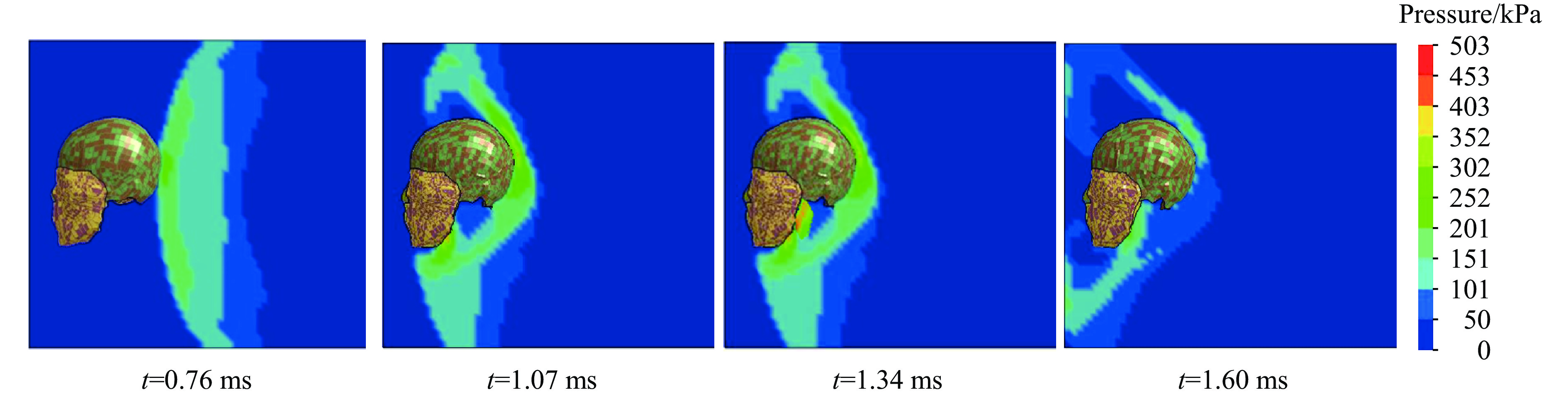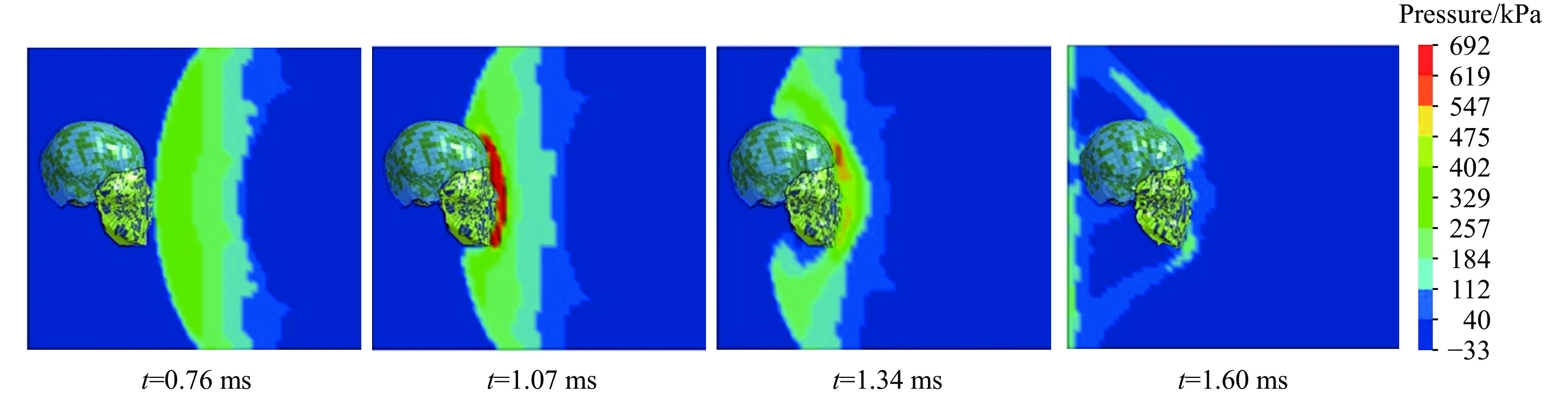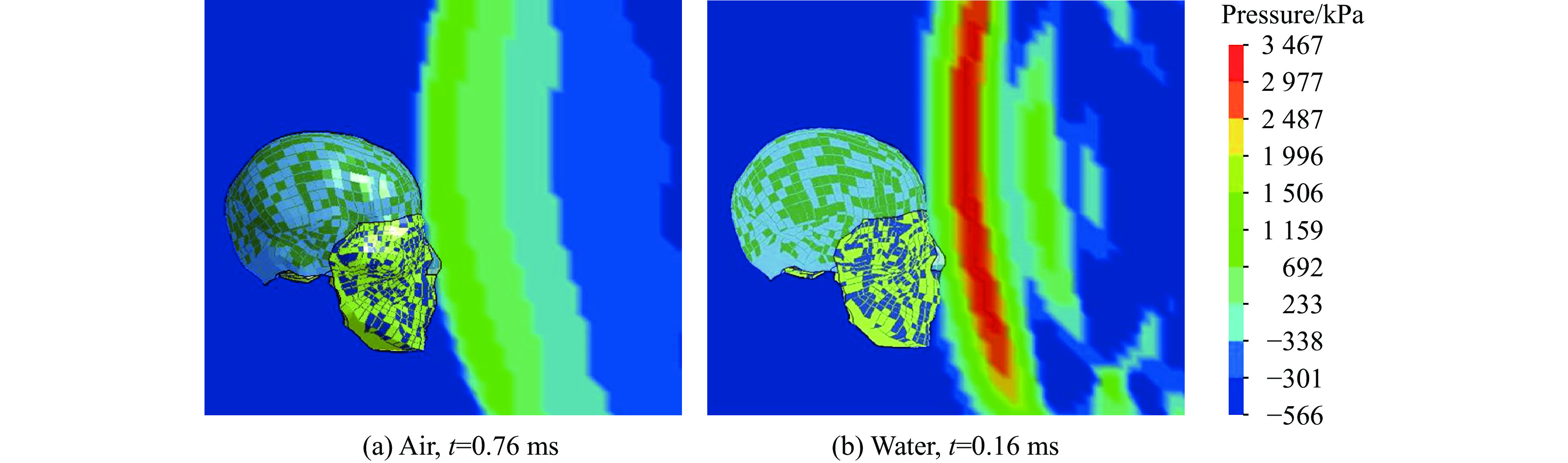 In military operations, industrial accidents and other explosive events, head injuries caused by blast shock waves have become one of the main injury forms of injury, but the injury mechanism and damage threshold have not been clarified yet. In this paper, numerical simulation is used to study the dynamic response process of the head under explosion load, and the effects of TNT charge, air and water media on the deformation, pressure and acceleration of the cranium and brain are analyzed. First, the air-head fluid-structure interaction model is established using Euler-Lagrangian coupling method. Based on the validation of its effectiveness, the dynamic response process of the head was analyzed in terms of pressure, acceleration and frequency of the prefrontal cranium and brain tissue. By setting the initial conditions and boundary conditions, the effects of frontal and the behind shock loadings of the blast wave on the head were simulated. It has been found that the head tissue vibrates at high frequencies, up to 7 kHz, when the blast wave strikes the head directly. The acceleration on the prefrontal cranium and brain tissue had a large value initially and become small in the late stage, while the intracranial pressure varied in a cyclical manner. In the underwater environment, there were high-frequency periodic overpressure fluctuations in the brain tissues of frontal, parietal and temporal lobes, in which peak overpressure of 3.64 MPa can be generated in the prefrontal cranium, which is well above the threshold of 235 kPa for severe brain injury. In water, brain tissue is subjected to 5 times the peak pressure, a 5 fold increase in acceleration and a 2 fold increase in frequency compared to those in air. The results of this research provide a new perspective for understanding the mechanism of damage to the human brain caused by blast shock waves, and an reference for the development of future protective measures.