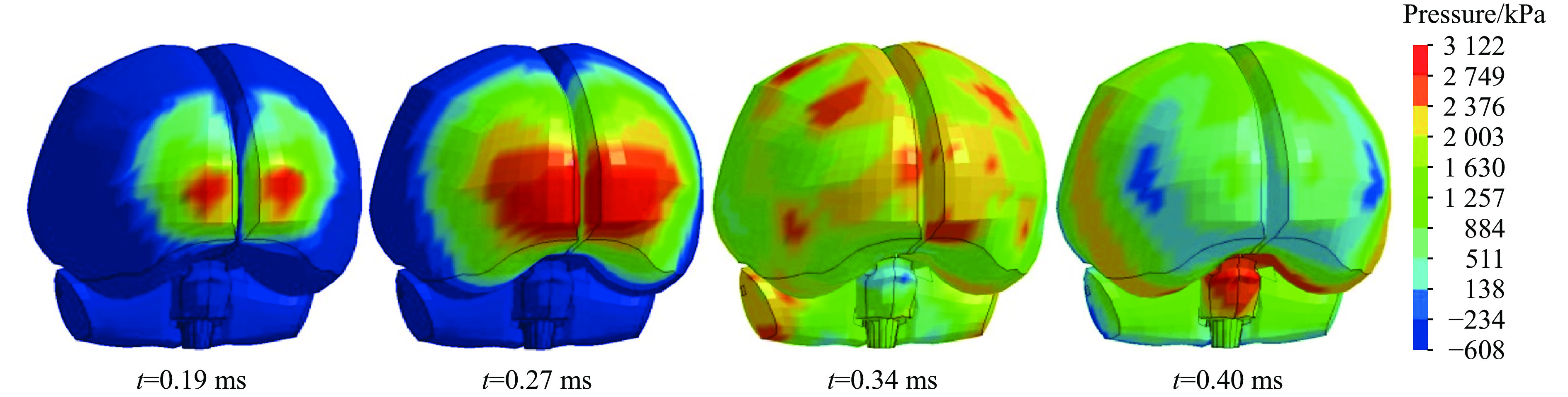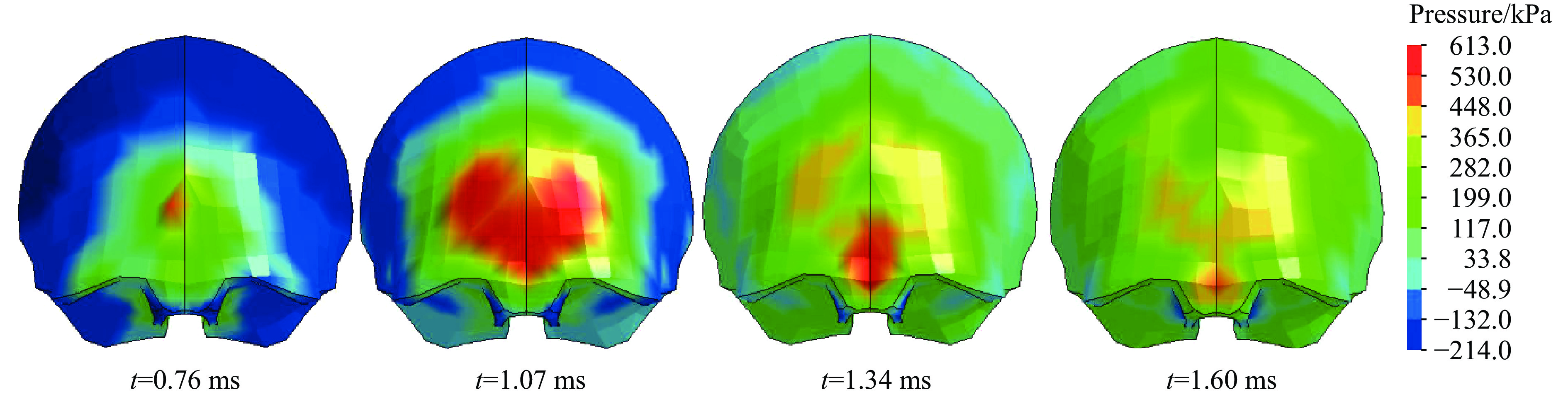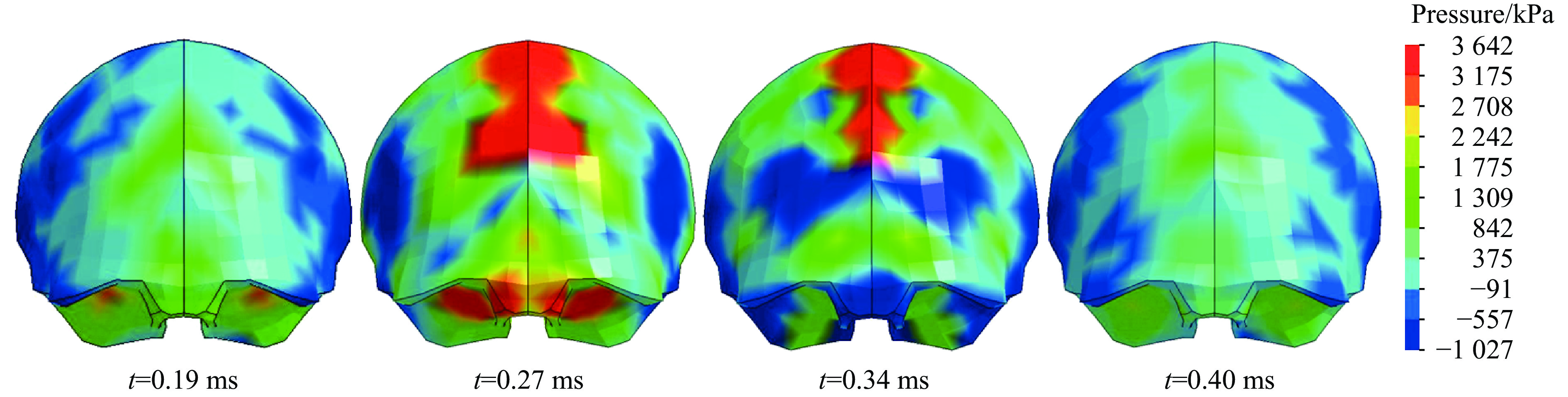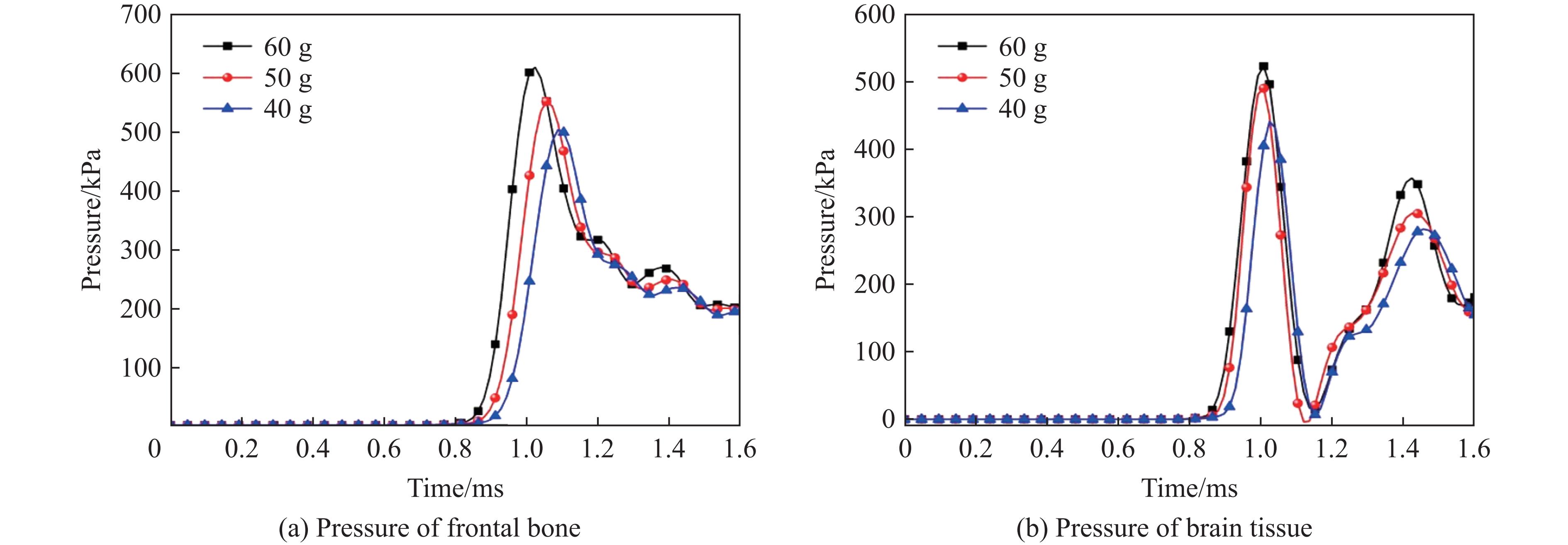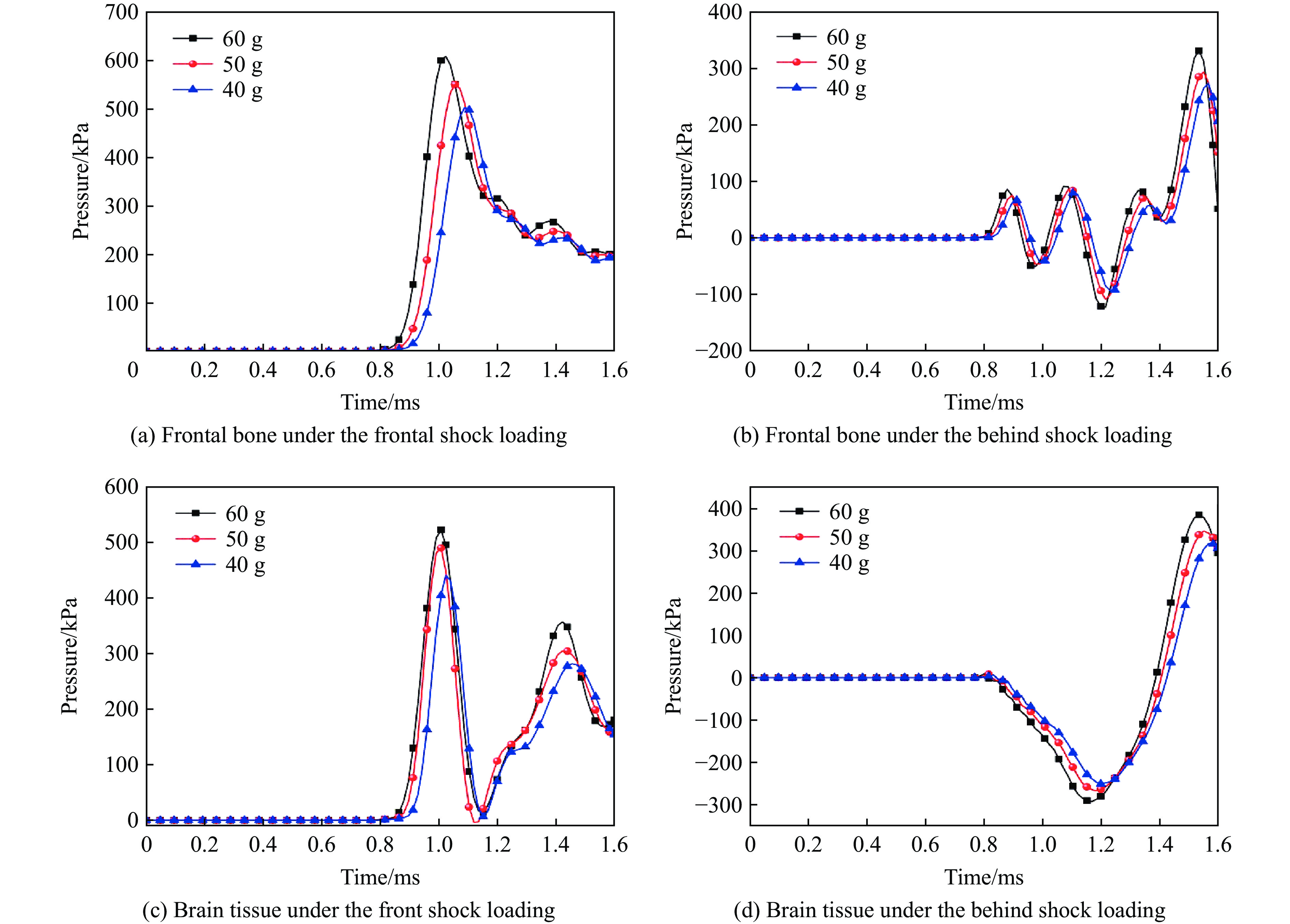 In military operations, industrial accidents and other explosive events, head injuries caused by blast shock waves have become one of the main injury forms of injury, but the injury mechanism and damage threshold have not been clarified yet. In this paper, numerical simulation is used to study the dynamic response process of the head under explosion load, and the effects of TNT charge, air and water media on the deformation, pressure and acceleration of the cranium and brain are analyzed. First, the air-head fluid-structure interaction model is established using Euler-Lagrangian coupling method. Based on the validation of its effectiveness, the dynamic response process of the head was analyzed in terms of pressure, acceleration and frequency of the prefrontal cranium and brain tissue. By setting the initial conditions and boundary conditions, the effects of frontal and the behind shock loadings of the blast wave on the head were simulated. It has been found that the head tissue vibrates at high frequencies, up to 7 kHz, when the blast wave strikes the head directly. The acceleration on the prefrontal cranium and brain tissue had a large value initially and become small in the late stage, while the intracranial pressure varied in a cyclical manner. In the underwater environment, there were high-frequency periodic overpressure fluctuations in the brain tissues of frontal, parietal and temporal lobes, in which peak overpressure of 3.64 MPa can be generated in the prefrontal cranium, which is well above the threshold of 235 kPa for severe brain injury. In water, brain tissue is subjected to 5 times the peak pressure, a 5 fold increase in acceleration and a 2 fold increase in frequency compared to those in air. The results of this research provide a new perspective for understanding the mechanism of damage to the human brain caused by blast shock waves, and an reference for the development of future protective measures.