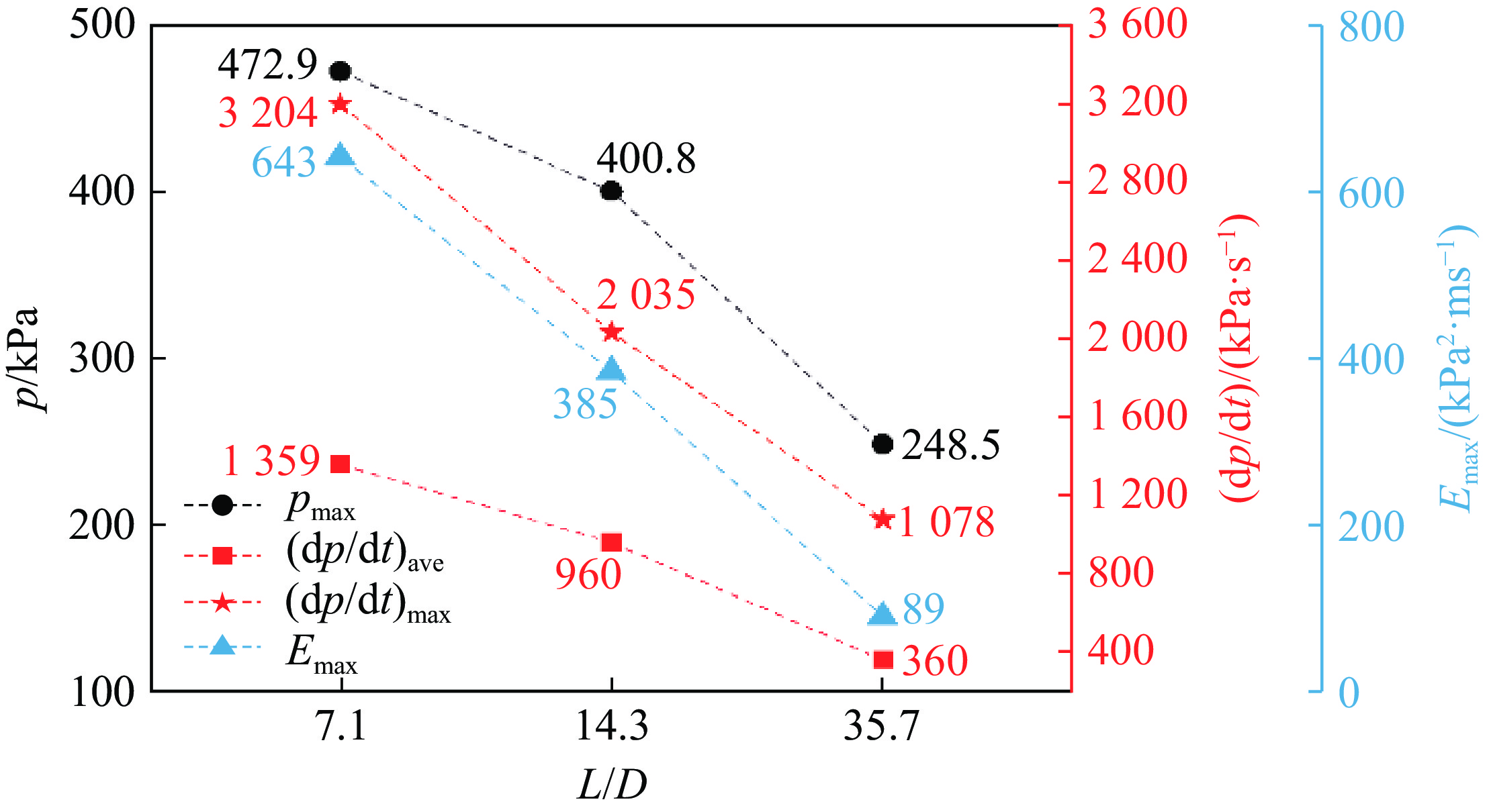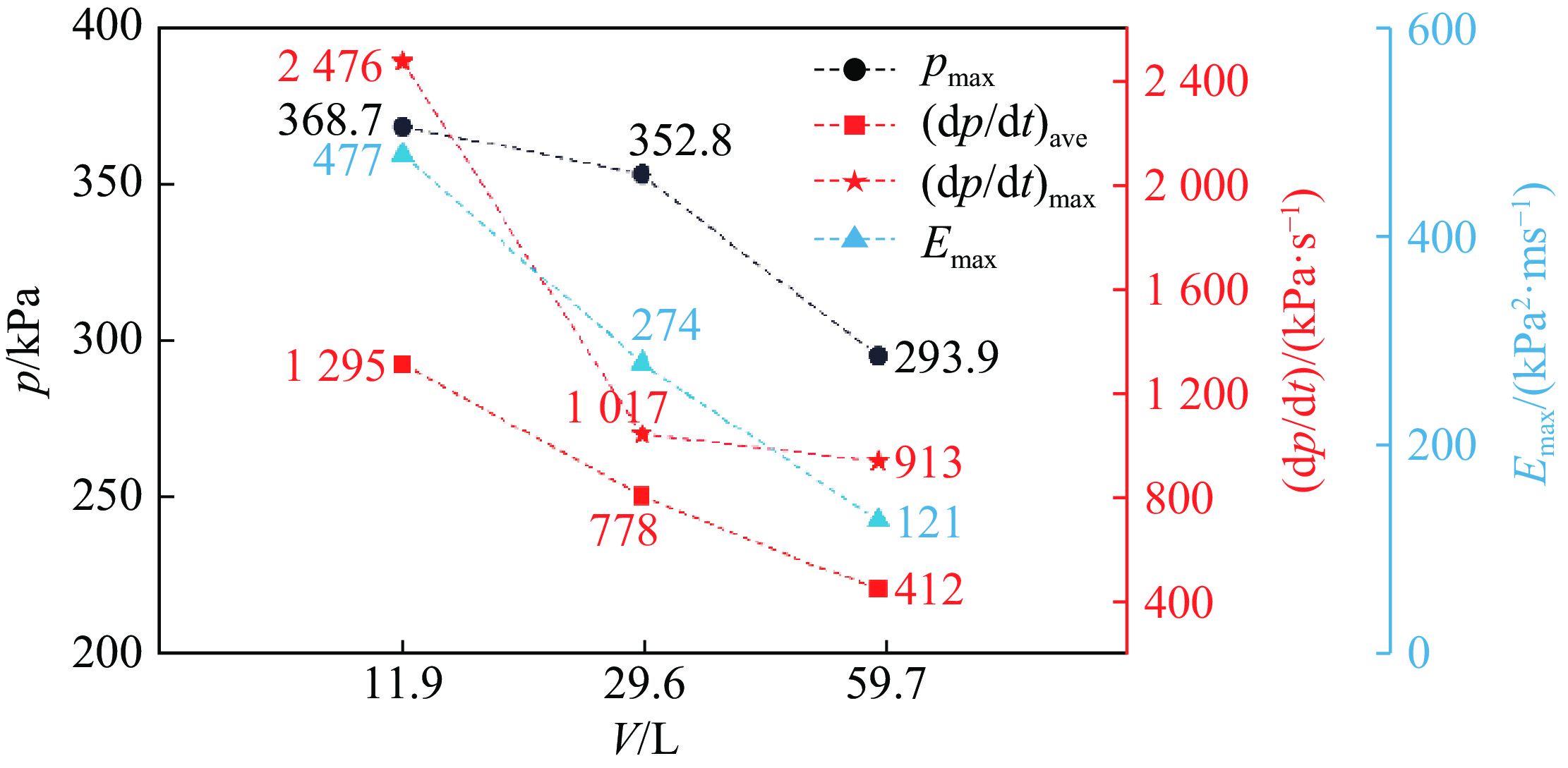 In order to effectively predict and control the consequences of fuel-air mixture explosions in enclosed spaces and thereby reduce the casualties and property losses caused by accidents, the relationship between the explosive overpressure characteristics of fuel-air mixtures and the spatial scale of explosions was investigated. Closed square pipes with varying length-diameter ratios, volumes, and lengths were used to examine the impact of fuel-air mixture explosion overpressure characteristics by keeping the initial oil and gas concentration, ignition position, and ignition energy constant. The experimental results show that the rate of overpressure rise goes through three stages: a rapid increase period, a continuous oscillation period, and an attenuation termination period, which reveals the dynamic relationship between reaction rate and heat loss. The reduce of the nozzle area and the increase of the internal surface area of the pipeline can both lead to the decrease of the maximum overpressure, the average overpressure rise rate, the maximum overpressure rise rate, and the explosion power. The further analysis of the experimental results reveals that the change in the nozzle area will directly affect the flame front area and reaction rate, with a more direct and significant impact on the maximum overpressure. The changes in the inner surface area have a relatively indirect effect on the maximum overpressure by regulating energy transfer and heat loss. Additionally, pipeline length is a crucial factor affecting the time to reach the maximum overpressure. The increase of the pipeline length not only increases the heat loss but also delays the superposition time point of the reflected wave and the incident wave, with the energy of the reflected wave undergoing relative attenuation.