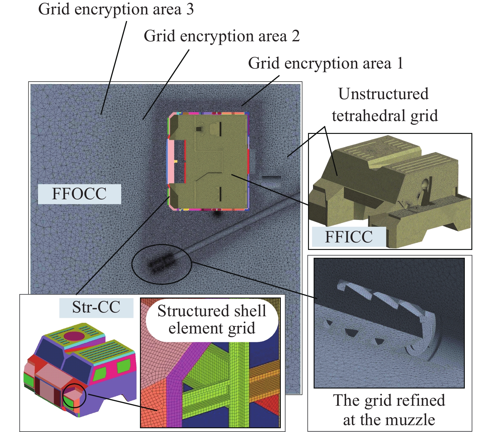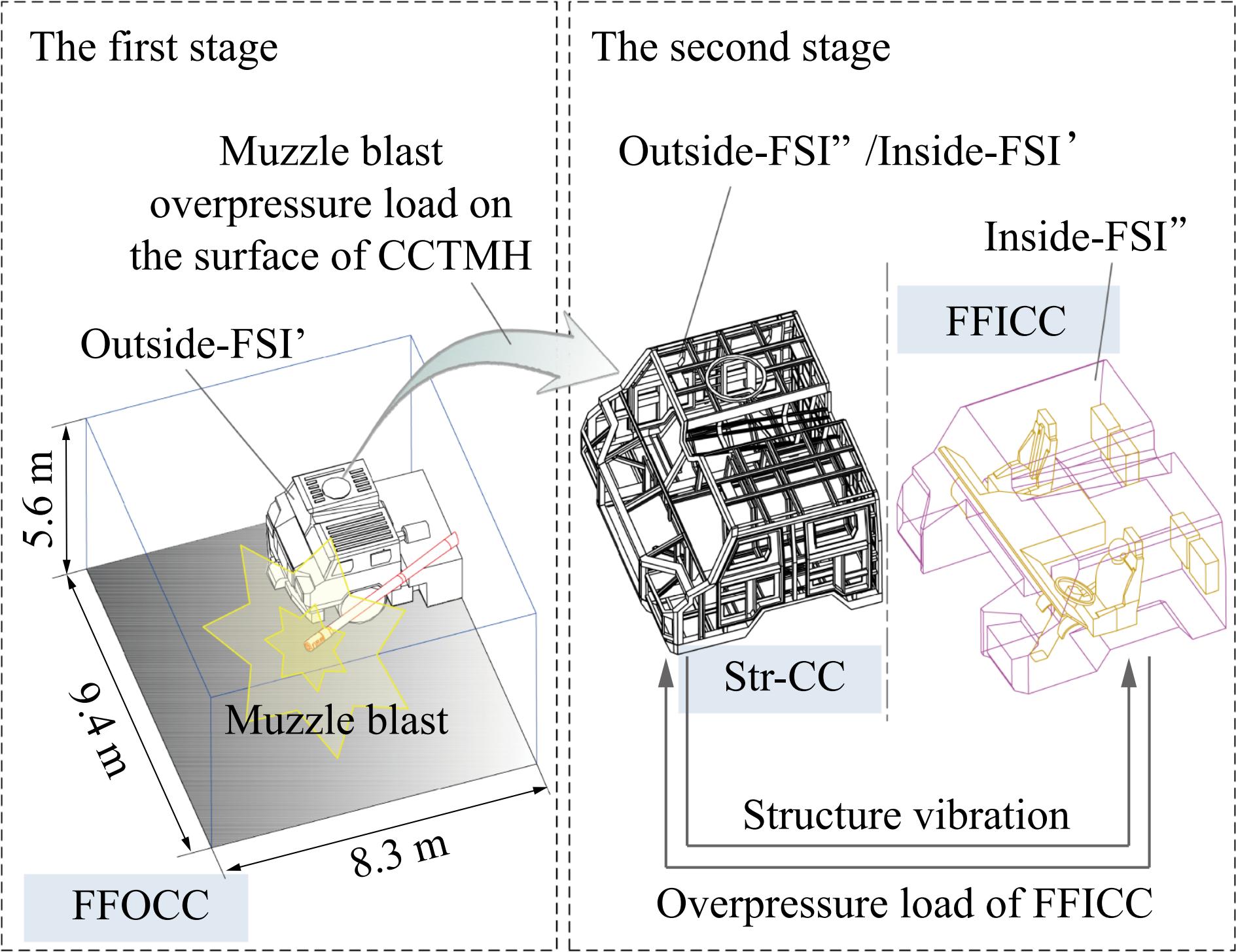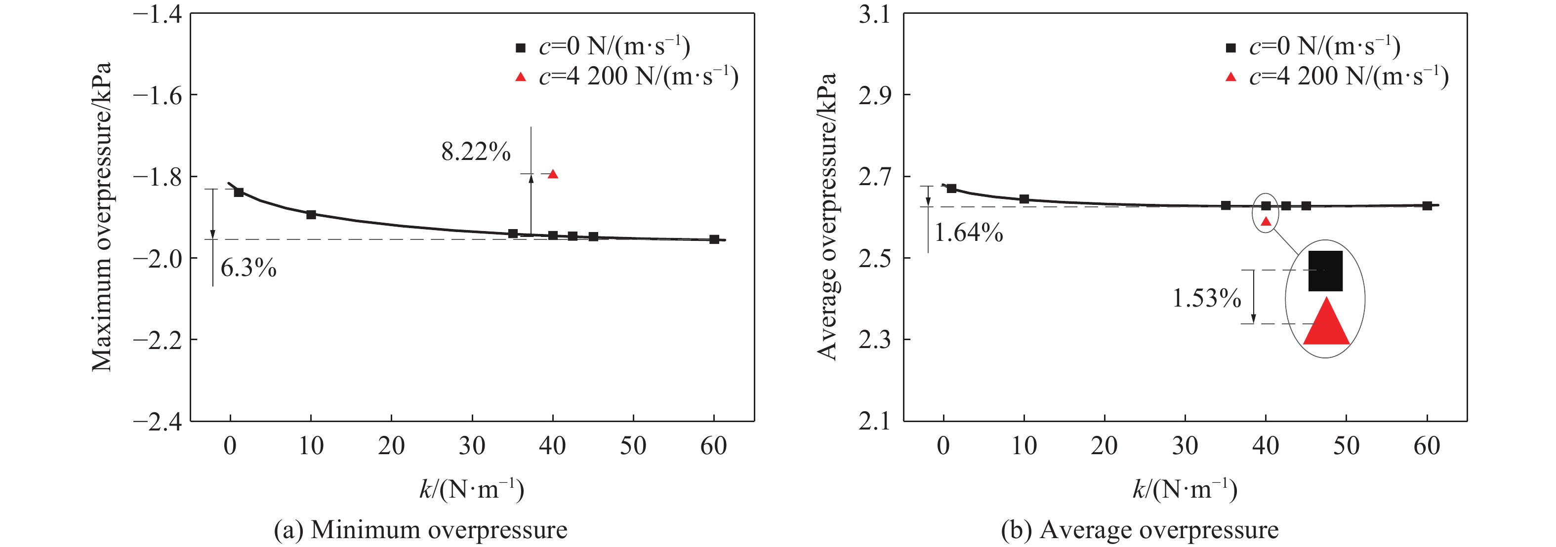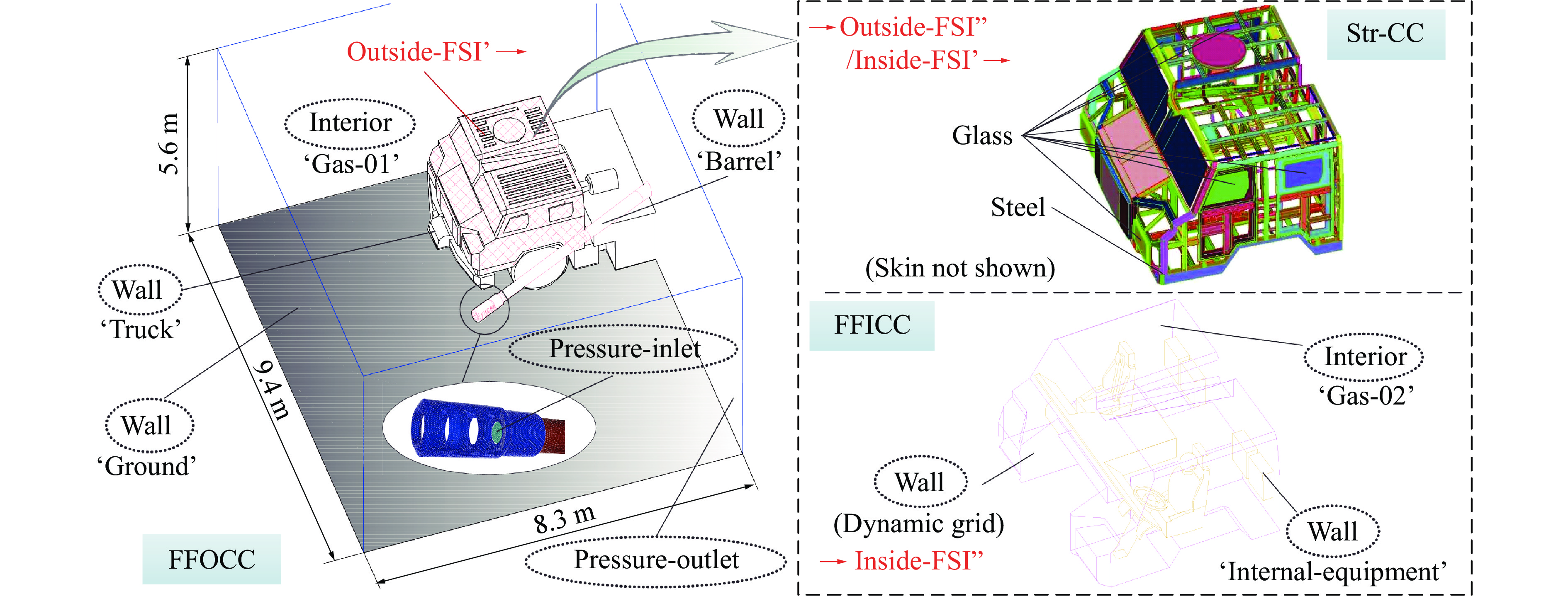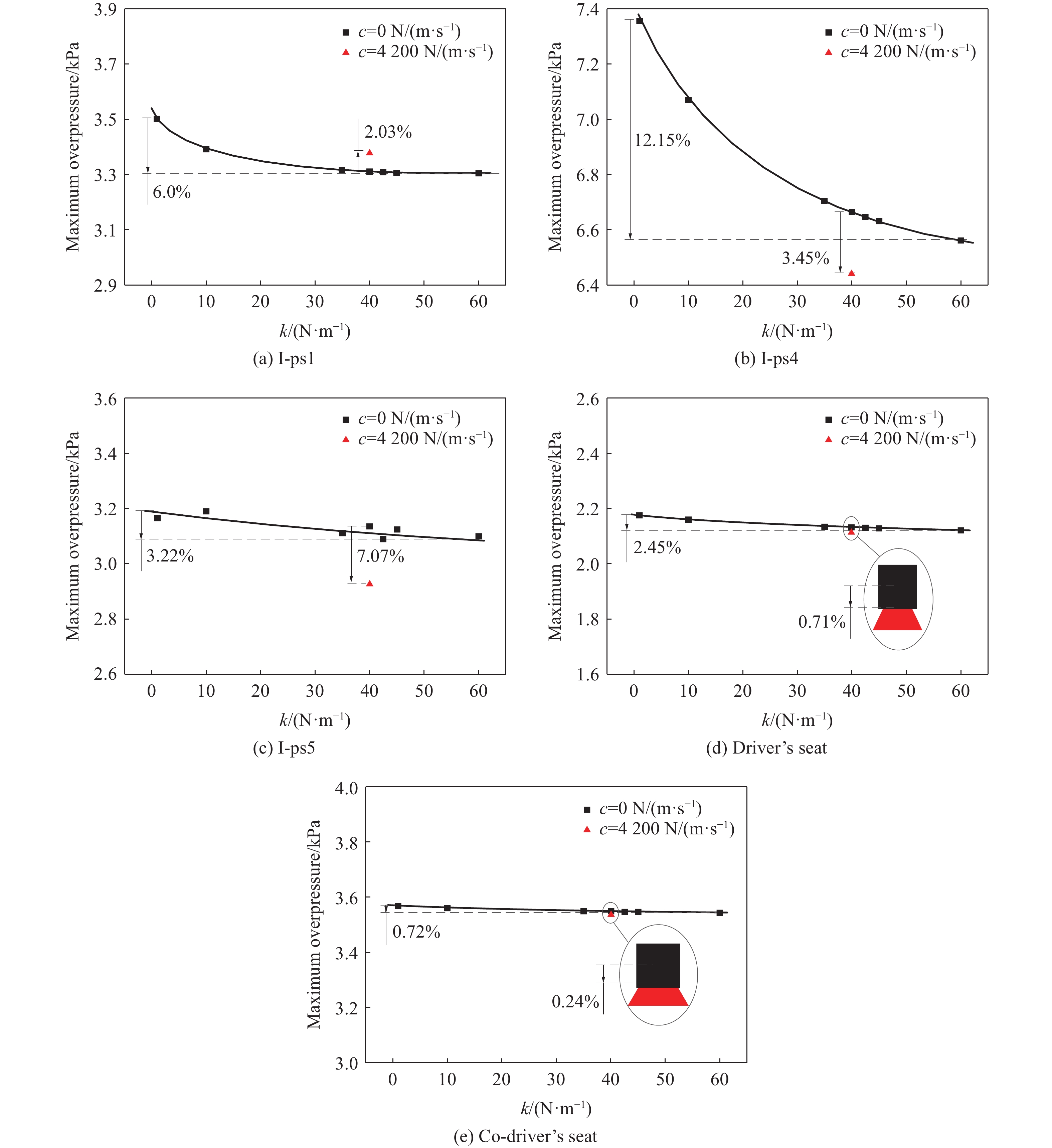 During firing of a truck-mounted howitzer, the crew compartment structure deforms elastically due to the muzzle blast load, creating pressure disturbances in the internal flow field of cabin. The resulting overpressure causes a significant threat to personnel and equipment safety. To meet driving requirements, the crew compartment of the truck-mounted howitzer is suspended on the chassis frame via an elastic support structure. At the same time, the stiffness and damping of the support structure are important factors affecting the deformation response of the cabin structure under the impact of the muzzle blast load. Therefore, adjusting the support parameters to optimize the flow field environment inside the crew compartment demonstrates high practical utility. To investigate the effects of different cabin support conditions on the flow field overpressure inside the crew compartment of a truck-mounted howitzer, a foreign trade type of equipment was taken as the object. An entire path numerical model simulating the shock wave propagation from the cannon's muzzle to the interior of the cabin under extreme firing conditions was established. Systematic validation tests were conducted, capturing overpressure data in both the external and internal flow fields of the crew compartment, as well as the acceleration of the cabin structure. Based on the validated numerical model, simulations were performed to calculate the structural responses and internal flow field overpressures under eight different support conditions. The results indicate that while different areas within the cabin exhibit varying sensitivity to changes in support conditions, increasing the support stiffness leads to significant reductions in the peak acceleration and velocity of the cabin structure, as well as a decrease in the peak overpressure within the internal flow field. However, the presence of damping in the support structure significantly enhances the acceleration response of the cabin structure, yet it further diminishes its velocity response and lower the peak overpressure in the internal flow field of the crew compartment.