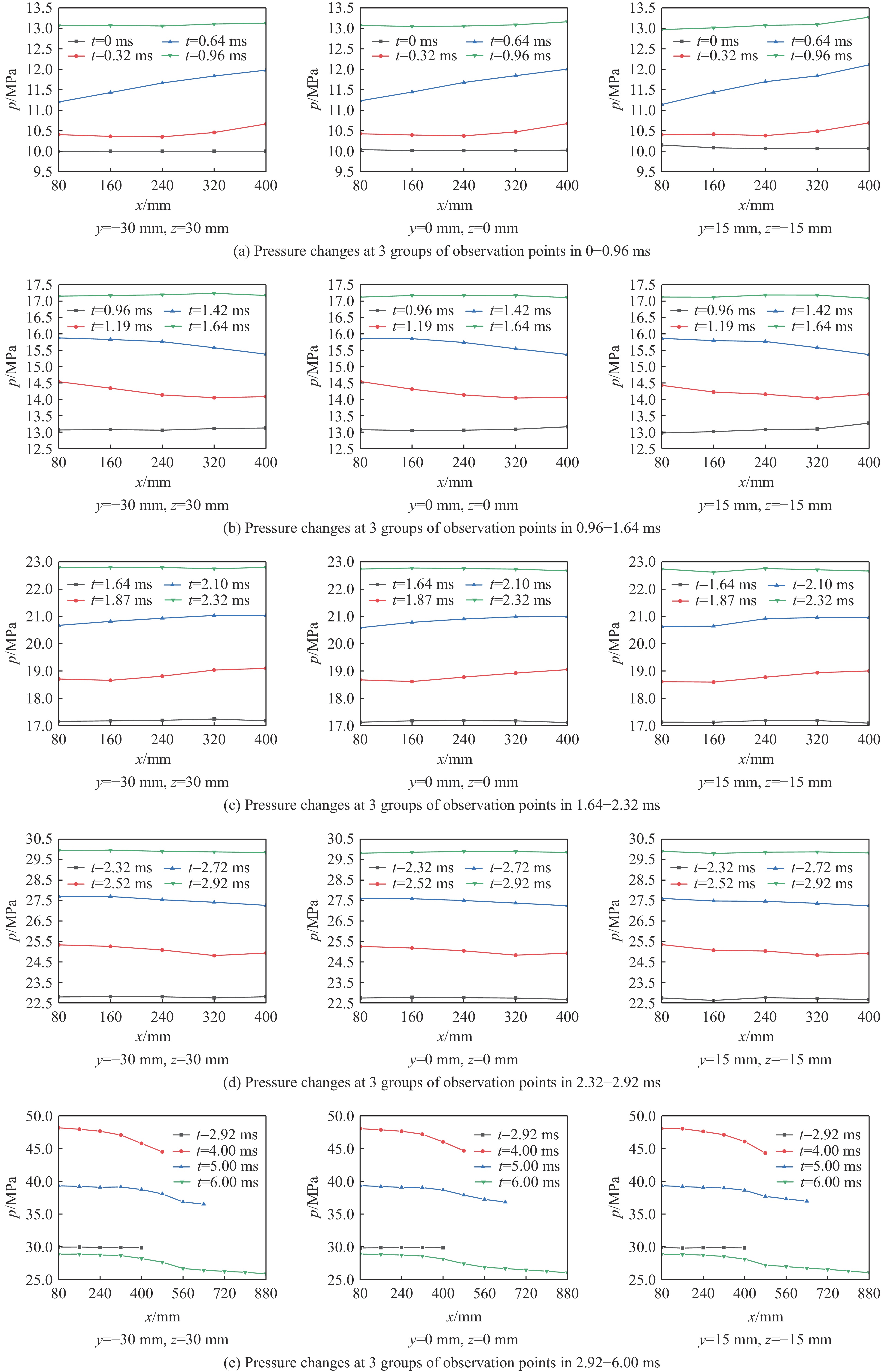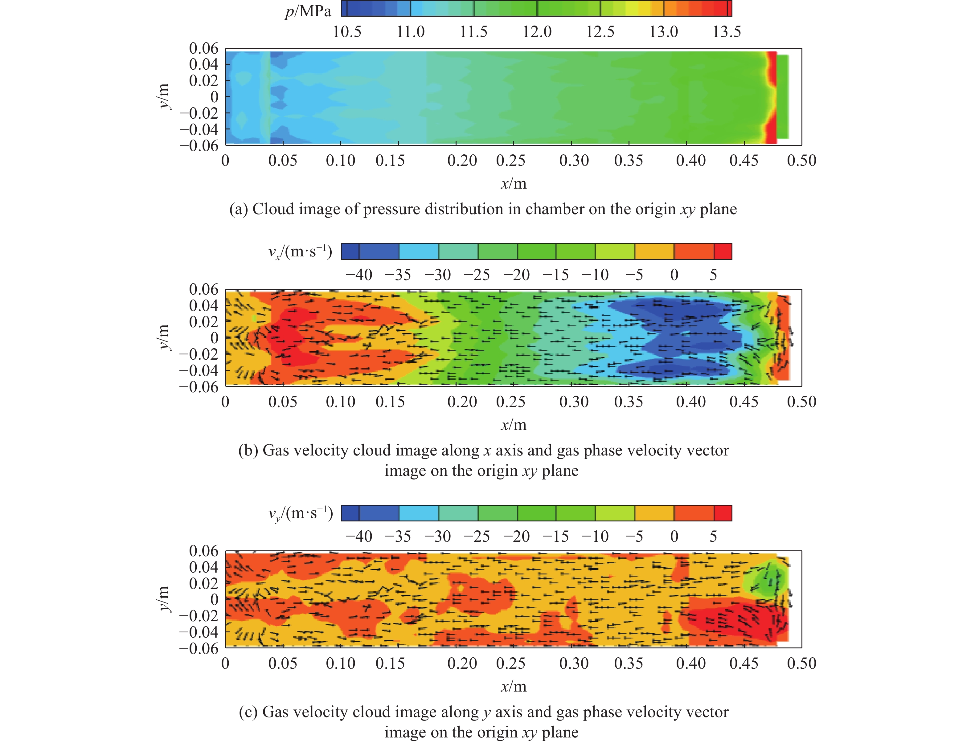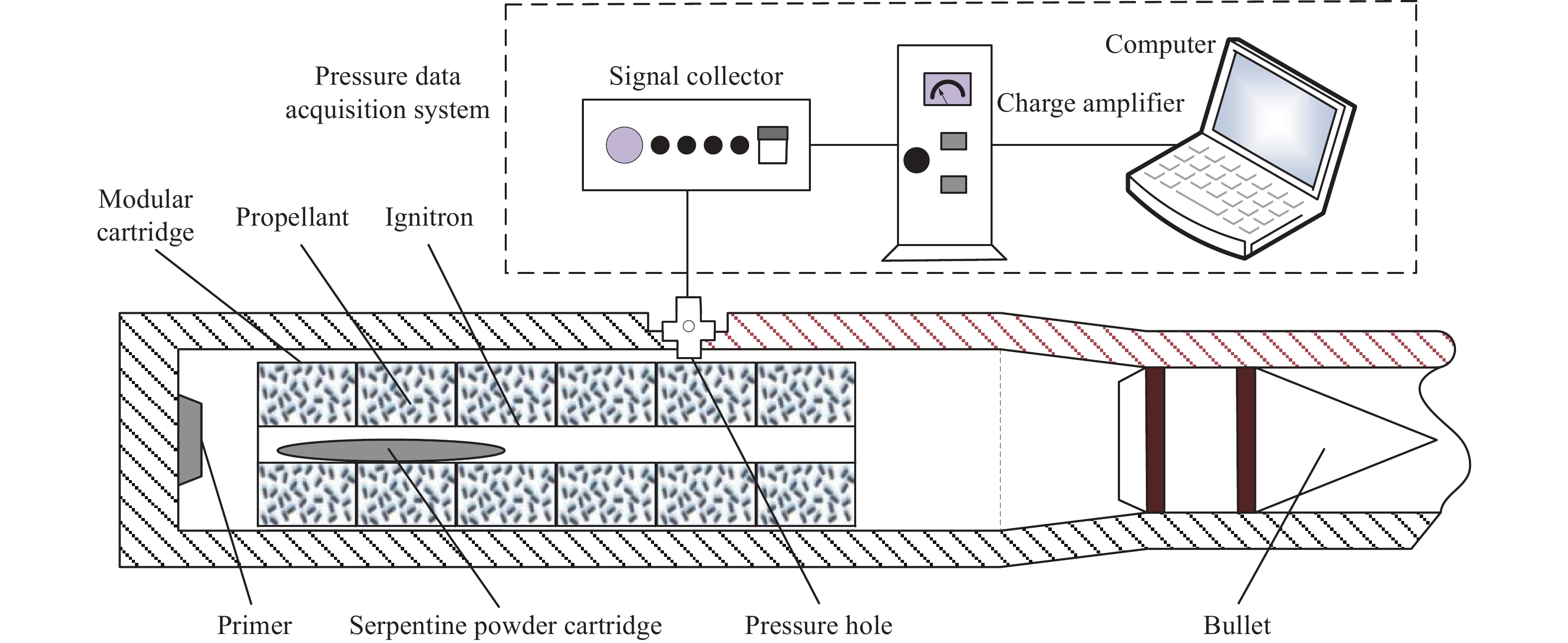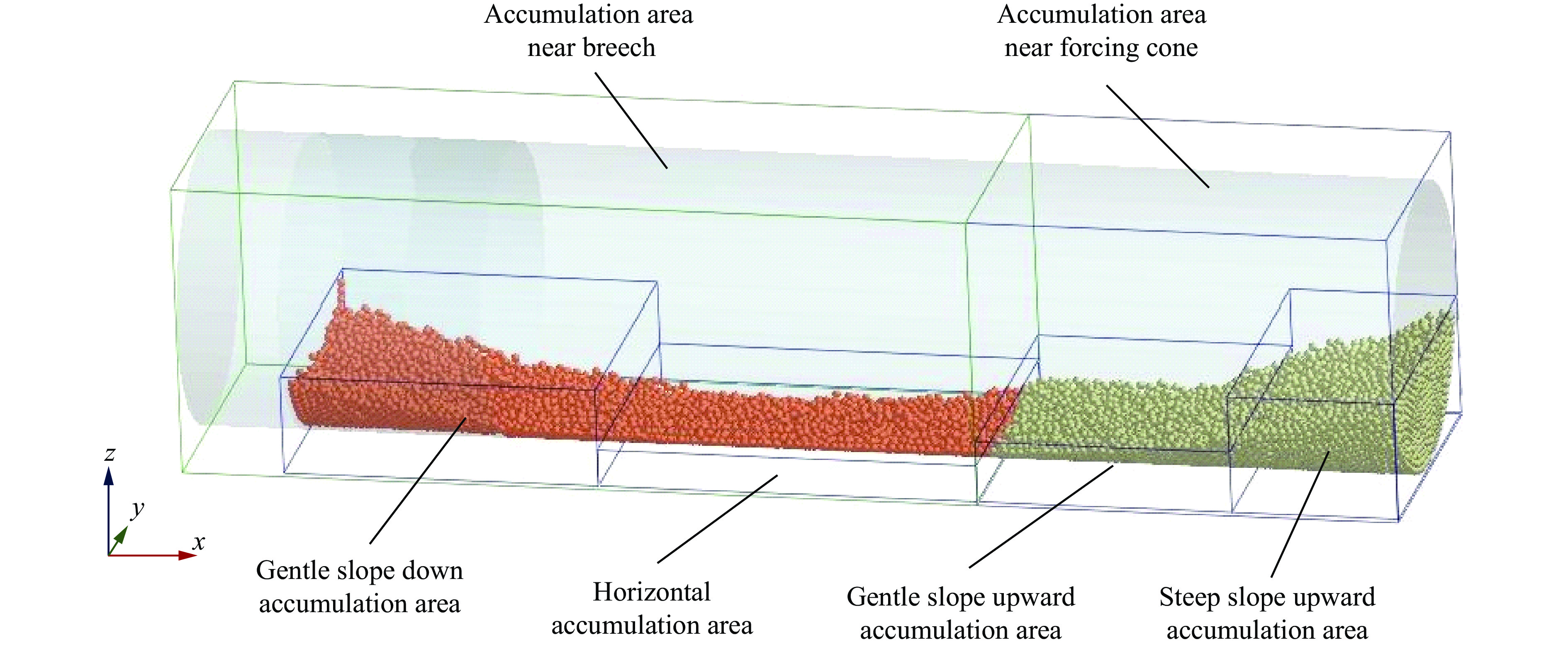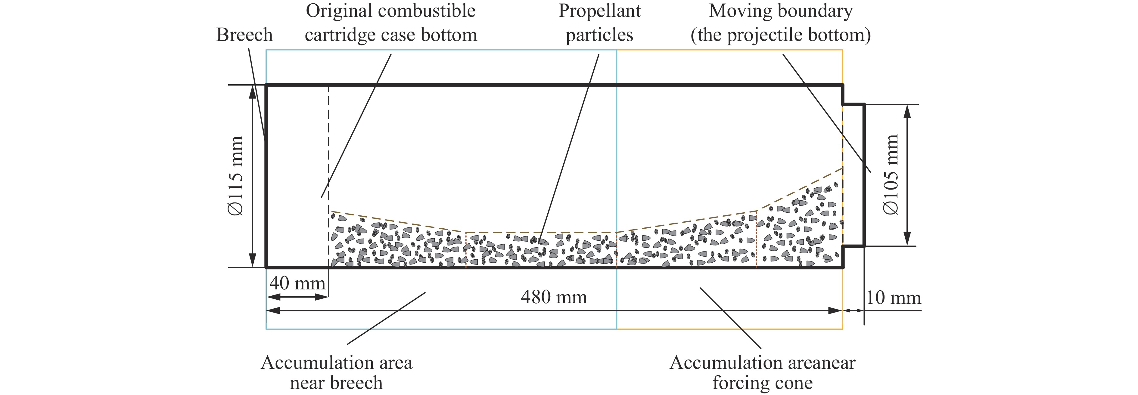 To explore the influence of the propellant bed accumulation distribution on the three-dimensional characteristics of initial pressure wave in the chamber during the internal ballistic process of a large-caliber modular charge gun, a three-dimensional gas-solid two-phase combustion dynamic model of the modular charge was established. Firstly, solid powder particles were treated as discrete phase. Based on Euler-Lagrange method, the motion law and accumulation distribution of propellant particles under different initial broken sizes of cartridge end caps were simulated. Then, the propellant particles were treated as continuous phase and the evolution of pressure distribution in the chamber after combustion of the powder bed with different accumulation distribution was numerically simulated using the Euler-Euler method. The results show that the characteristics of the three-dimensional flow field in the bore are affected by the difference of the initial fracture size of the cartridge end cap. When the initial breaking angle of the cartridge end cap increases from 0° to 120°, the difference of the propellant particles in the area near breech and the area near forcing cone decreases from 12.2% to 0.6% after the dispersion and settlement of the propellant particles. Additionally, the absolute value of the initial negative pressure difference between the breech and the forcing cone decreases from 1.62 MPa to 0.76 MPa. The start-up time of the bullet is extended from 2.82 ms to 2.94 ms, and the time required for the forcing cone pressure to reach its peak is increases from 4.04 ms to 4.20 ms. At the same time, complex three-dimensional pressure fluctuations were observed in the chamber. Before the bullet movement, the chamber pressure can be divided into four pressure evolution characteristics along the X-axis direction, presenting the pressure with no changing, gradually decreasing, first decreasing and then increasing, as well as gradually increasing. After the bullet movement, the chamber pressure consistently decreases along the X-axis direction. However, along the Y-axis direction, the pressure in the chamber remains essentially unchanged before and after the bullet movement. The pressure in the chamber can be also divided into four pressure evolution characteristics along the Z-axis direction, presenting basically maintaining a constant level, gradually decreasing, first decreasing and then increasing, first decreasing and then increasing and then decreasing. The research results have some reference value for the interior ballistic safety analysis of modular charge guns.