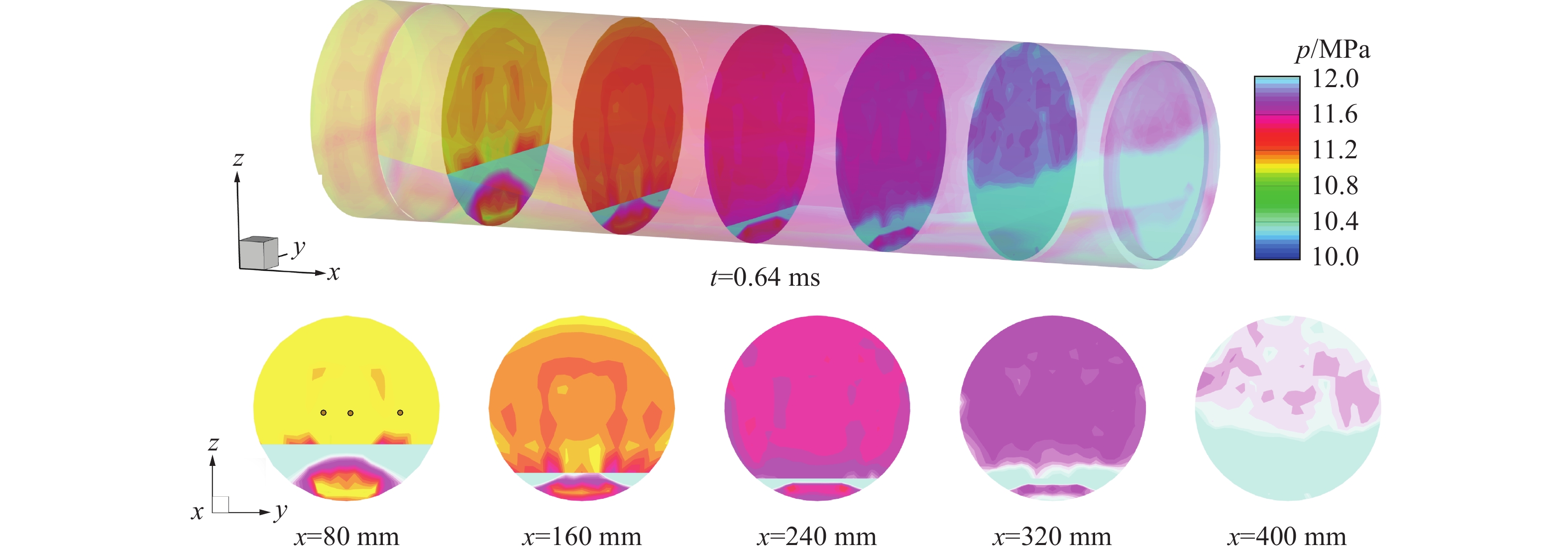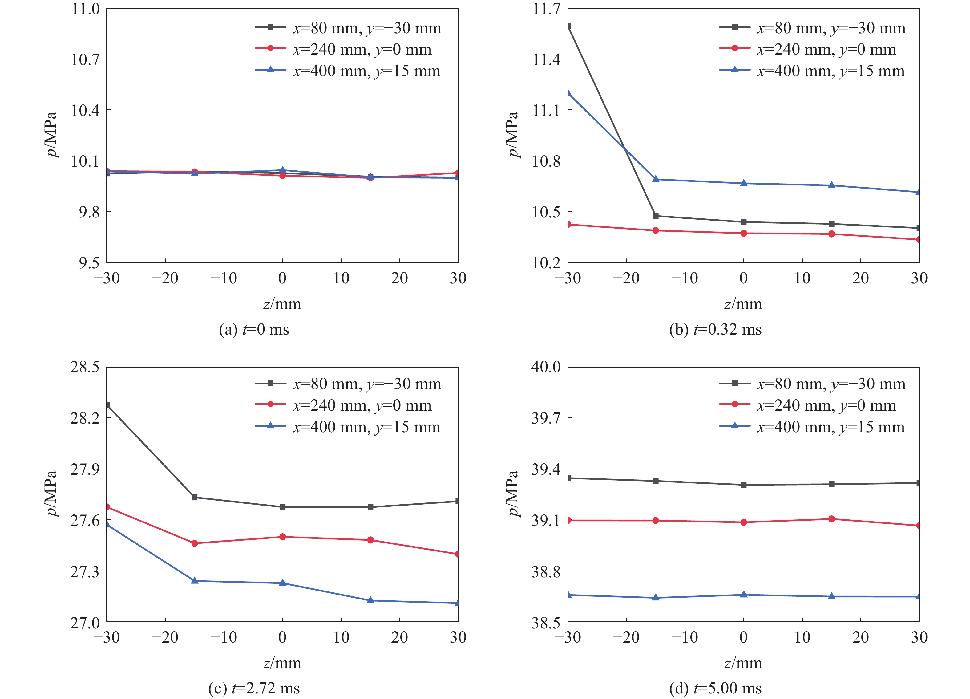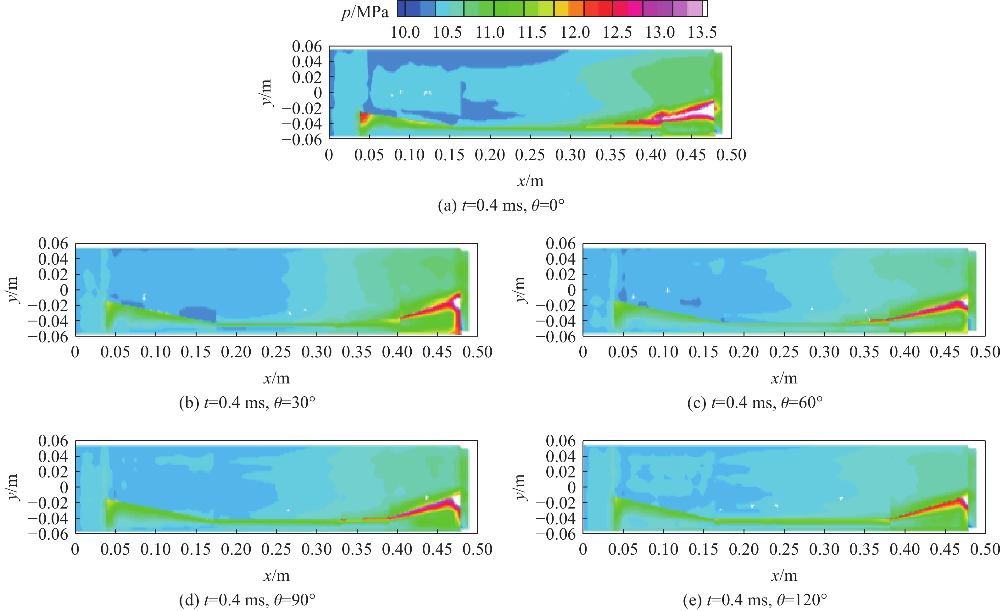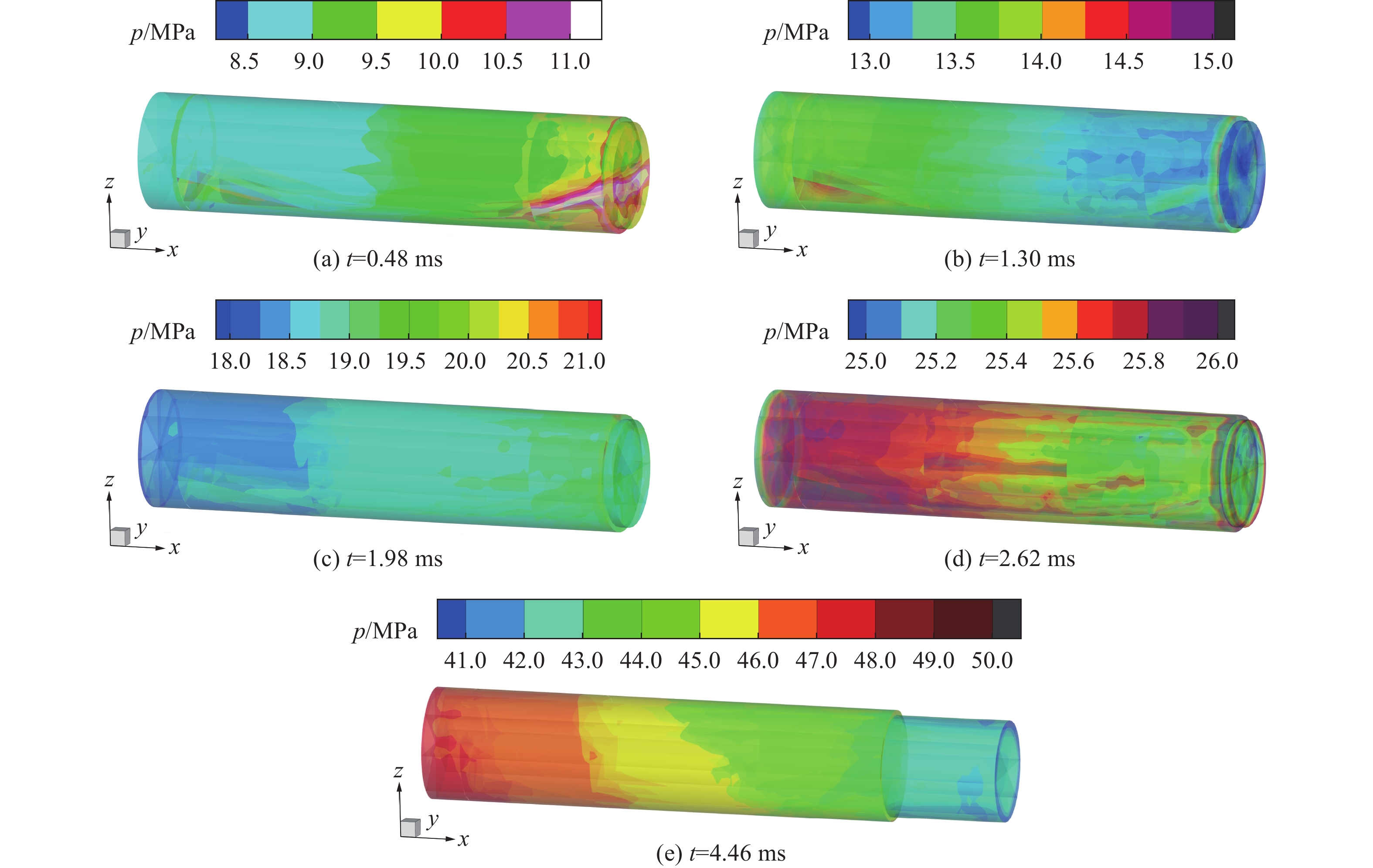To explore the influence of the propellant bed accumulation distribution on the three-dimensional characteristics of initial pressure wave in the chamber during the internal ballistic process of a large-caliber modular charge gun, a three-dimensional gas-solid two-phase combustion dynamic model of the modular charge was established. Firstly, solid powder particles were treated as discrete phase. Based on Euler-Lagrange method, the motion law and accumulation distribution of propellant particles under different initial broken sizes of cartridge end caps were simulated. Then, the propellant particles were treated as continuous phase and the evolution of pressure distribution in the chamber after combustion of the powder bed with different accumulation distribution was numerically simulated using the Euler-Euler method. The results show that the characteristics of the three-dimensional flow field in the bore are affected by the difference of the initial fracture size of the cartridge end cap. When the initial breaking angle of the cartridge end cap increases from 0° to 120°, the difference of the propellant particles in the area near breech and the area near forcing cone decreases from 12.2% to 0.6% after the dispersion and settlement of the propellant particles. Additionally, the absolute value of the initial negative pressure difference between the breech and the forcing cone decreases from 1.62 MPa to 0.76 MPa. The start-up time of the bullet is extended from 2.82 ms to 2.94 ms, and the time required for the forcing cone pressure to reach its peak is increases from 4.04 ms to 4.20 ms. At the same time, complex three-dimensional pressure fluctuations were observed in the chamber. Before the bullet movement, the chamber pressure can be divided into four pressure evolution characteristics along the X-axis direction, presenting the pressure with no changing, gradually decreasing, first decreasing and then increasing, as well as gradually increasing. After the bullet movement, the chamber pressure consistently decreases along the X-axis direction. However, along the Y-axis direction, the pressure in the chamber remains essentially unchanged before and after the bullet movement. The pressure in the chamber can be also divided into four pressure evolution characteristics along the Z-axis direction, presenting basically maintaining a constant level, gradually decreasing, first decreasing and then increasing, first decreasing and then increasing and then decreasing. The research results have some reference value for the interior ballistic safety analysis of modular charge guns.