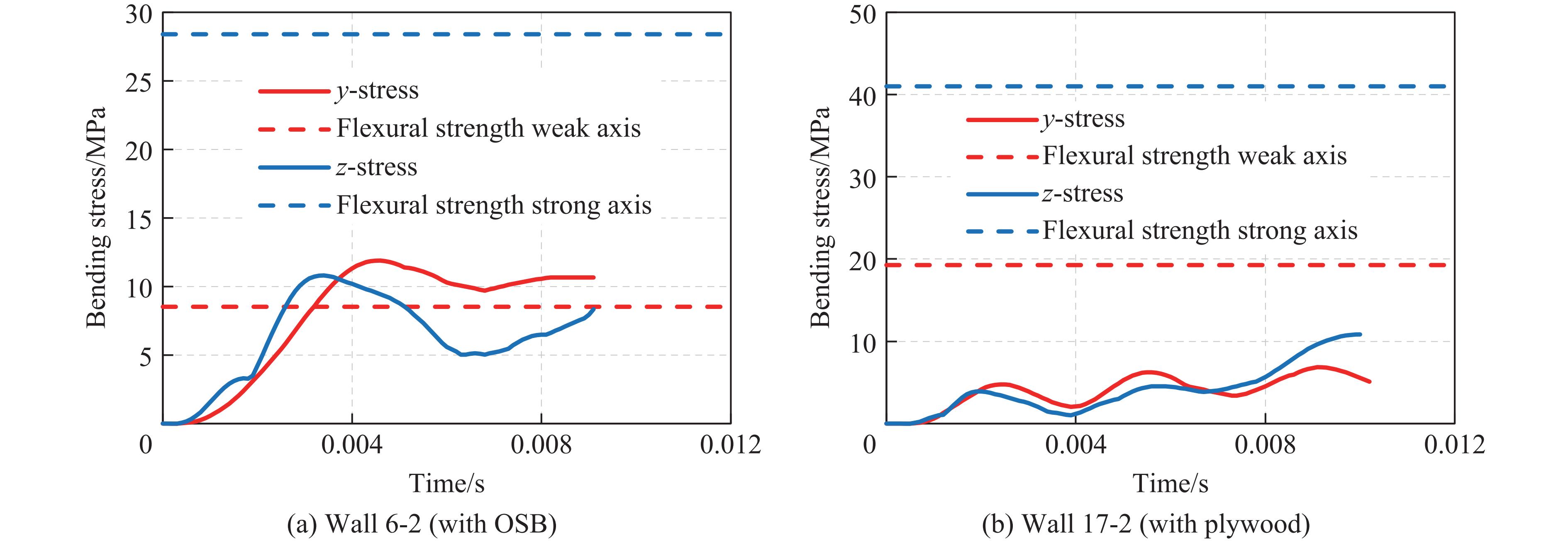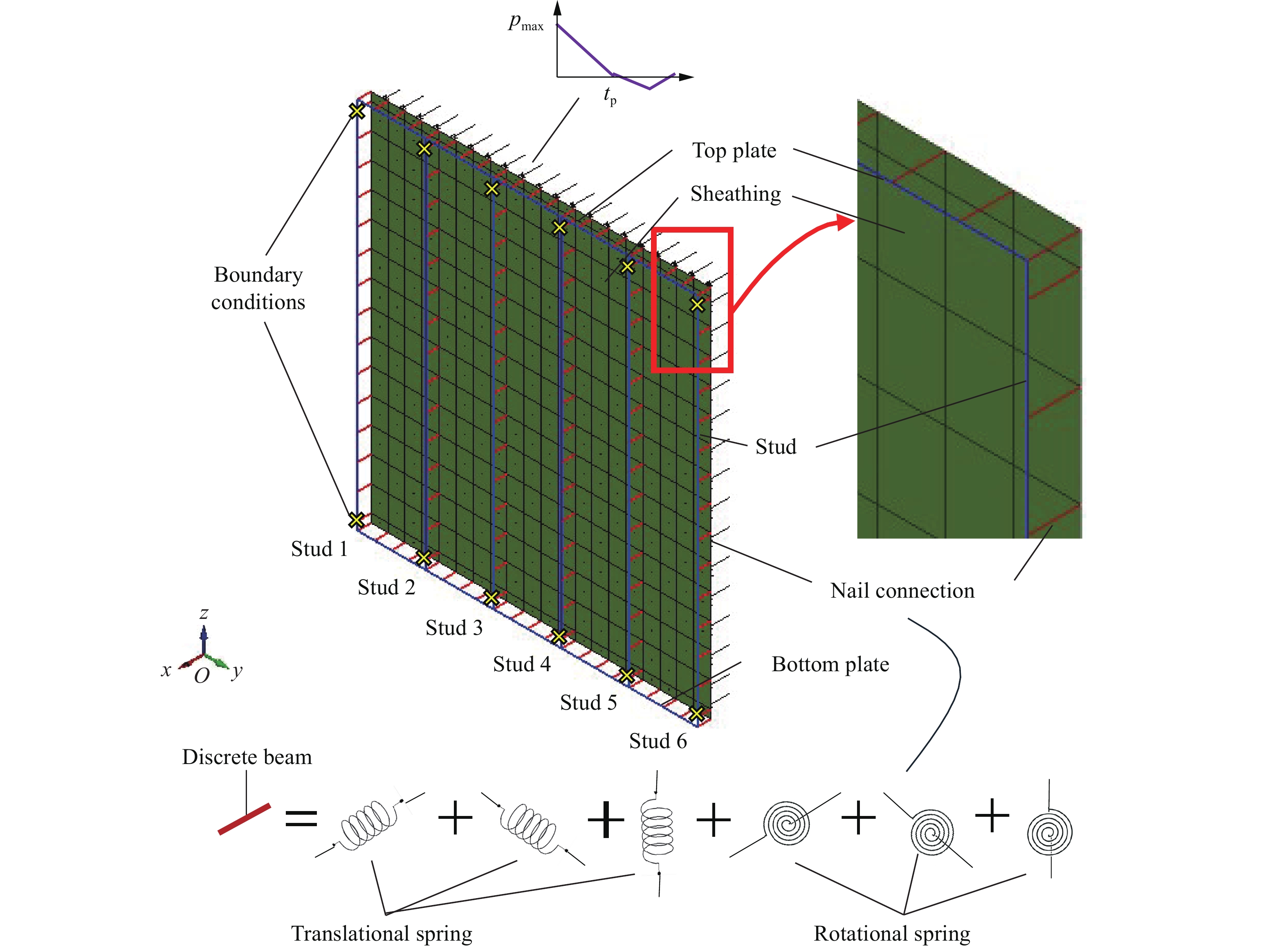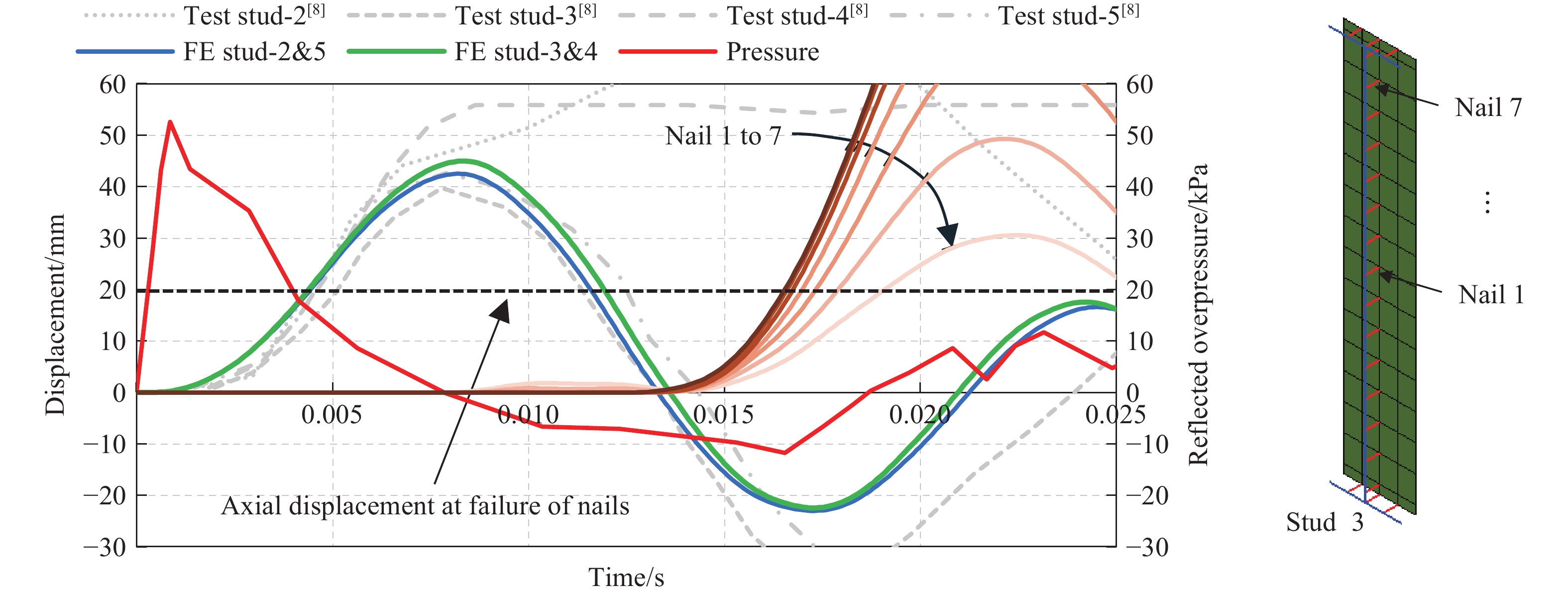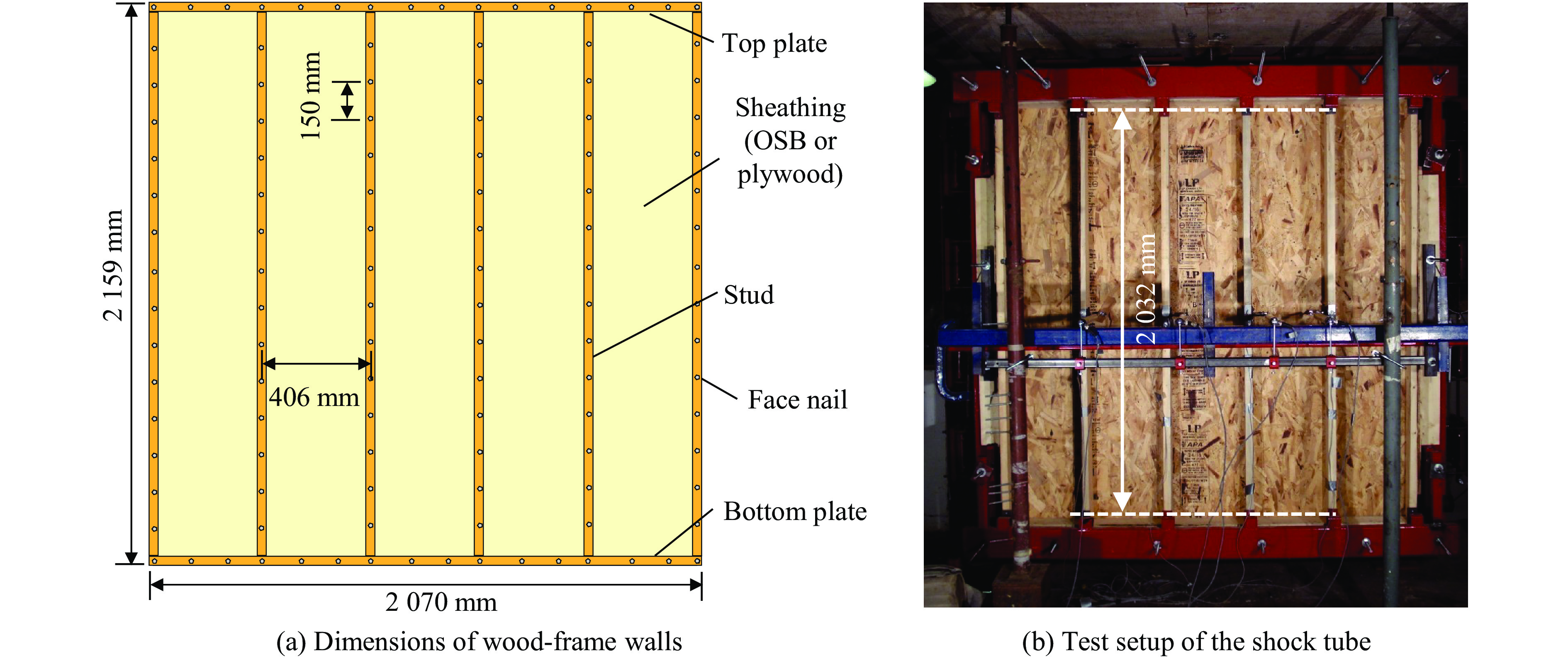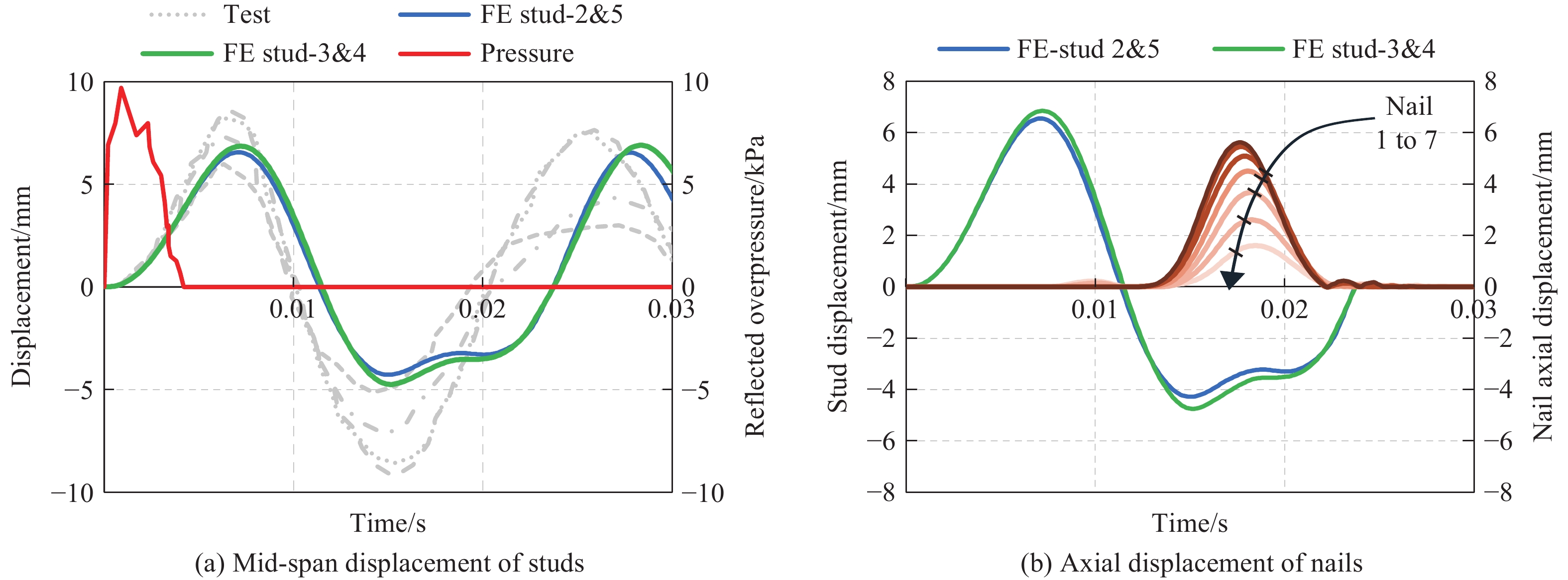 Compared to concrete and steel structures, research on the blast resistance of timber structures is relatively scarce. Although experimental studies on the blast performance of light-frame wood walls have been conducted, relevant numerical studies remain limited. This study addresses the numerical modeling of light-frame wood walls under blast loads, with a focus on the determination of the dynamic increase factor (DIF) for nail connections and the failure criteria for wood studs. Based on the partial composite action theory, an analytical expression was derived to describe the relationship between the DIF for nail connections and other mechanical properties of light-frame wood walls, including the stiffness of studs, the stiffness of sheathing panels, and the stiffness of nail connections. A reasonable value for the DIF of nail connections was provided by introducing experimentally measured DIFs for wood studs and wood-frame walls. On this basis, a finite element (FE) model for blast resistance analysis of light-frame wood walls was developed. In this model, the wood studs, sheathing panels, and nail connections were represented using beam elements, shell elements, and discrete beam elements, respectively. The orthotropic characteristics of wood-based structural panels, the nonlinear dynamic behavior of nail connections, and the dynamic elastic-plastic features of wood studs were also appropriately modeled. Verification of the developed model against experimental data indicates that it can accurately predict the dynamic response of light-frame wood walls under blast loads, as well as the time and corresponding peak displacement when wood studs fracture. FE analyses also show that if the variation of the studs’ material properties is reasonably accounted for, the predictions of the dynamic response and failure mode after the fracture of studs are in good agreement with the experimental results. The developed model paves the way for assessing the blast vulnerability of light-frame wood structures in future research.