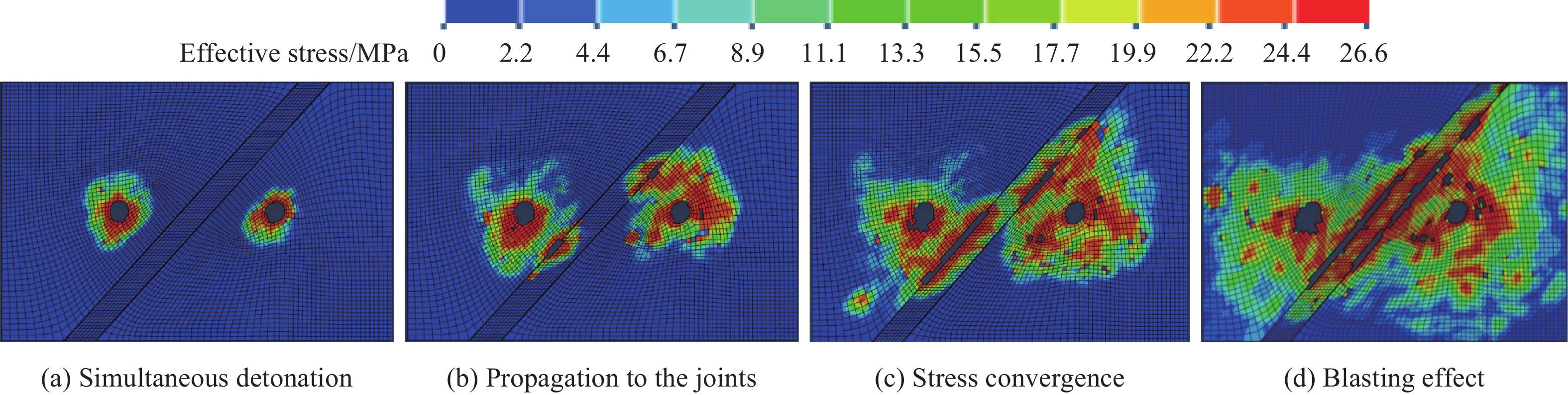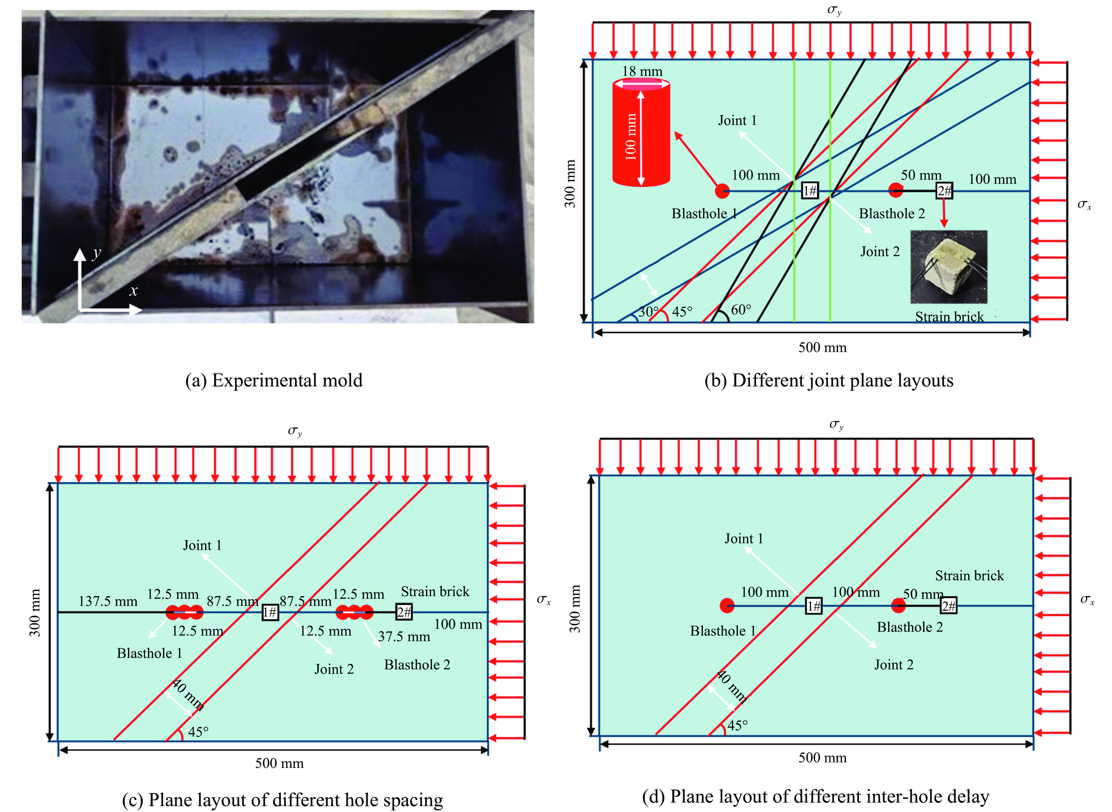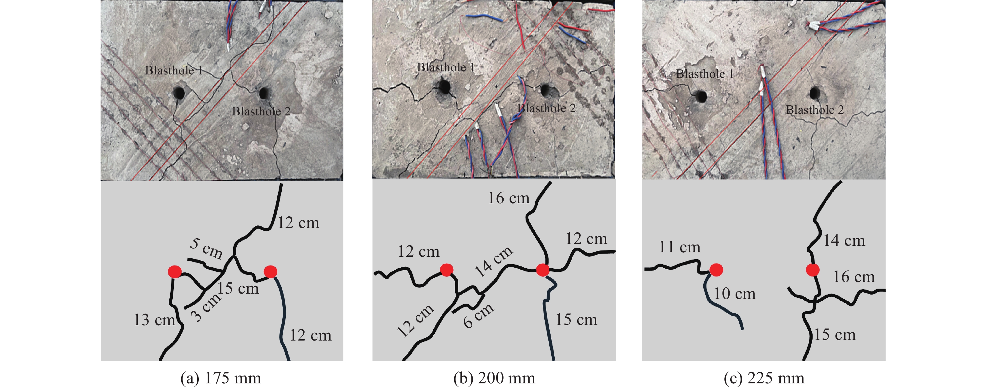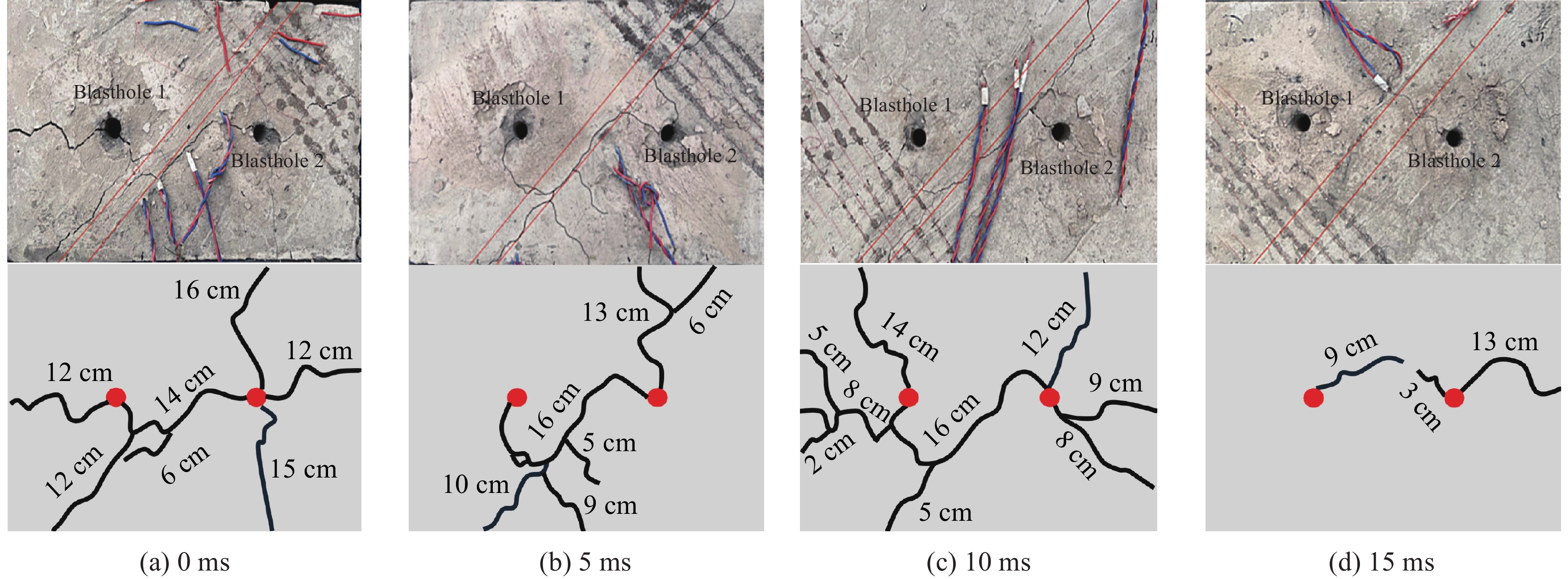 In the construction process of drilling and blasting method for layered rock tunnel, the unbalanced distribution of explosion energy was easy to cause serious over- and under-excavation. The joint dip angle, inter-hole delay, and hole spacing were the main influencing parameters. The simulated rock mass samples with different joint dip angles were prepared by the layered pouring method, and the blasting test of layered rock mass was carried out. Based on the ABAQUS simulation software, the blasting crack propagation and stress wave propagation characteristics of layered rock mass under different joint dip angles were analyzed. The results show that the joint dip angle has a significant guiding effect on the stress wave propagation. By affecting the stress distribution, the peak strain and damage degree at different positions are different, which in turn promotes the crack propagation at the joint surface or around the blast hole. The inter-hole delay plays a key role in regulating the crack propagation path. With the increase of delay time, the stress wave superposition area of the pre-blasting hole and the post-blasting hole gradually shifts from the joint center to the surrounding of the post-blasting hole, resulting in the peak strain and damage value of the joint center increasing first and then decreasing, and the failure area of the rock mass shifts to the post-blasting hole accordingly. However, too long delay weakens the synergistic effect of the double-hole stress wave. The increase of hole spacing weakens the stress superposition in the center of the joint, so that the energy is concentrated around the borehole, and the crack propagation mode changes from joint penetration to radial distribution around the borehole. However, too large a hole spacing is easy to lead to the failure of crack penetration between holes due to insufficient energy attenuation and stress superposition, which significantly reduces the crushing efficiency of rock mass. The research results are helpful to the understanding of blasting crack propagation in layered rock mass.
